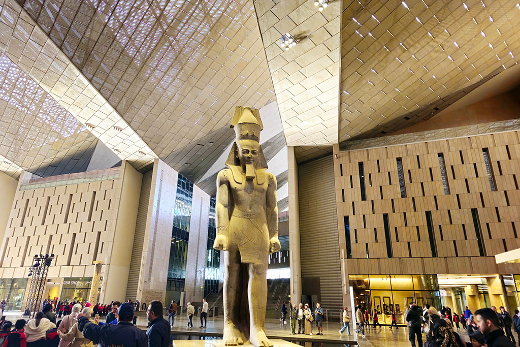 Petit-déjeuner. Transfert à l'aéroport et envol pour Le Caire. À l'arrivée, accueil par notre représentant. Départ pour la visite du Grand Musée Egyptien ouvert en Novembre 2025. Le musée est une véritable caverne d’Ali Baba regroupant plus de 100 000 objets : sarcophages, statues, sphinx, mobiliers, arts décoratifs, momies, collections de bijoux, ainsi que le célèbre trésor de Toutankhamon. Déjeuner en ville. L’après-midi, visite du Caire islamique, la Citadelle de Saladin, la Mosquée de Mohamed Ali. Le Caire, “Ville aux mille minarets”, compte des centaines de mosquées de différentes époques. La Citadelle, bâtie par Saladin à la fin du XIIe siècle, devint la résidence des souverains Ayyubides, puis Mamelouks. Mohamed Ali fit construire, en son enceinte, la mosquée qui renferme son tombeau, dans le style de Sainte-Sophie d’Istanbul. À l’intérieur, l’énorme lustre, les dorures, les tapis, les panneaux d’albâtre dont la mosquée est entièrement recouverte composent un décor somptueux. Temps libre pour le shopping dans le souk de Khan El Khalili. Dîner et nuit à l’hôtel.
