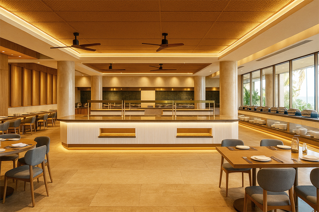 - Le restaurant buffet principal vous invite à prendre l’ensemble de vos repas avec une fusion de cuisine internationale légère et savoureuse et de plats locaux.