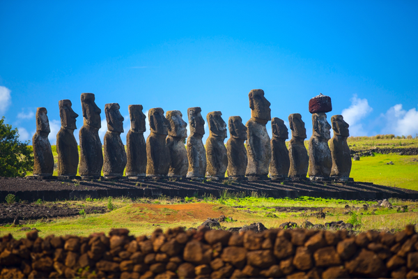 Petit-déjeuner. Vous consacrerez la journée à la découverte des sites archéologiques les plus emblématiques de Rapa Nui. La visite commencera par l'Ahu Vaihu (huit moaï renversés) et l'Ahu Akahanga (nécropole présumée du roi Hotu Matu’a). Le point fort sera l'Ahu Tongariki, la plateforme la plus impressionnante avec ses 15 moaï restaurés alignés face à l'océan. Vous visiterez ensuite Te Pito Kura, connu comme le "nombril du monde" et pour son moaï de grande taille.