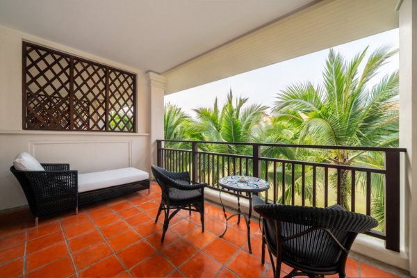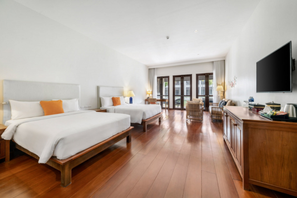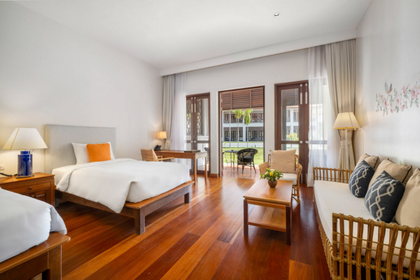 La chambre Grand Deluxe offre un espace généreux, décoré dans un style thaïlandais contemporain mettant en valeur des matériaux naturels. D'une superficie d'environ 73 m², elle dispose d'un balcon, idéal pour se détendre en profitant de la vue sur les jardins. À l'intérieur, la chambre est dotée d'un lit king-size (ou de deux lits simples), d'un coin salon, de la climatisation, d'un coffre-fort, d'un minibar et d'un plateau de courtoisie (thé/café).