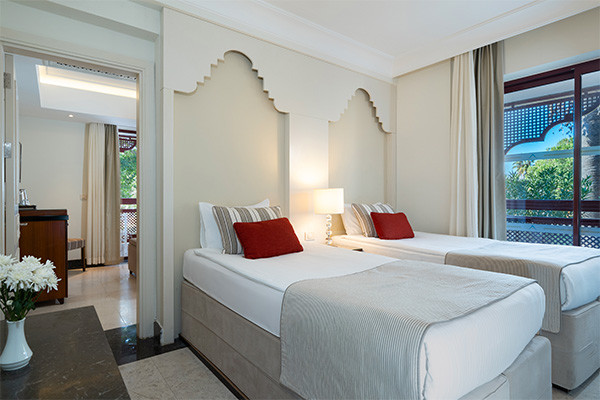 - Chambre familiale supérieure (40 m²) : 2 chambres séparées par une porte (1 lit double et 2 lits simples). Capacité maximale : 4 adultes.