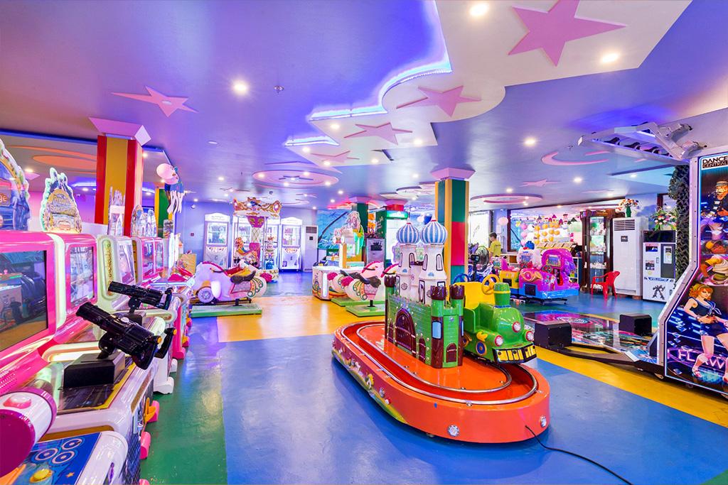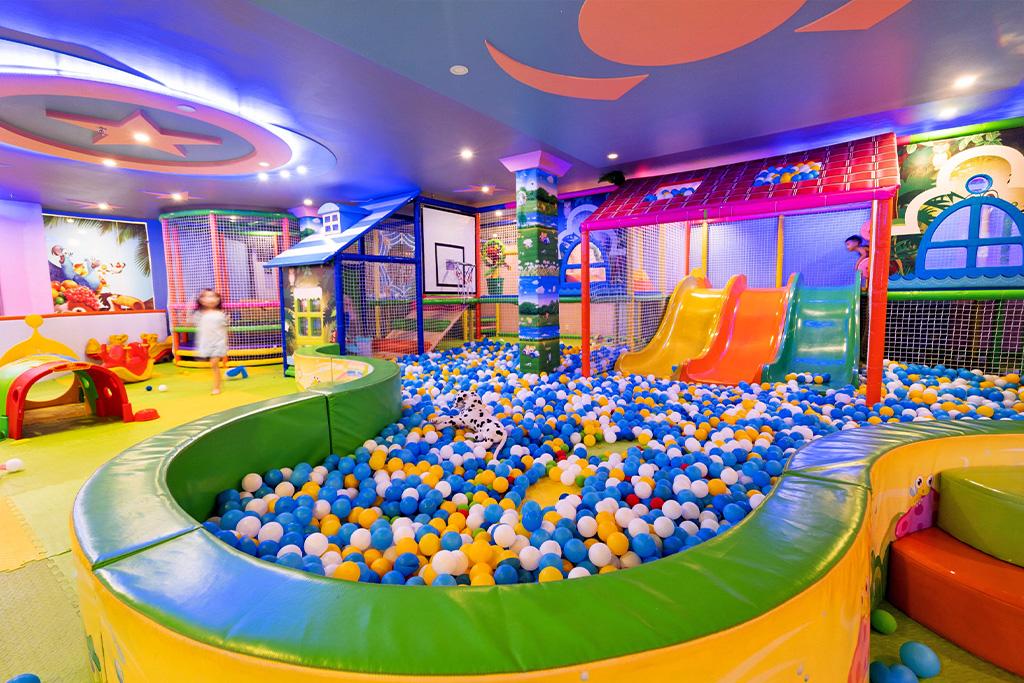 - Espace de jeux pour les enfants avec petits toboggans et piscine à balles, jeux électroniques, aire de jeux en plein air