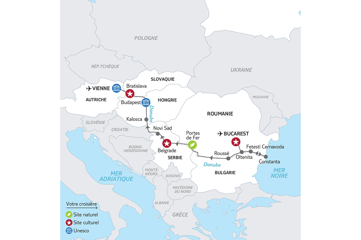 Embarquez pour une odyssée inoubliable sur le majestueux Danube, le fleuve légendaire qui relie les curs de lEurope. De la Mer Noire à Vienne, laissez-vous porter au fil des eaux qui traversent 8 pays et relient 4 capitales emblématiques. Entre cités impériales et paysages préservés, cette croisière vous dévoilera des trésors insoupçonnés : châteaux baroques, forteresses séculaires et monastères nichés au creux de vallées verdoyantes. De Bratislava à Belgrade, en passant par les Portes de Fer et les rives enchantées de la mer Noire, vivez un voyage au carrefour des cultures, entre histoire fascinante et nature grandiose.