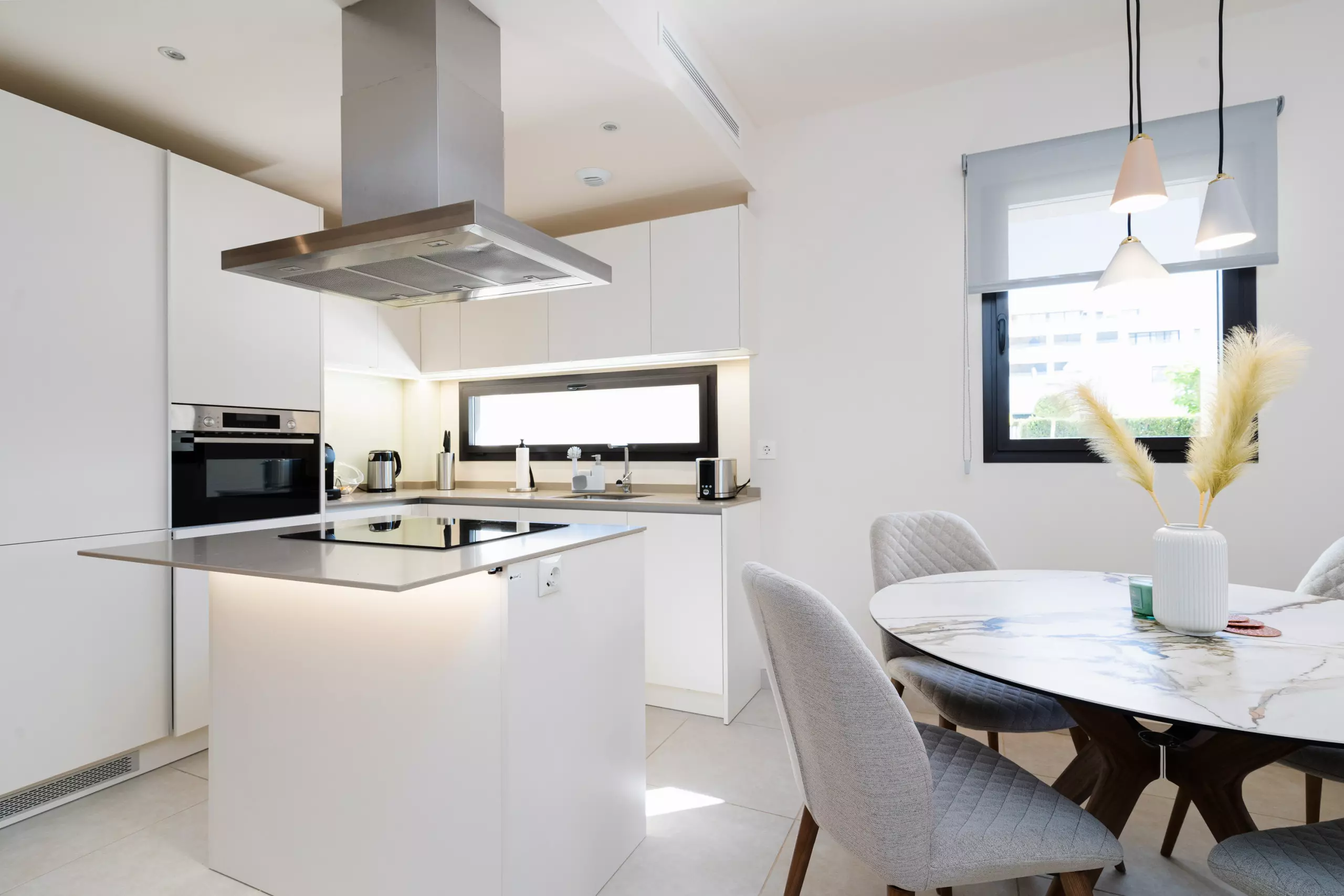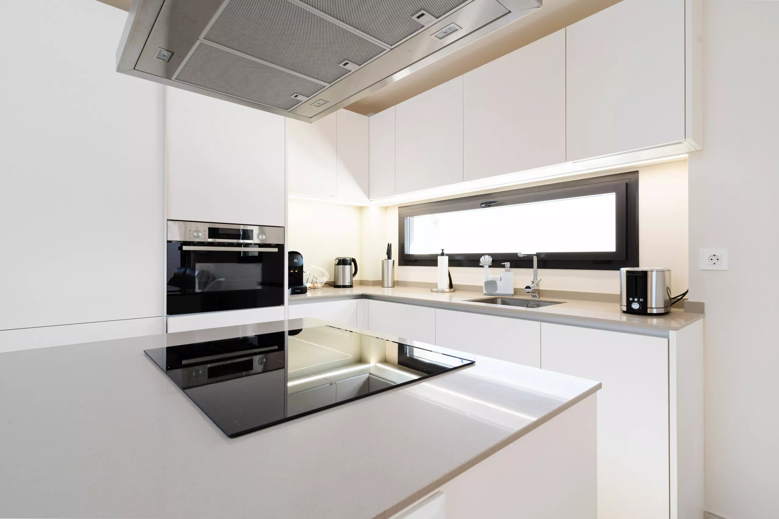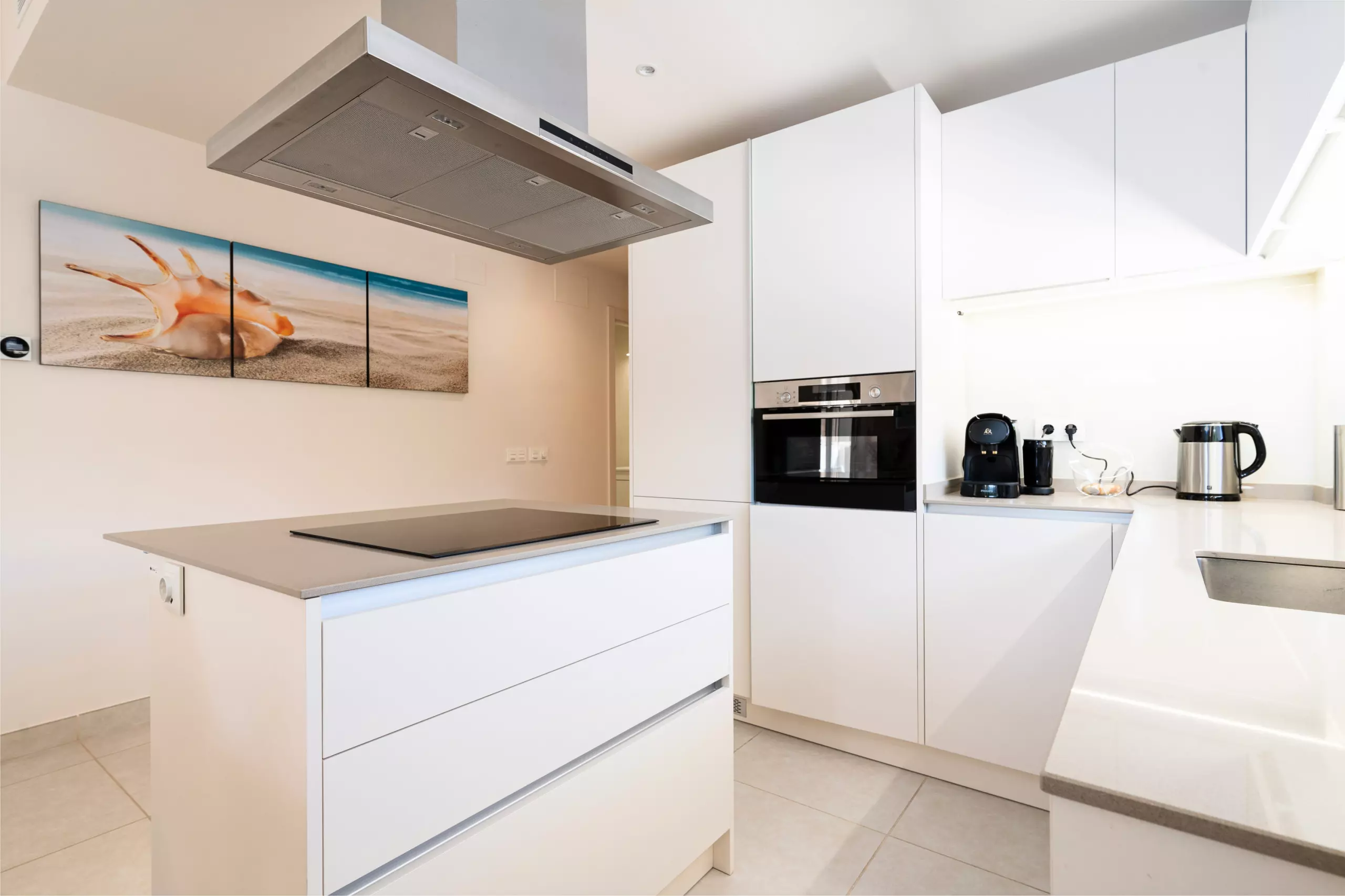 L'appartement dispose d'une cuisine ouverte à induction bien équipée, comprenant un réfrigérateur, un four micro-ondes, un four, un congélateur, un lave-linge, un lave-vaisselle et un ensemble complet de vaisselle, couverts et ustensiles de cuisine. De plus, il y a une machine à café, un grille-pain et une bouilloire, garantissant que vous disposez de tous les outils nécessaires pour préparer des repas et des boissons selon vos préférences. En plus des fournitures de cuisine mentionnées, cette location comprend également un système de filtre à eau pratique.