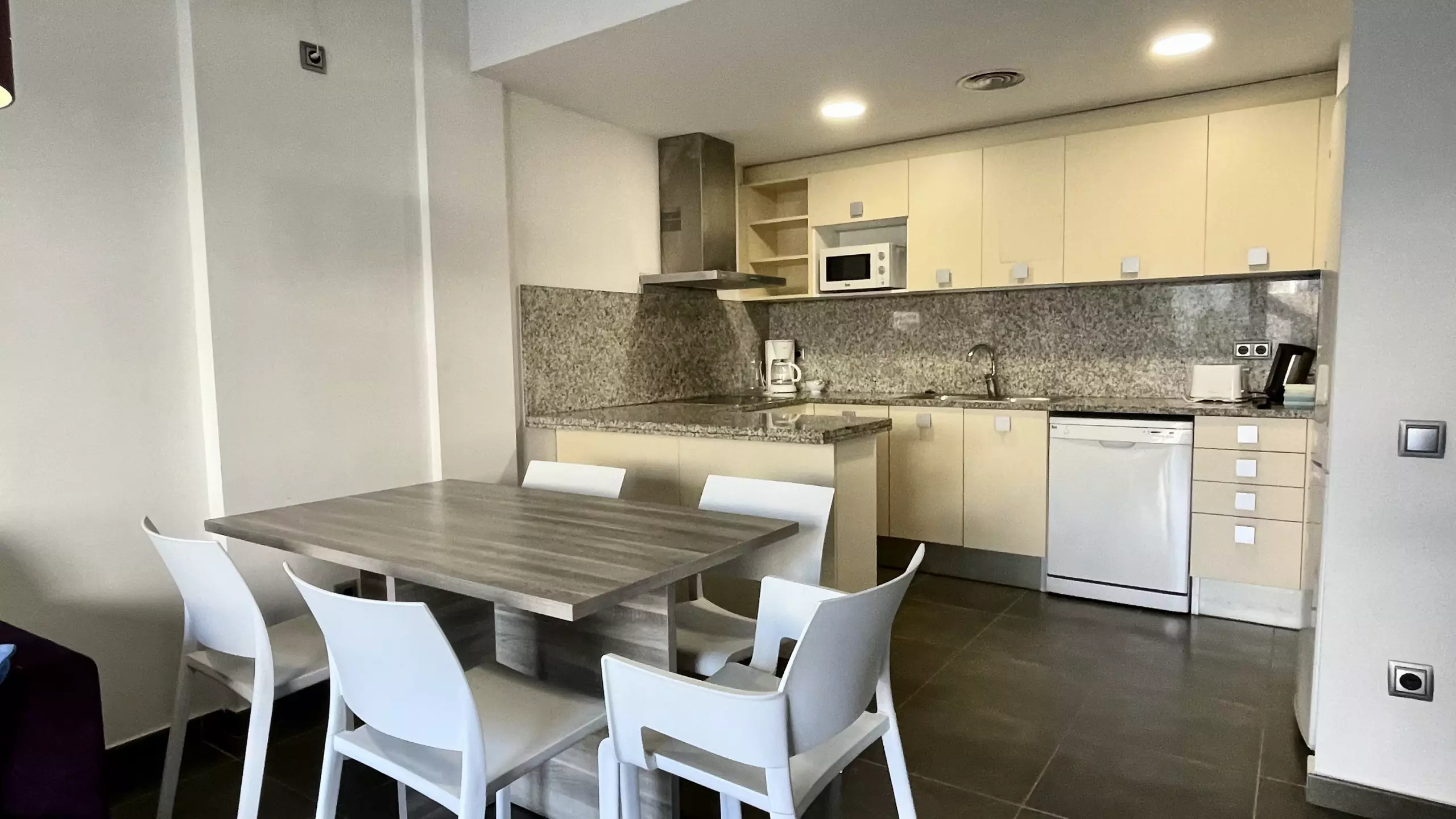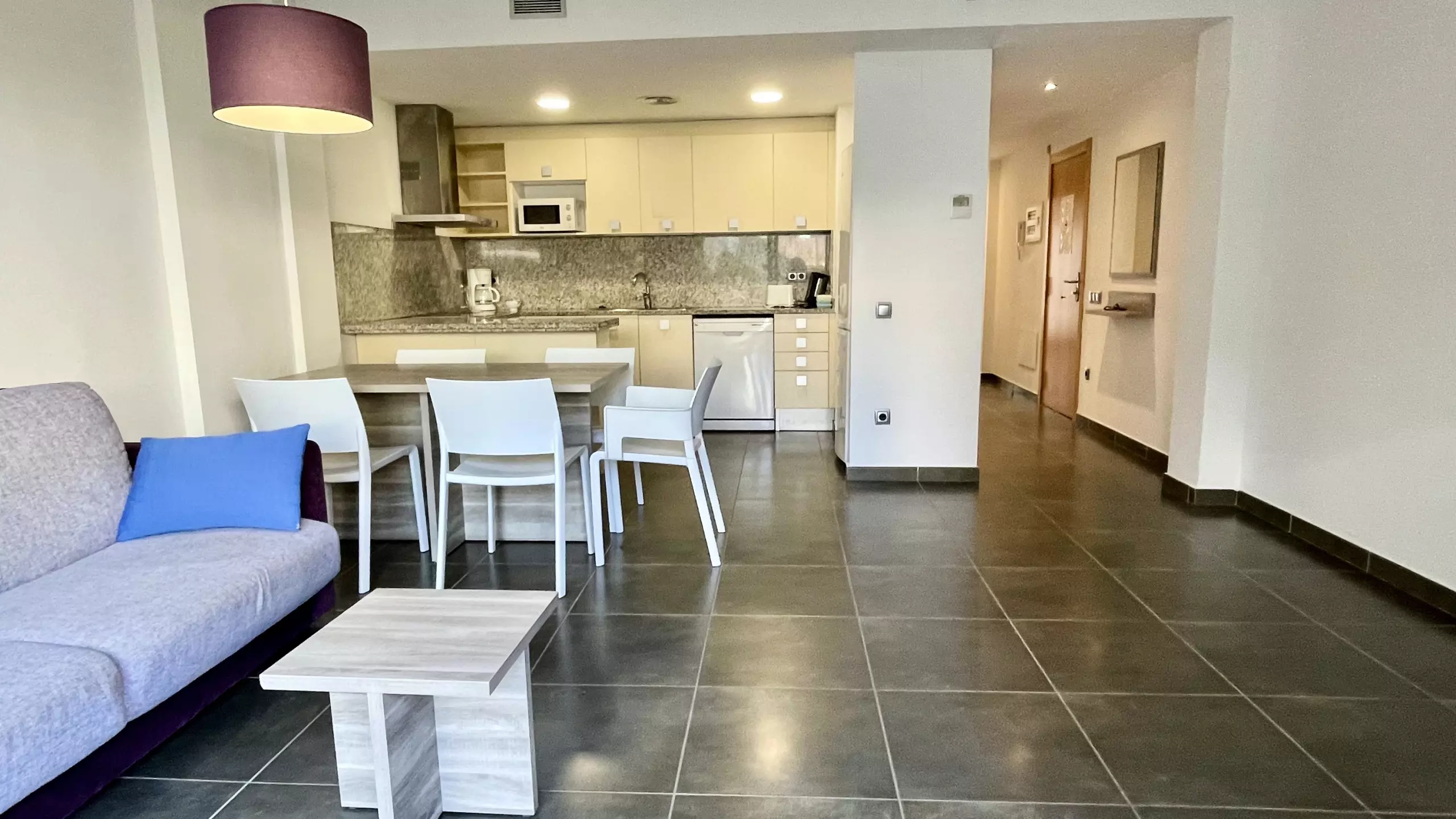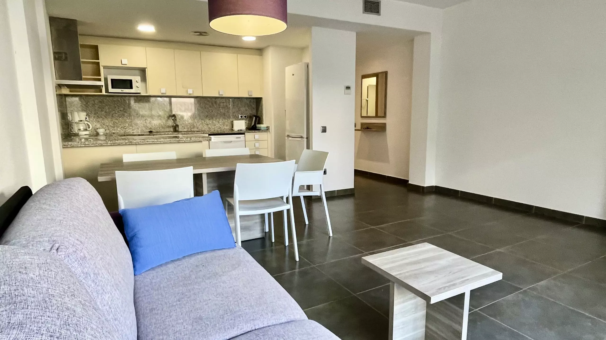 L'intérieur est entièrement équipé pour rendre votre séjour le plus confortable possible. Il dispose de deux chambres avec trois lits : un lit double, un canapé-lit et un lit individuel. La cuisine américaine est entièrement équipée d'appareils électroménagers modernes tels que lave-vaisselle, four, micro-ondes, cafetière et tous les ustensiles nécessaires pour préparer des repas familiaux.