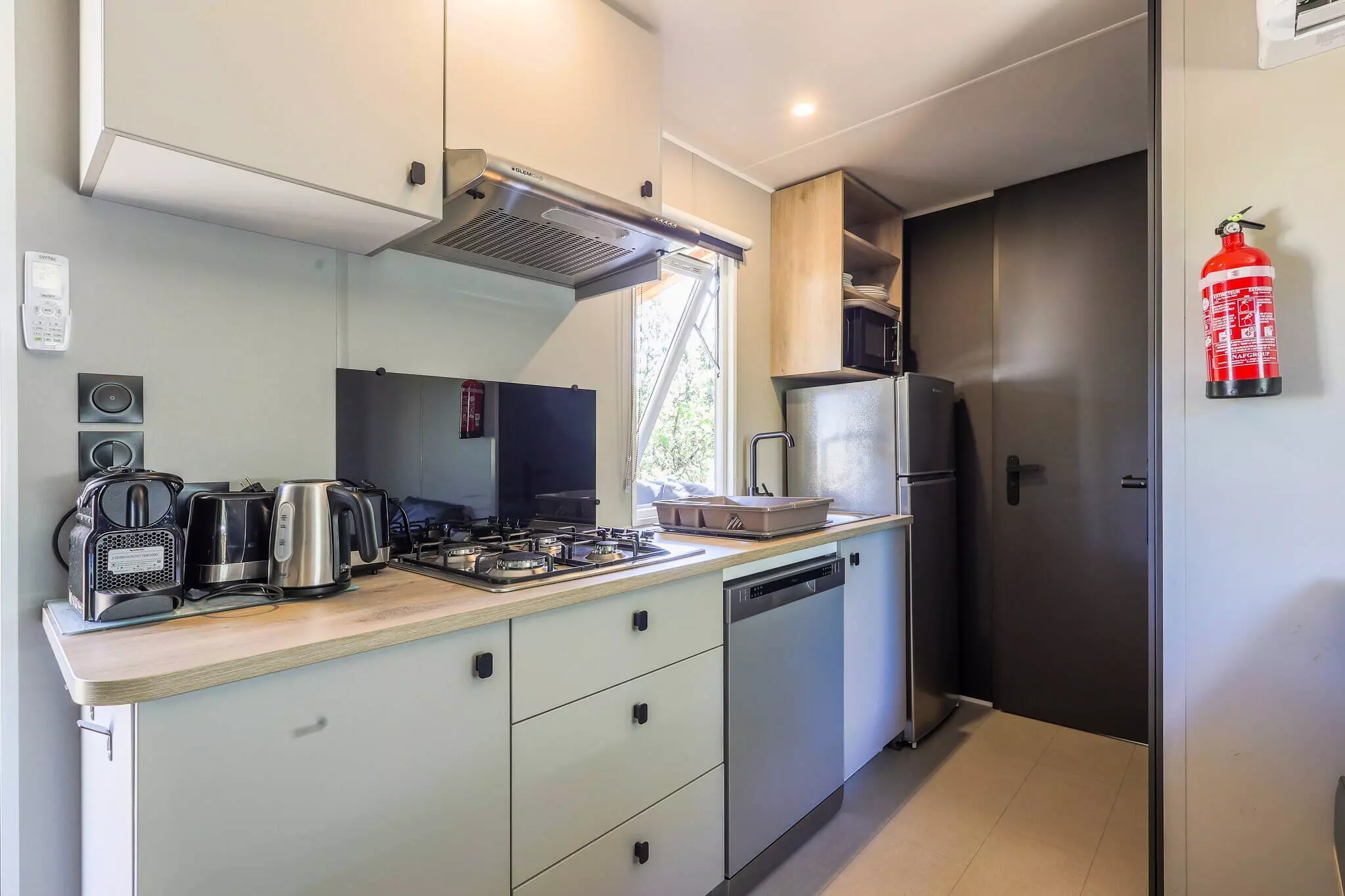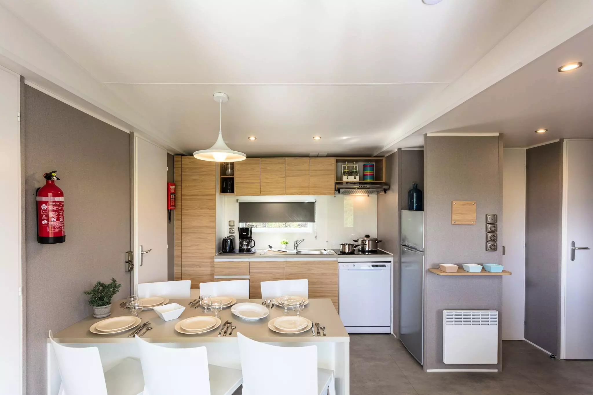 - Séjour / coin cuisine : Banquette, Bouilloire, Cafetière électrique (filtre), Cuisine équipée, Evier, Grille-pain, Lave-vaisselle, Micro-ondes, Plaques de cuisson 4 feux électriques ou gaz, Réfrigérateur avec freezer, Table et chaises