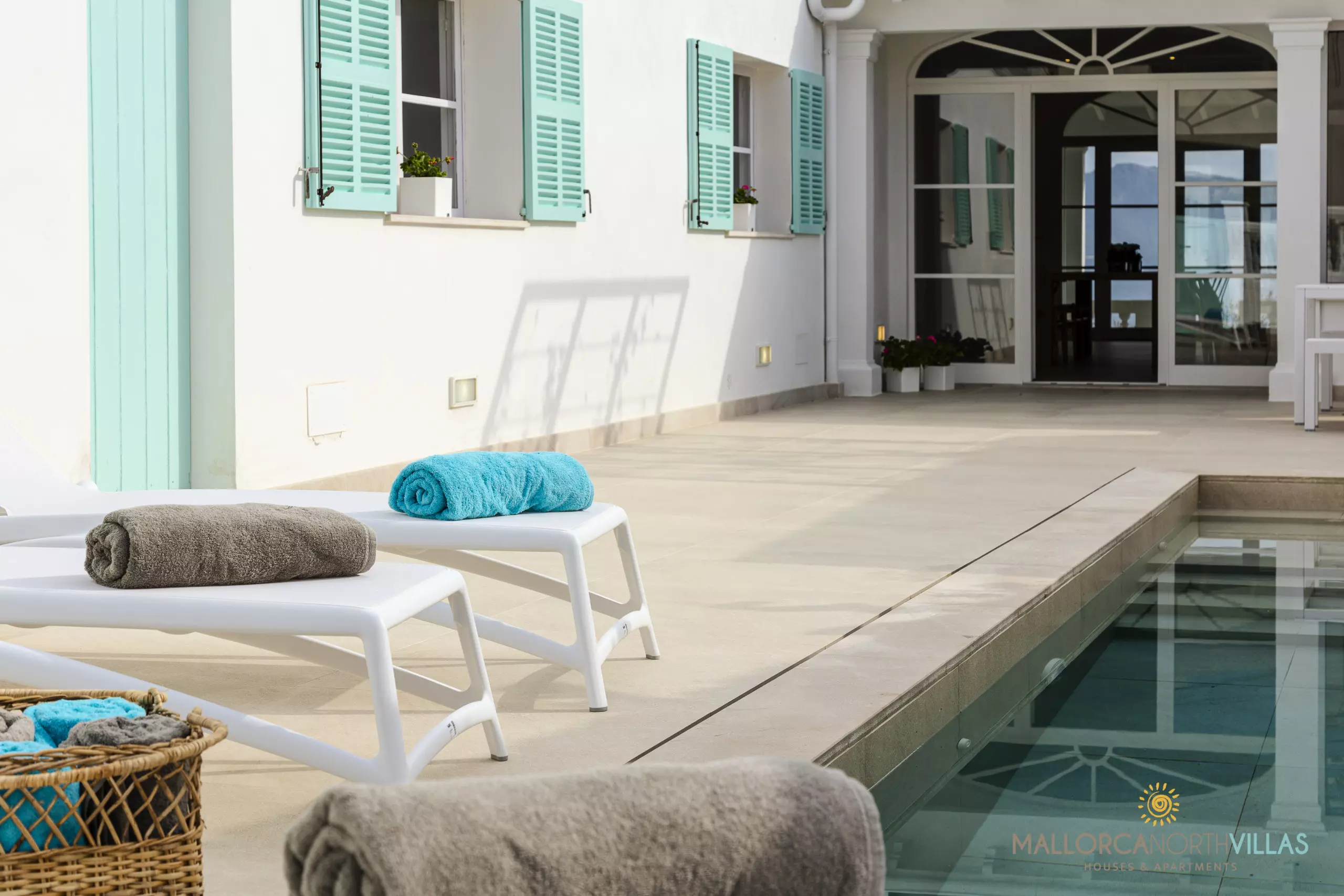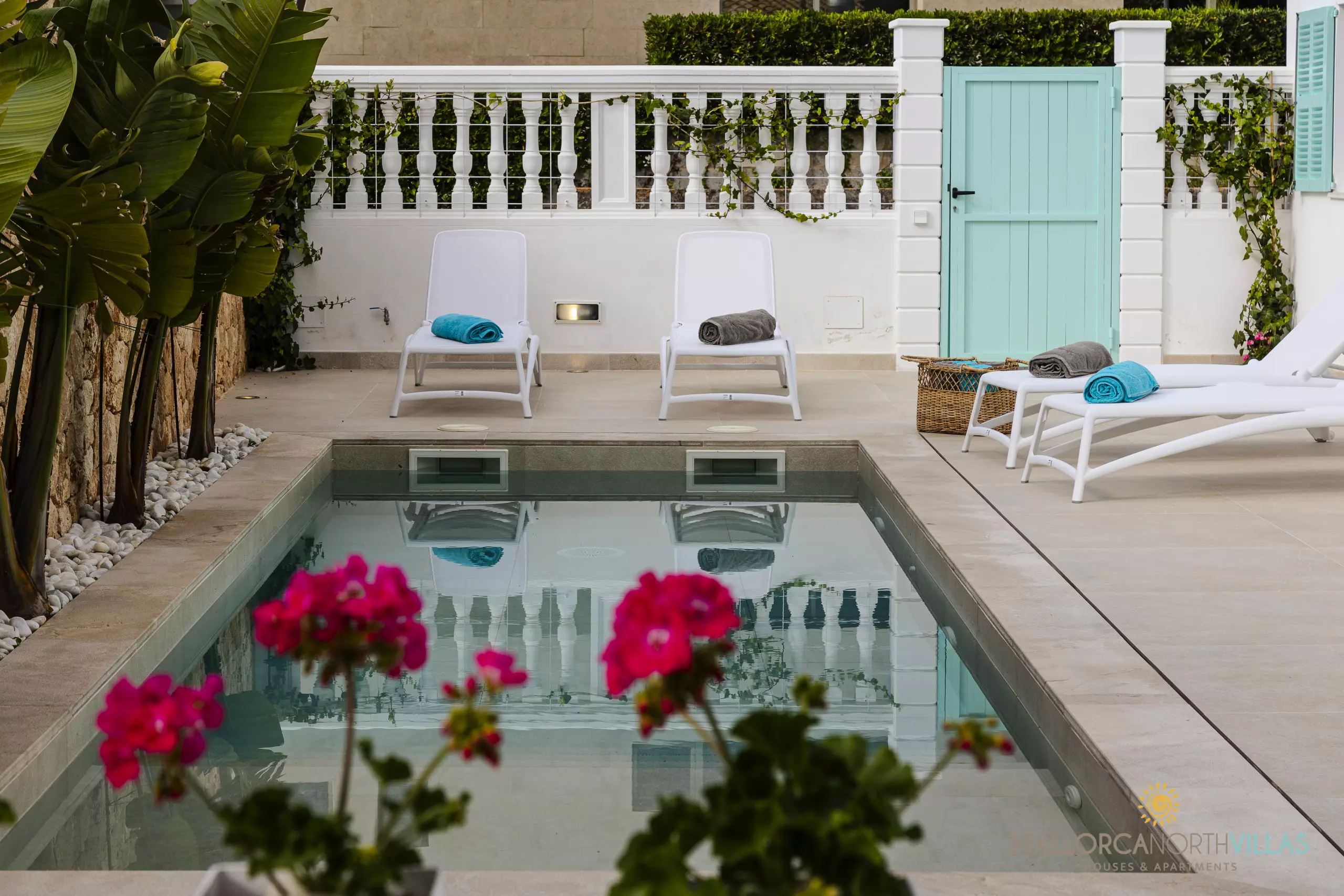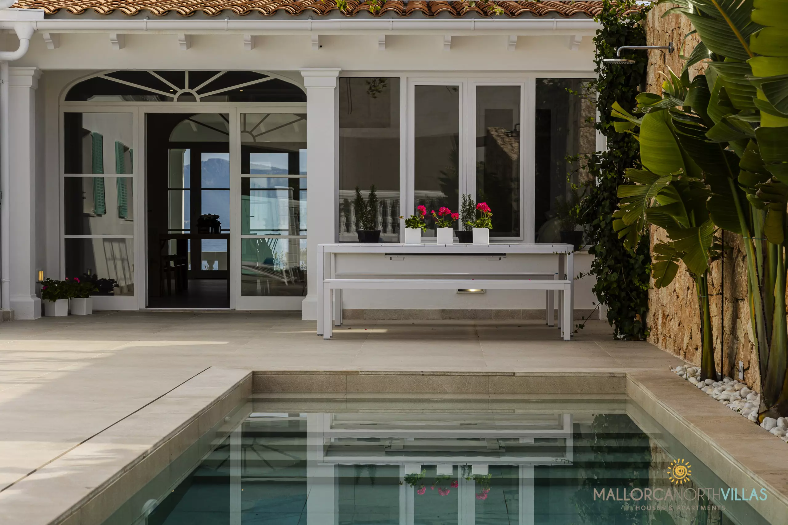? Patio intérieur avec piscine privée entourée de chaises longues, un véritable havre de paix.
