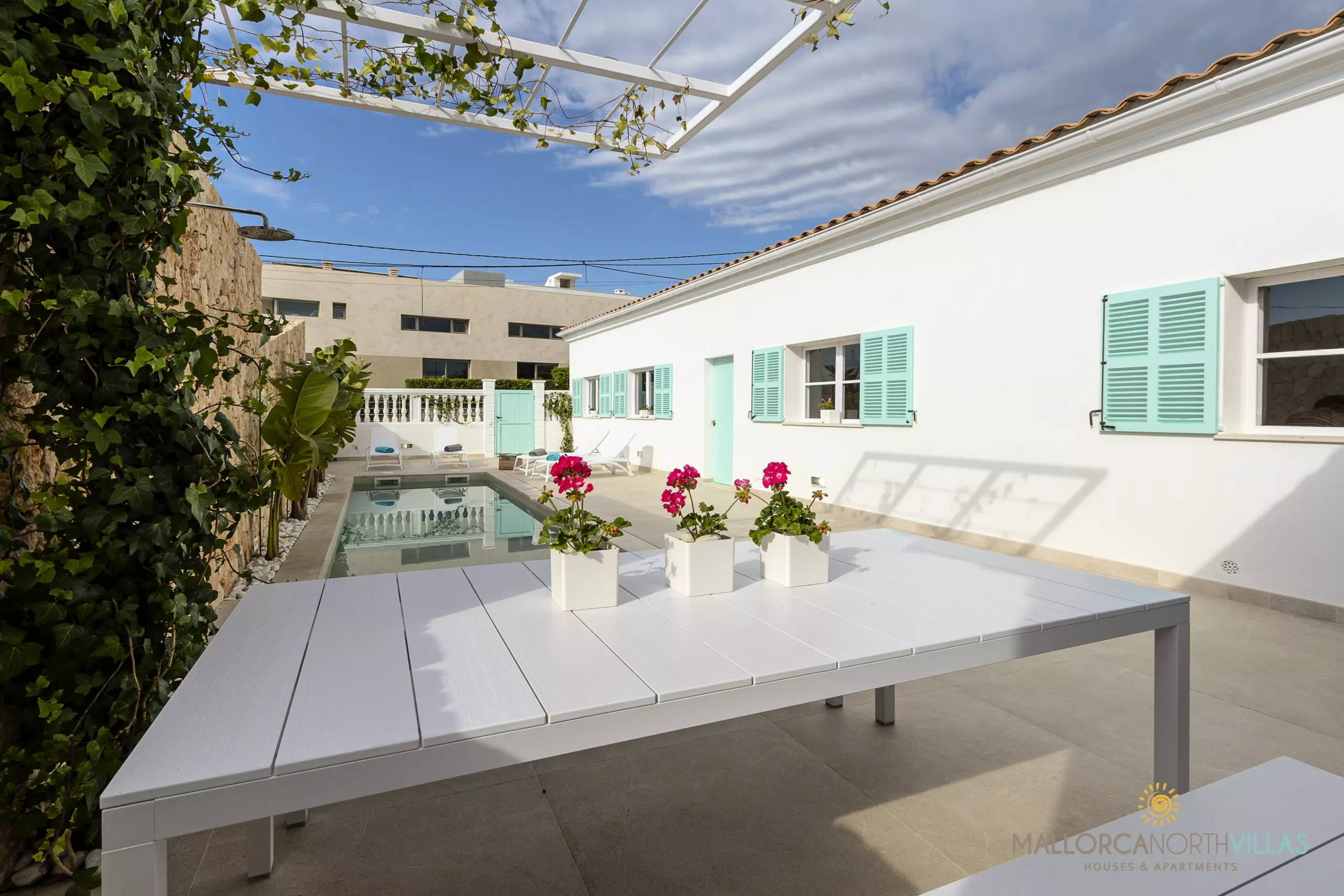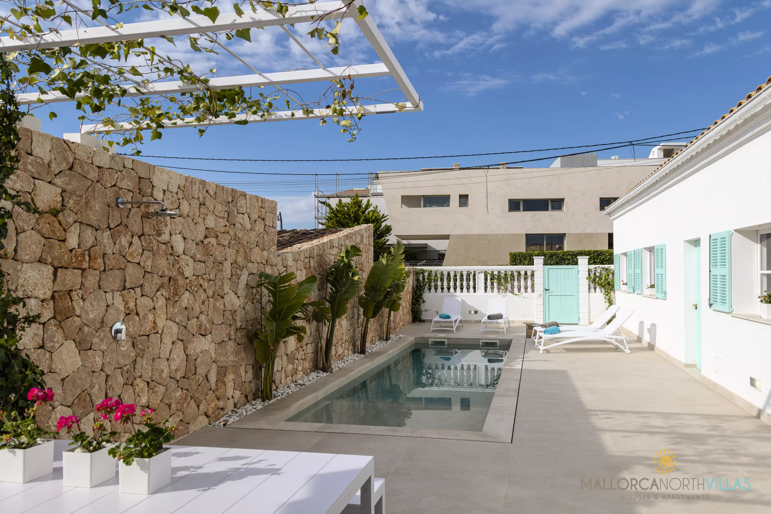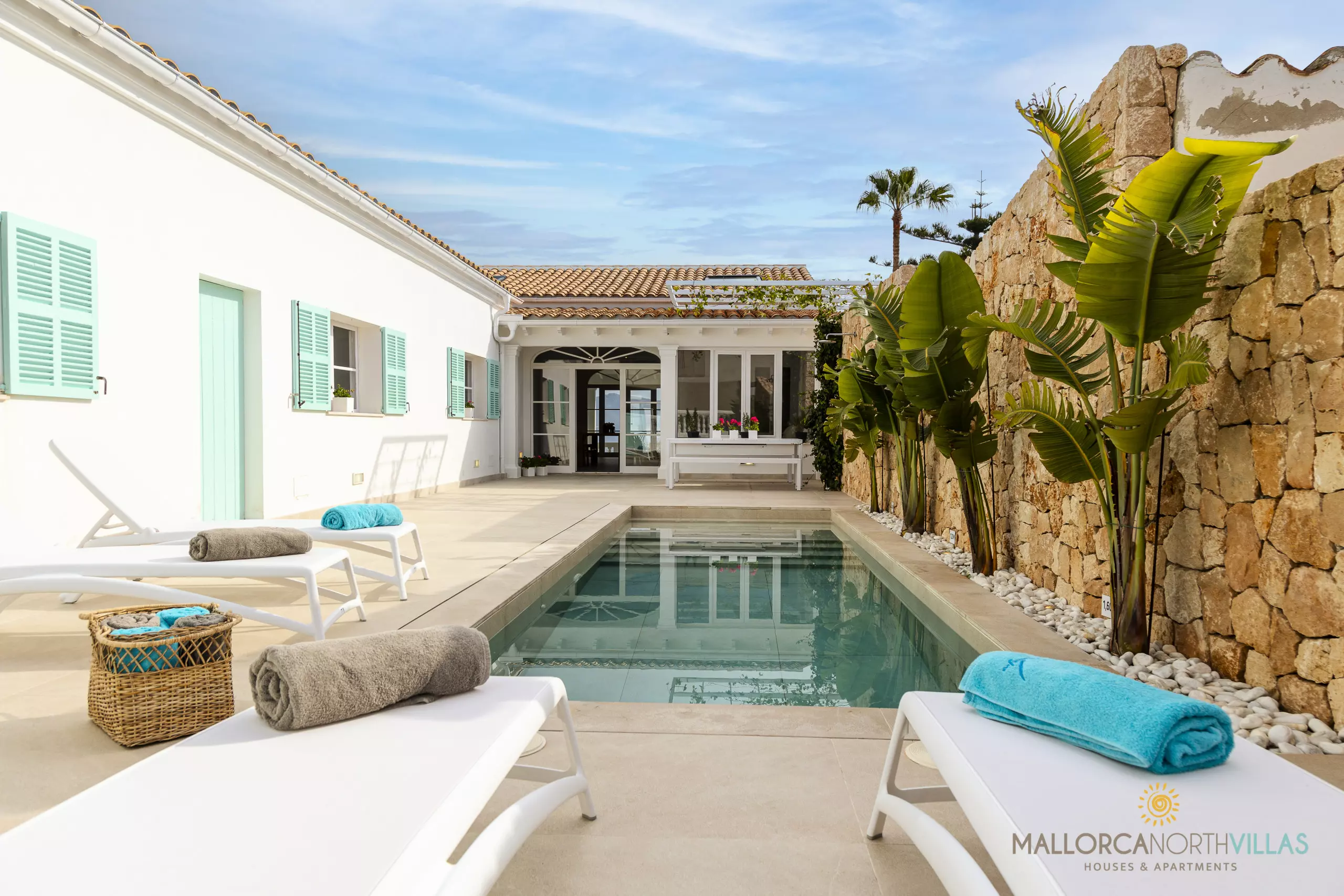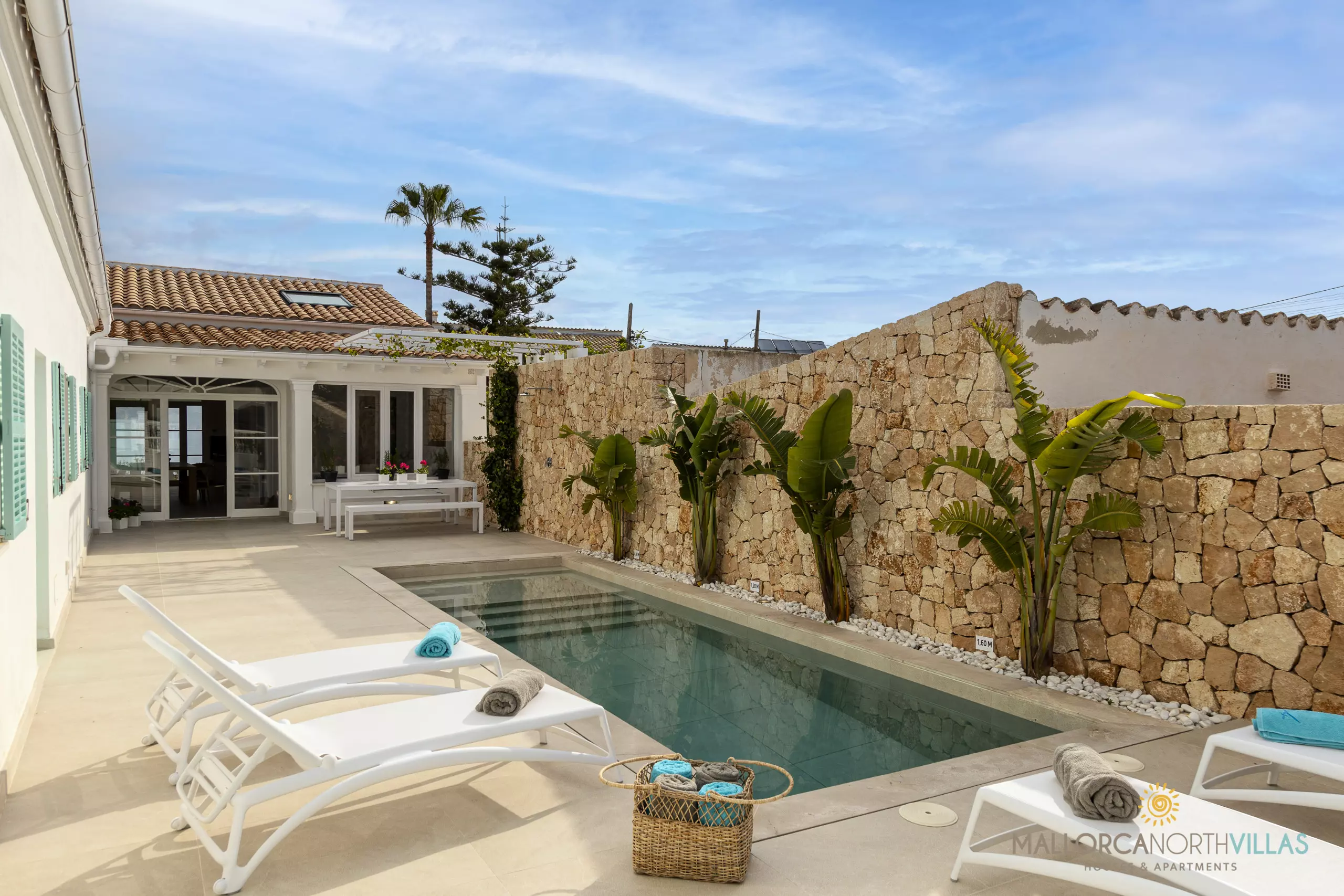 ? Patio intérieur avec piscine privée entourée de chaises longues, un véritable havre de paix.