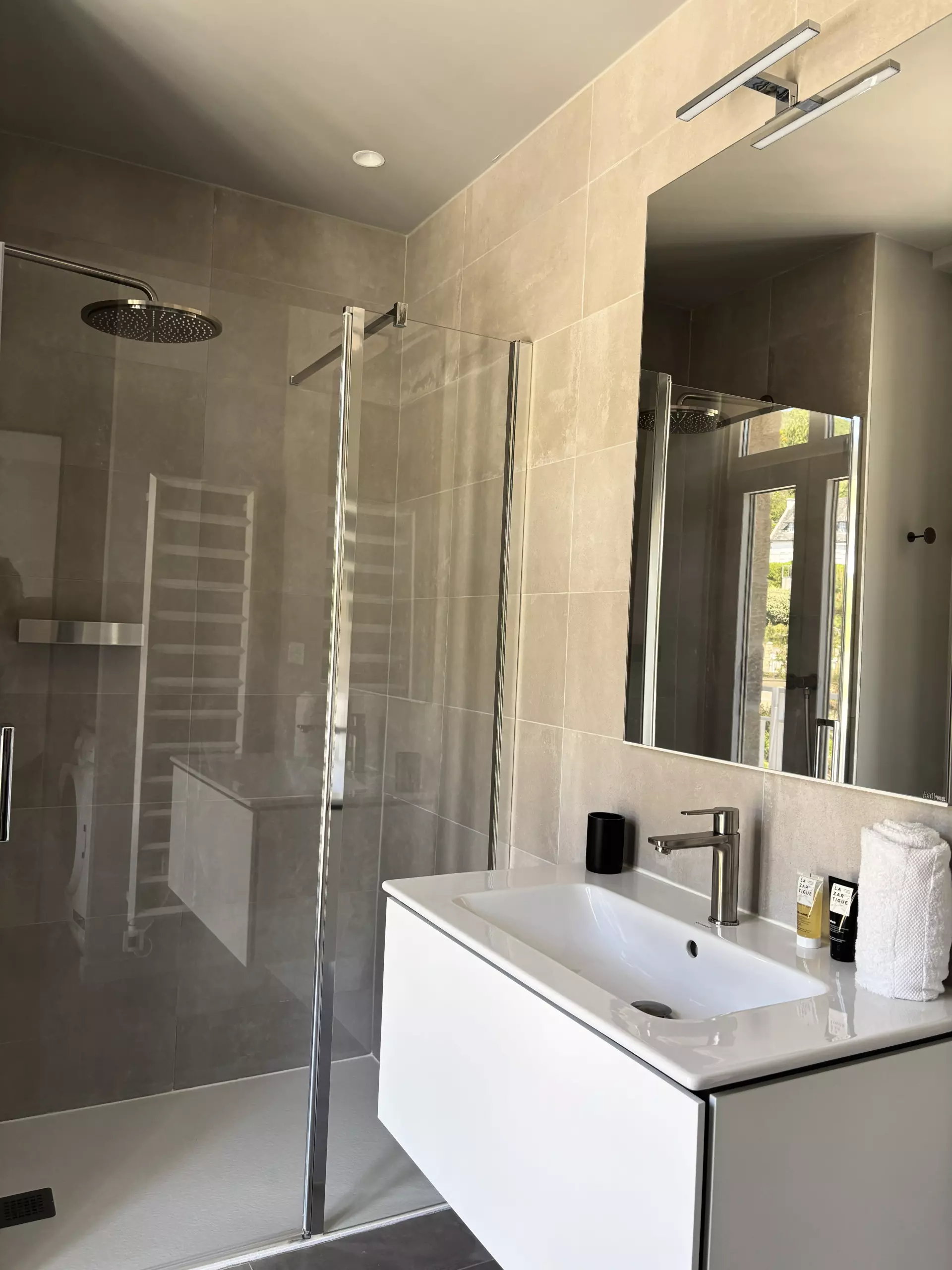 - Cuisine moderne et entièrement équipée : four, plaques à induction, lave-vaisselle, réfrigérateur, machine à laver séchante, cafetière Nespresso...
