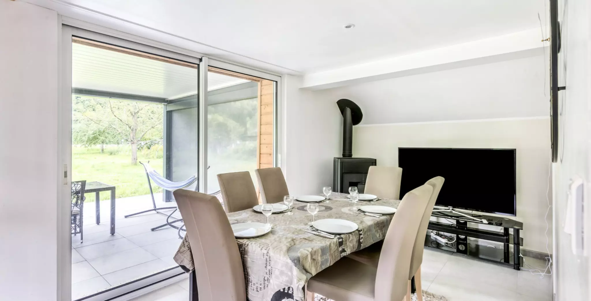 Pièce à vivre de 25 m² : un espace convivial avec canapé-lit, télévision, et coin repas.