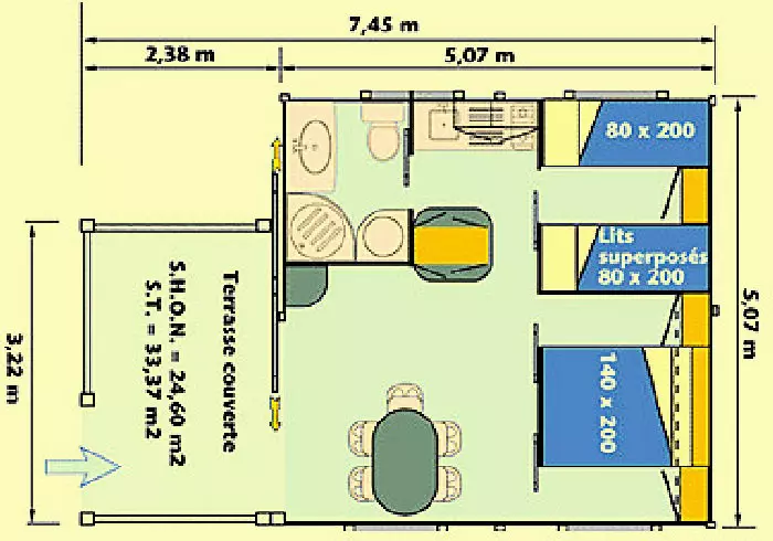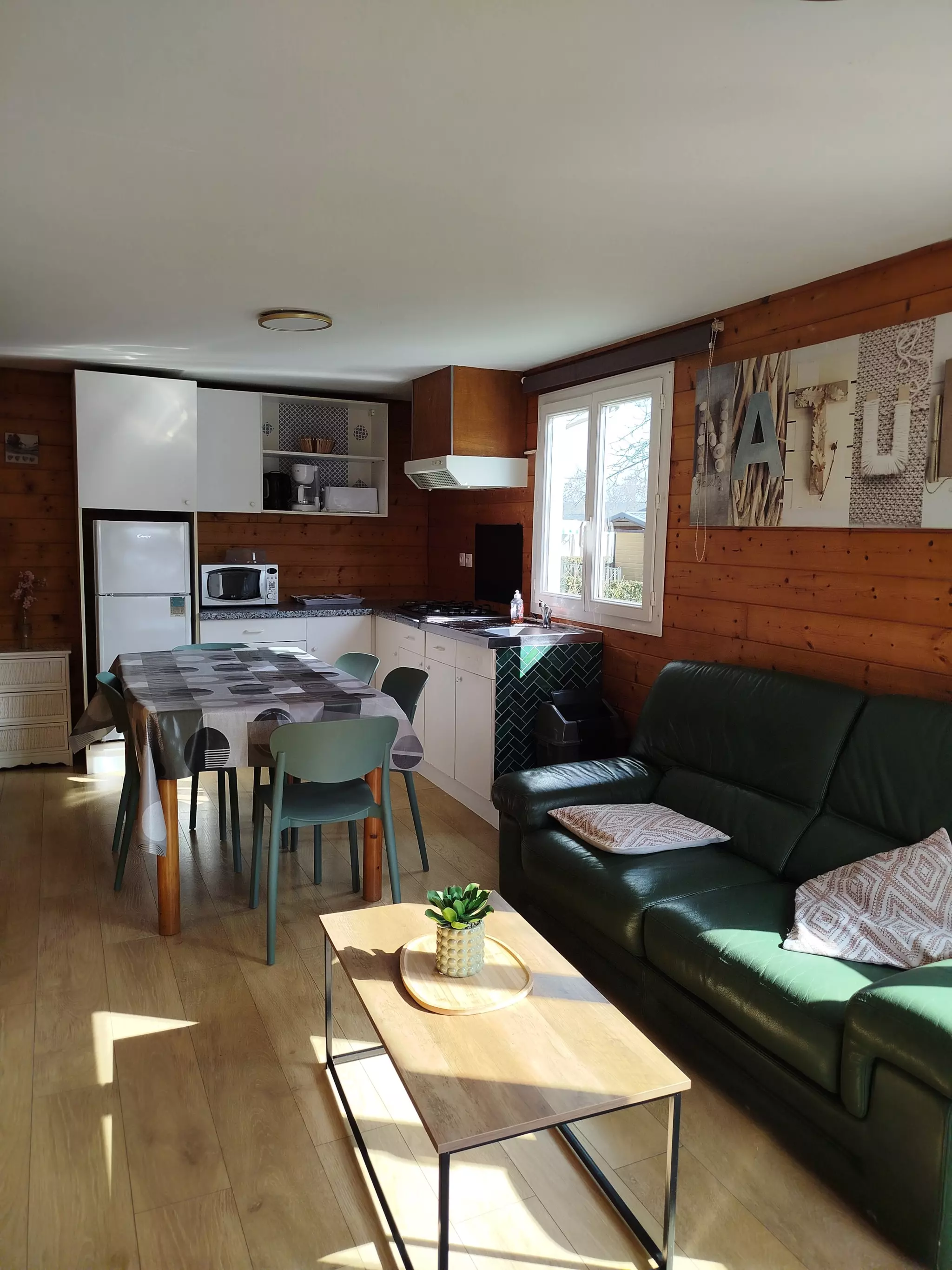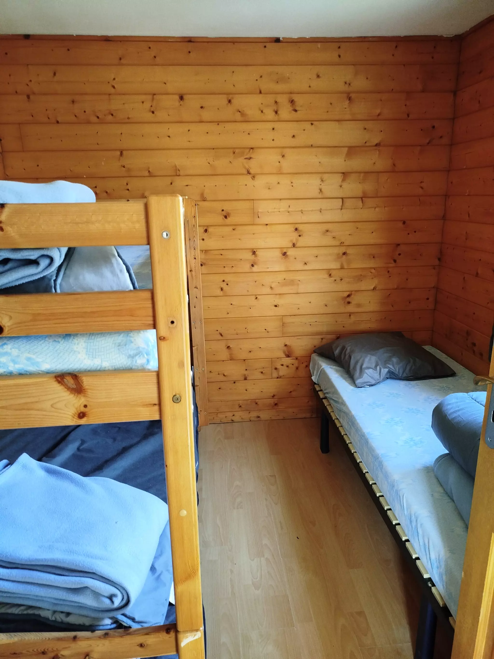 Chalet pour 4/5 personnes comprenant : cuisine, salle de bain, télévision, 1 lit 2 personnes, 1 lit 1 personne, 1 lit superposé, terrasse couverte.