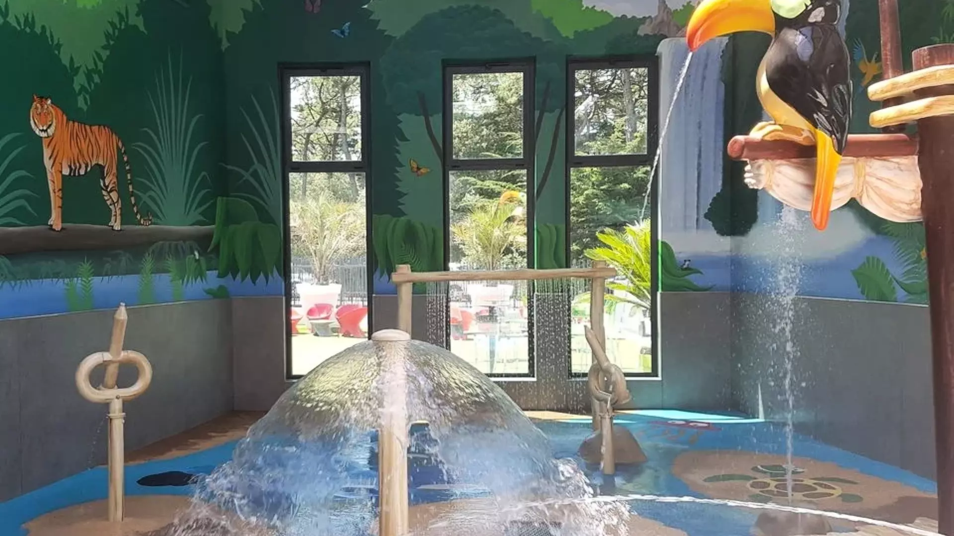 - Espace aquatique couvert chauffé avec rivière à contre-courant, bains bouillonnants, toboggans, pataugeoire et équipements balnéo