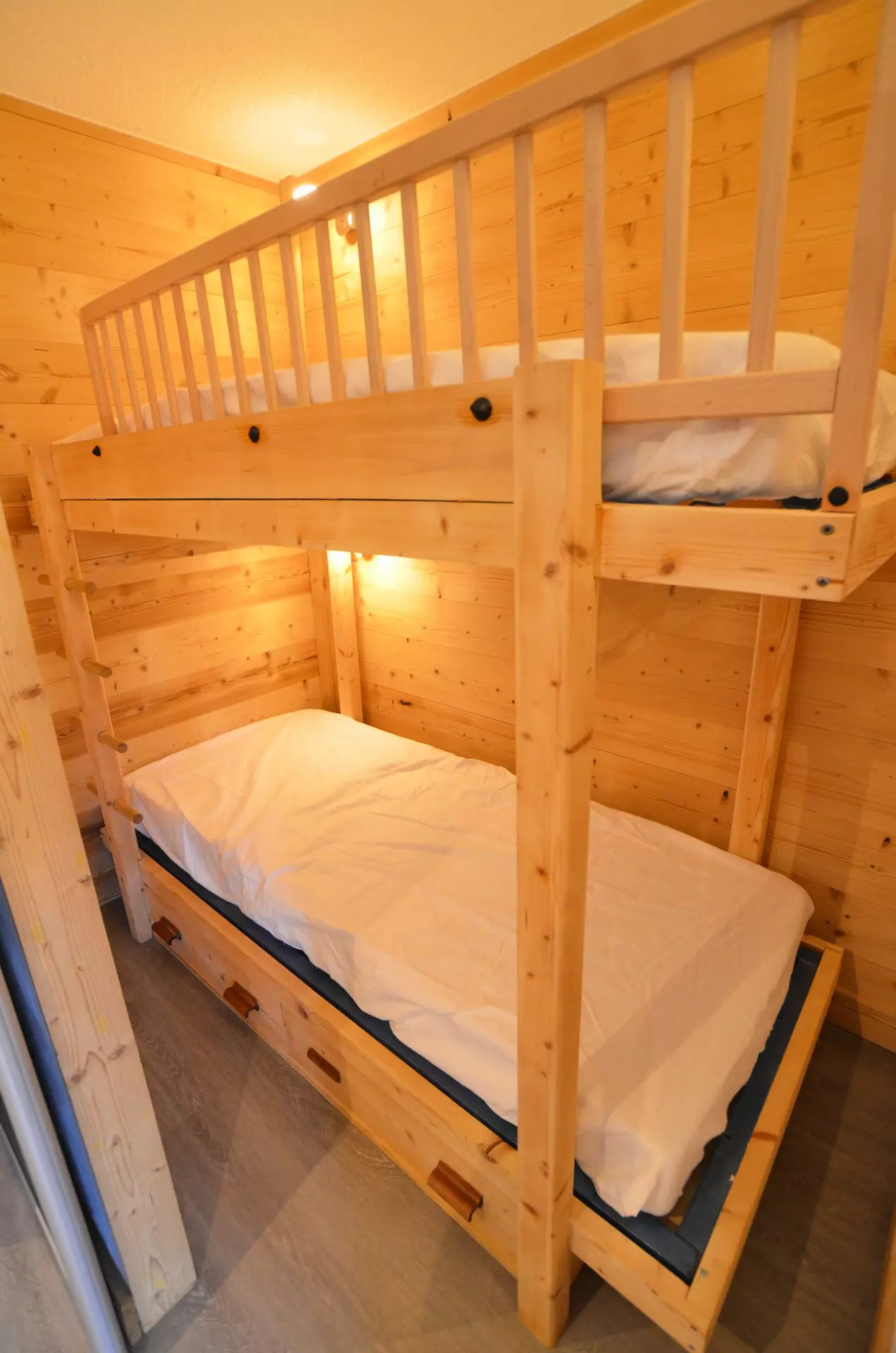 Il est composé d'un séjour avec un lit double rabattable, un coin cuisine, une cabine fermé avec 2 lits superposés.