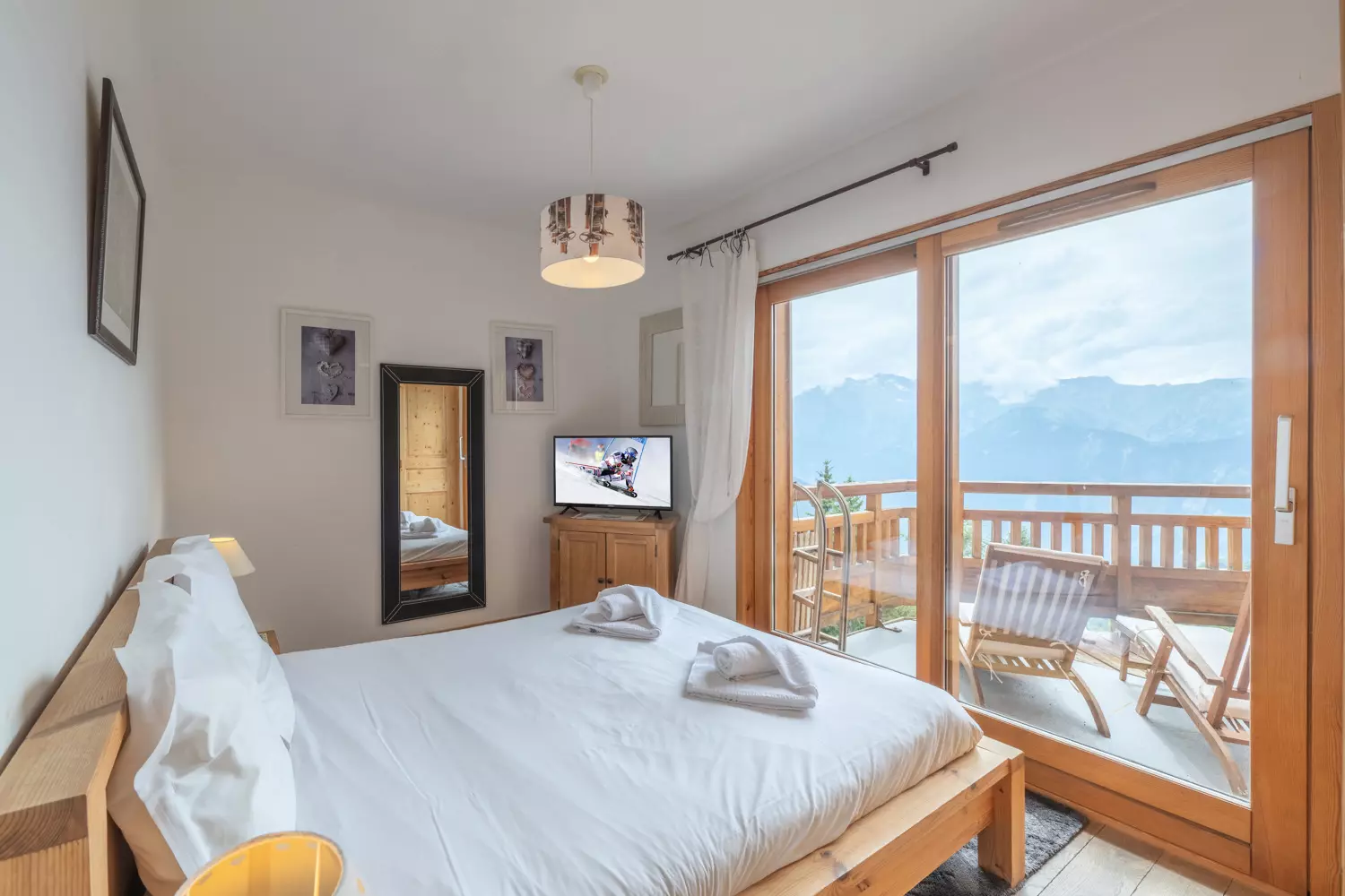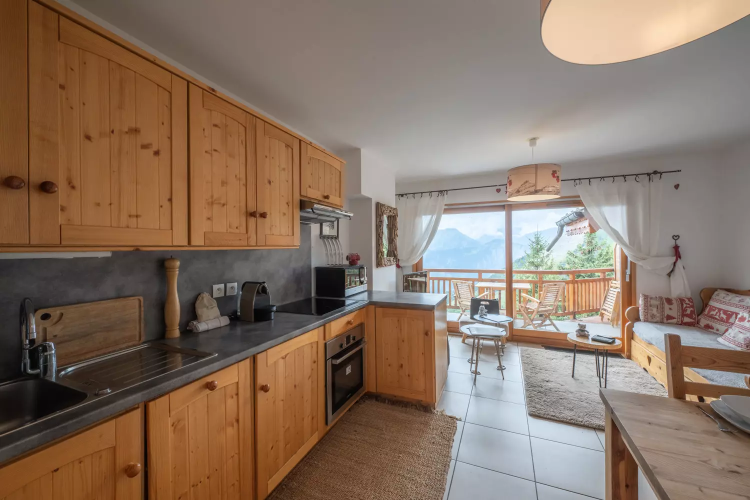 Chaque appartement, décoré dans un style authentique, bénéficie d'une vue spectaculaire sur les majestueuses montagnes qui se dressent à l'horizon, invitant à la rêverie dès le lever du soleil. Les grandes baies vitrées laissent entrer une lumière douce, illuminant les espaces de vie avec une touche de magie alpine.