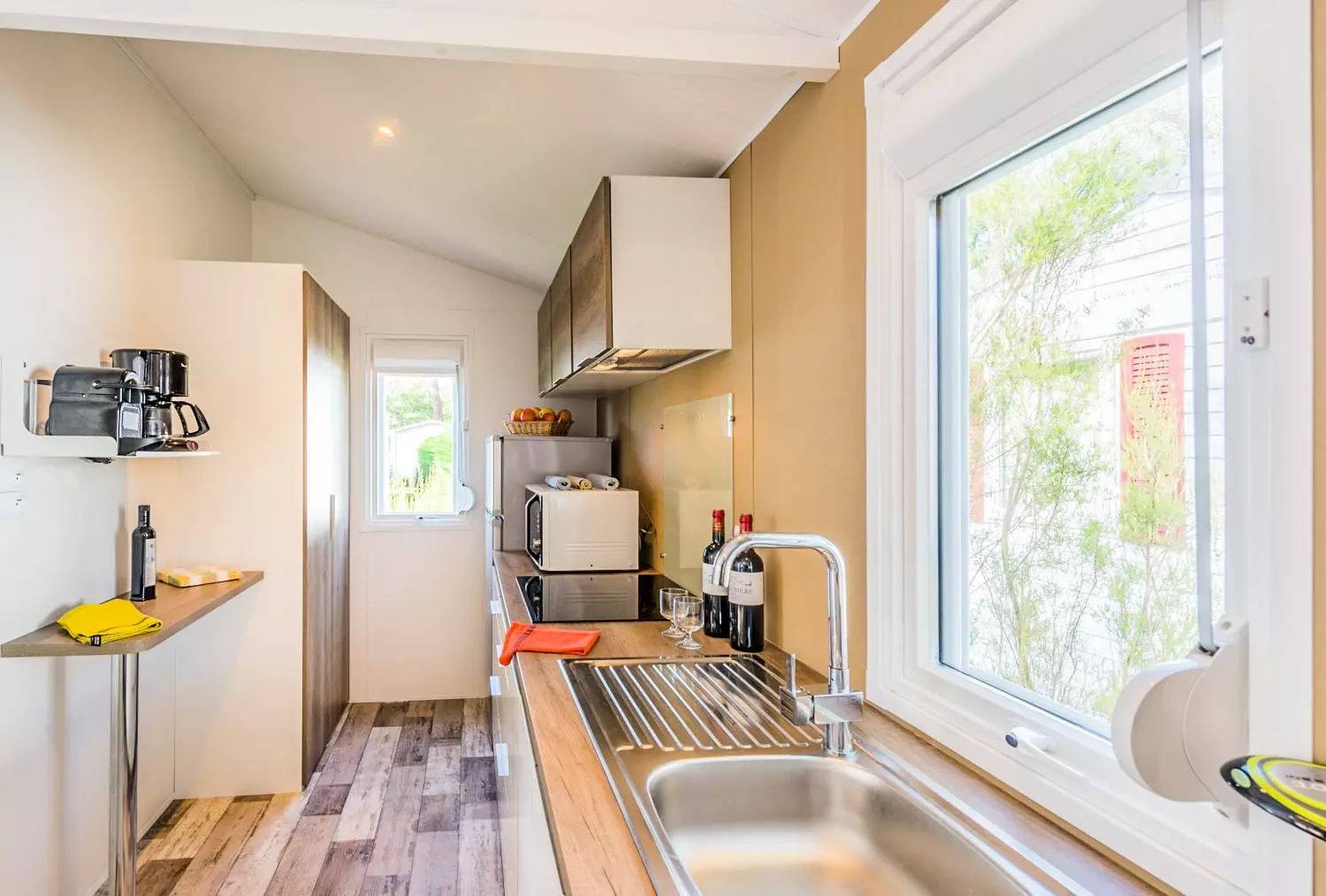 Une cuisine ouverte équipée avec grand réfrigérateur-congélateur, plaque de cuisson vitrocéramique, micro-ondes, cafetière nespresso à capsules, grille-pain, bouilloire, vaisselle et ustensiles ménagers.