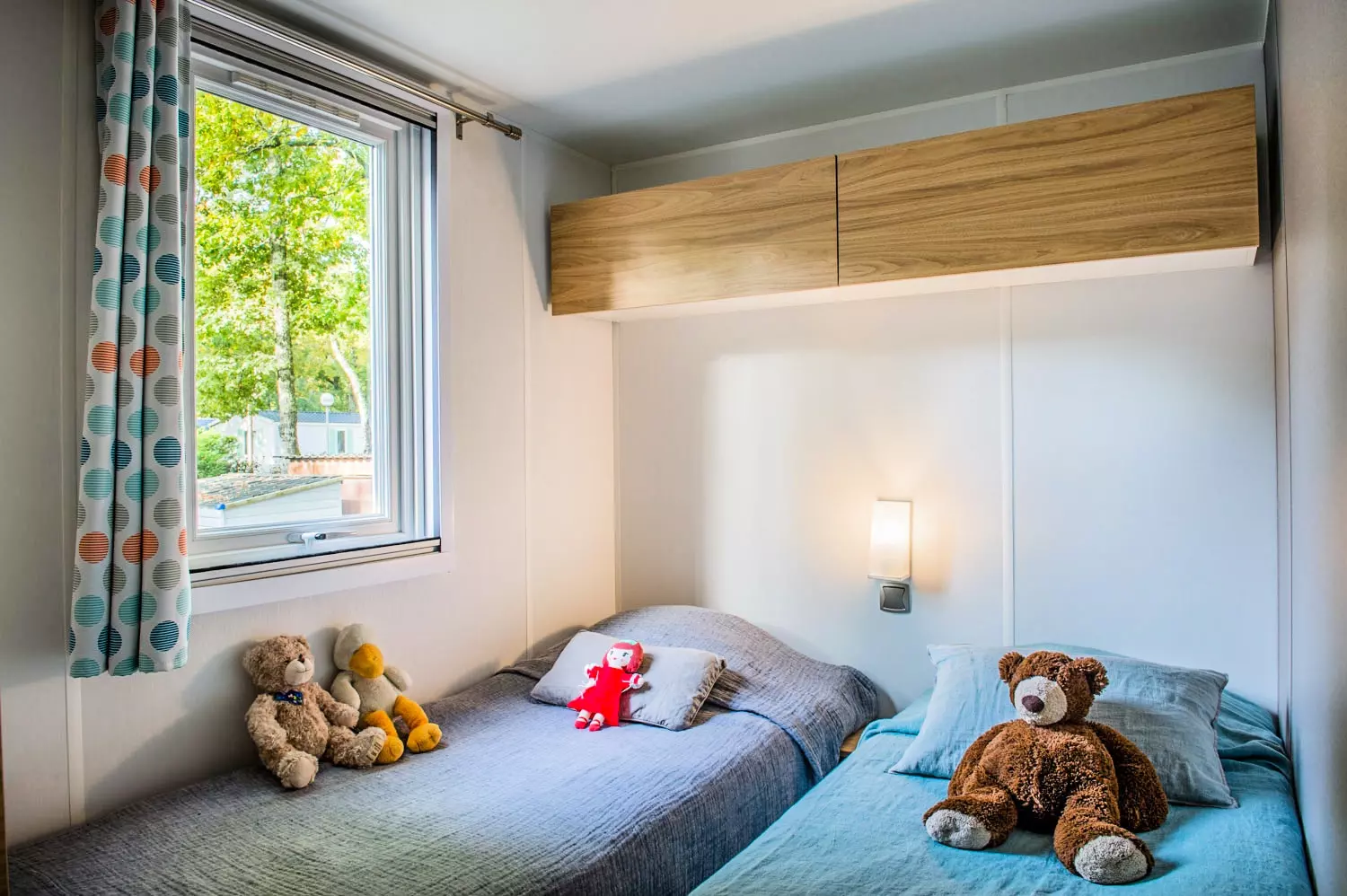 3 chambres séparées : 1 chambre avec 1 lit 140 x190 cm (160cm pour certains modèles). 2 chambres avec 2 lits 80 x190 cm.
