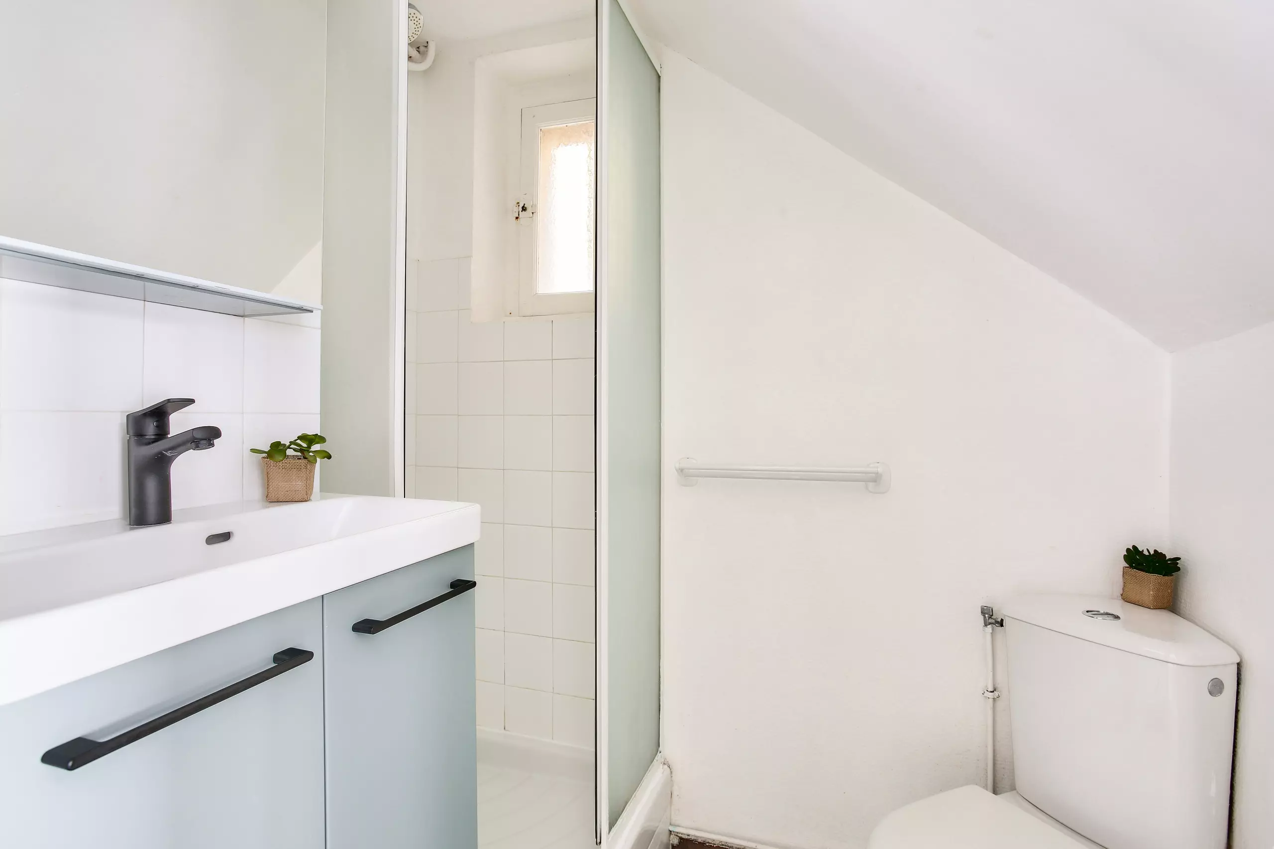 Au rez-de-chaussée, on découvre un beau salon-salle à manger avec des murs verts et blancs, et des jolis meubles en bois. Un canapé confortable et deux jolis fauteuils invitent à prendre place autour de la table basse pour des apéritifs conviviaux ou des parties de jeux de société. Une grande table ovale vous permettra de vous réunir autour des bons repas, préparés avec soin dans la cuisine adjacente. Indépendante et toute équipée, vous y trouverez une plaque de cuisson au gaz, un four traditionnel et un micro-ondes, un réfrigérateur, un congélateur et un lave-vaisselle. Pour vos petits déjeuners, une bouilloire, un grille-pain et une cafetière à capsules Nespresso sont à votre disposition. Ce niveau se complète par une salle d'eau avec une petite douche et un WC sous l'escalier.