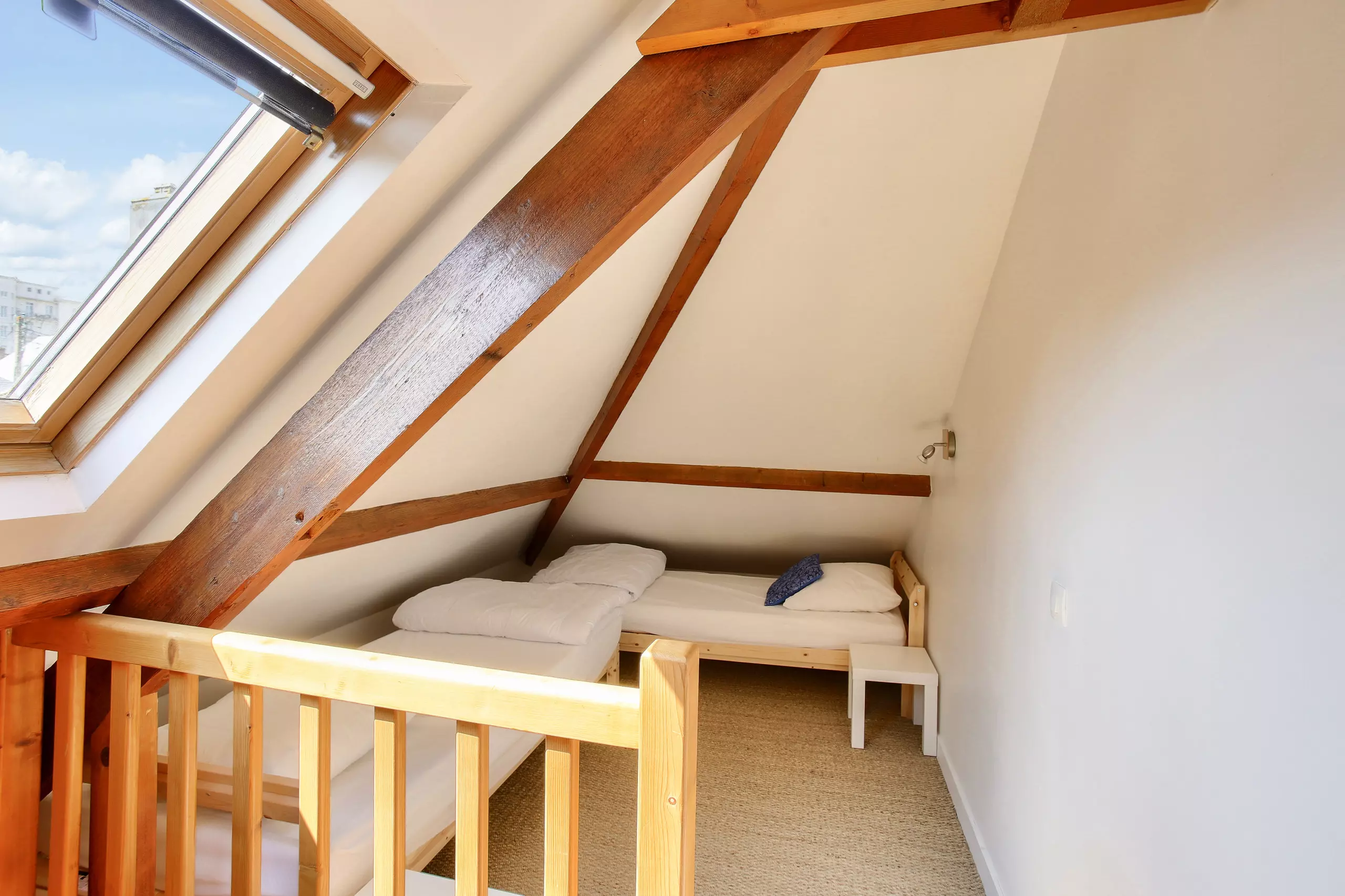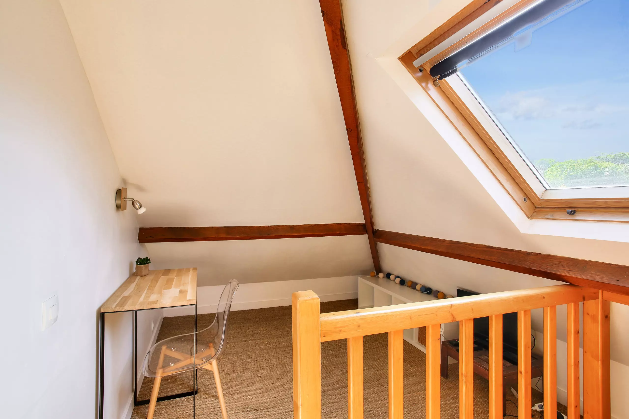 Au premier étage, on trouve une chambre avec un grand lit Queen size (160 x 200 cm), et une autre avec un lit bébé en bois, une table à langer, et un lit gigogne, pouvant offrir un couchage simple de 90 x 200 cm ou un grand couchage de 180 x 200 cm. Cachée sous les combles, une mezzanine avec deux lits simples et un coin bureau sera la cabane idéale pour les enfants qui aiment rêver plus près des étoiles, ou pour ceux qui auront besoin d'un espace de télétravail.