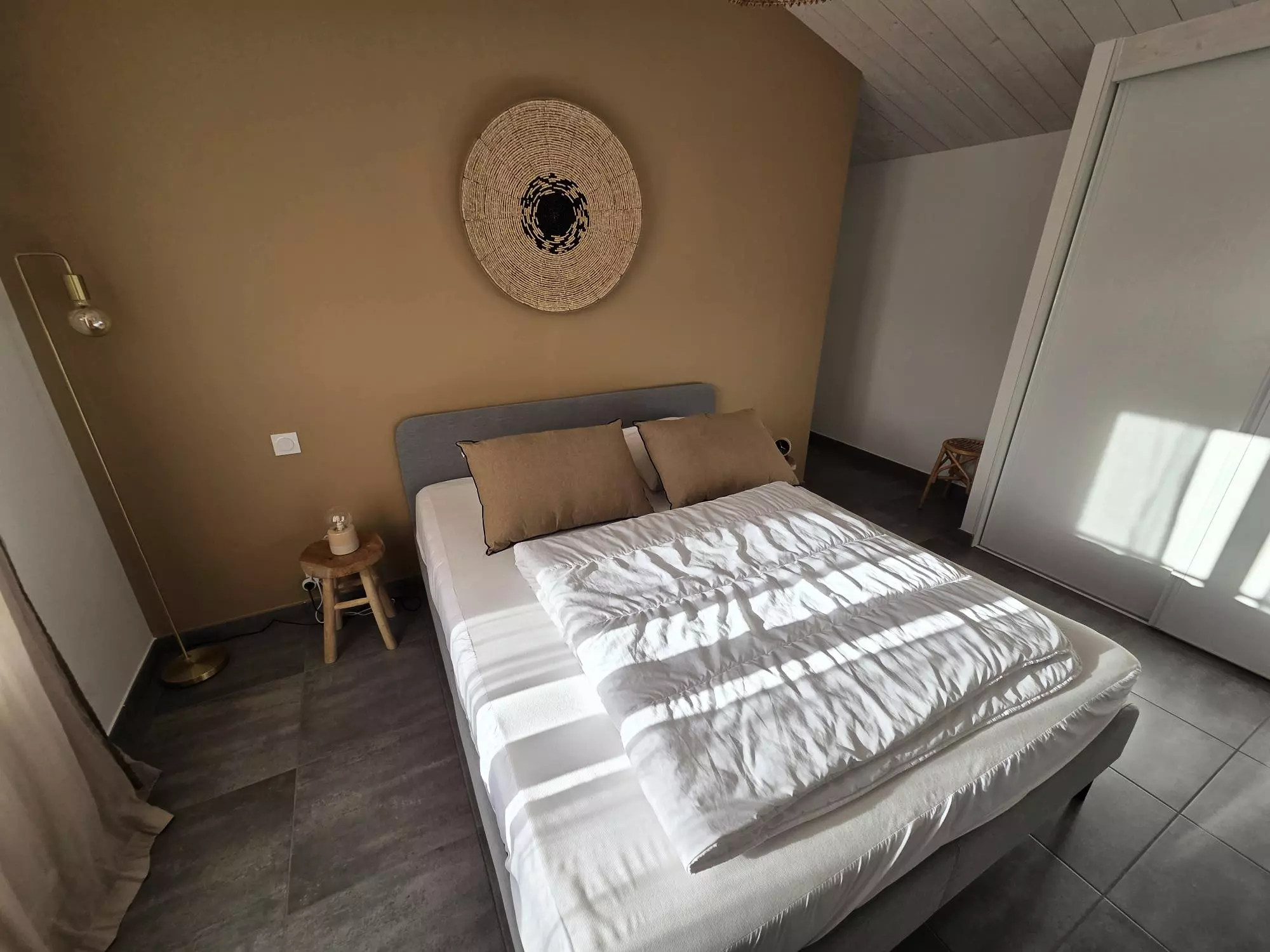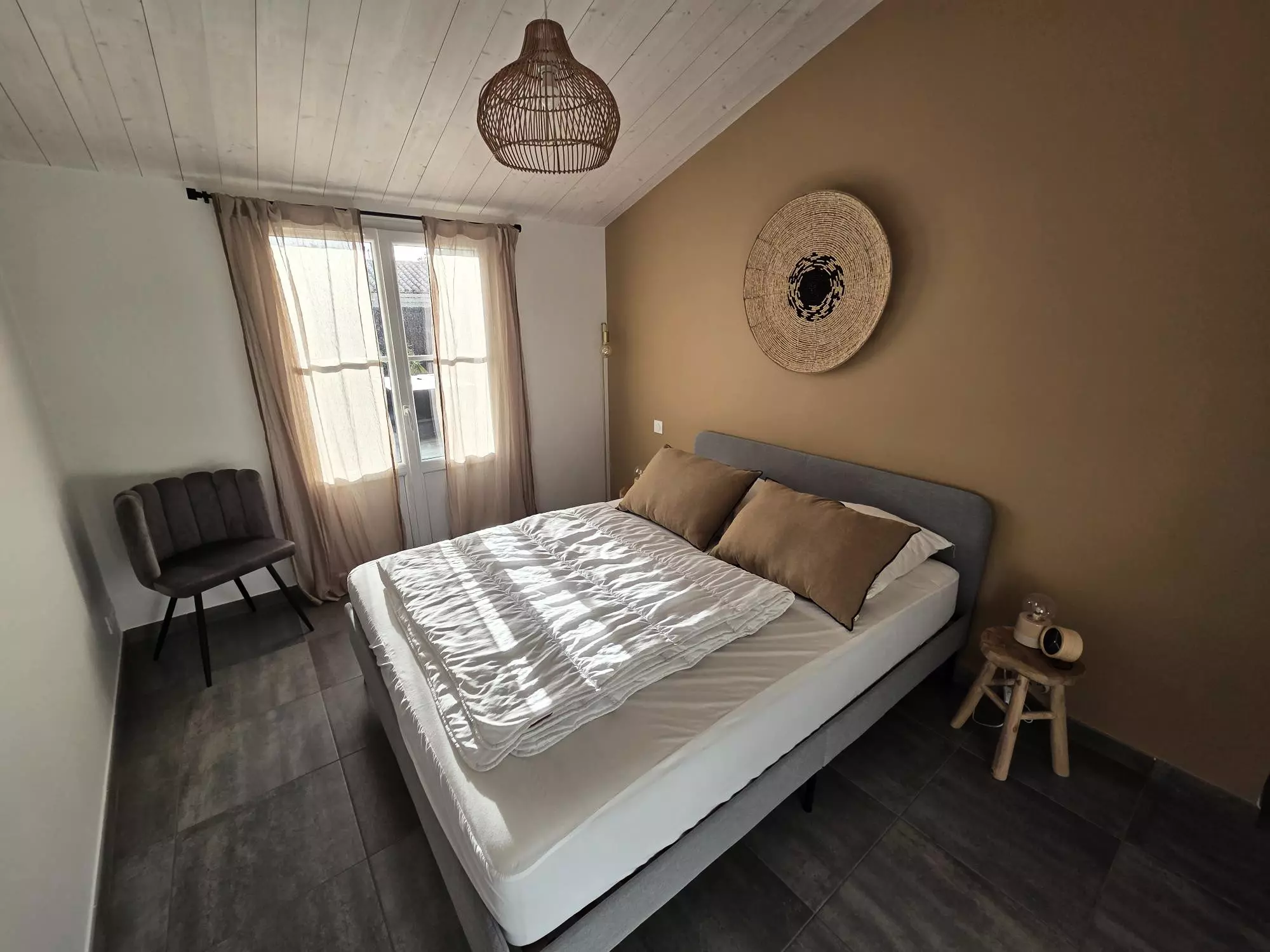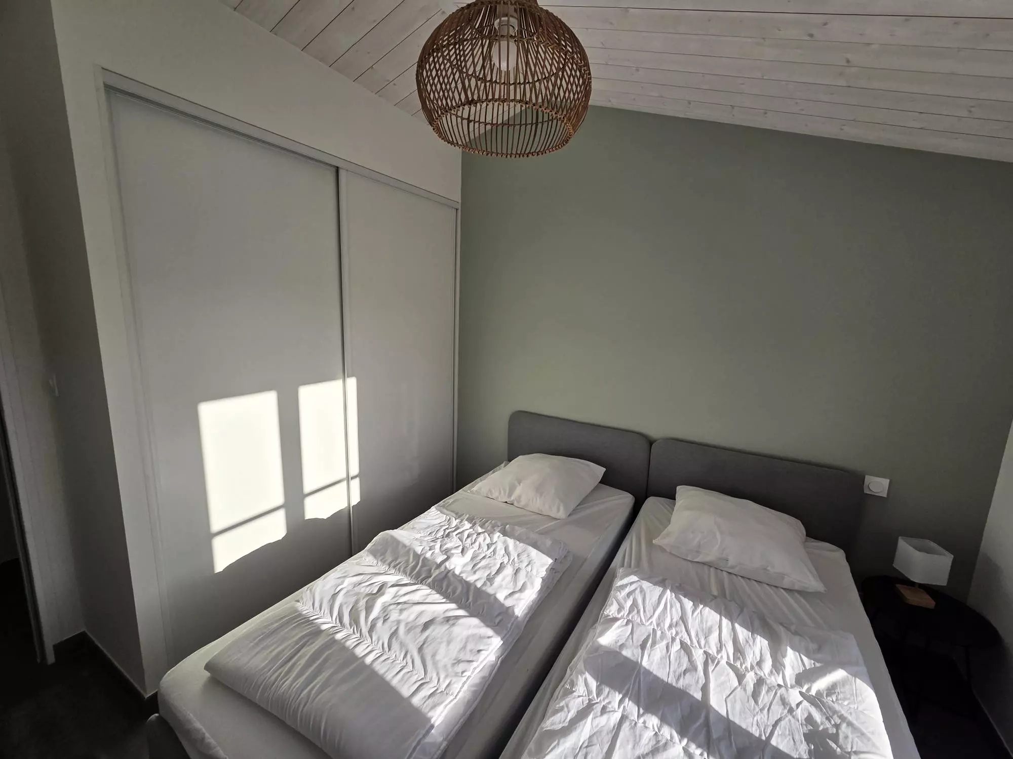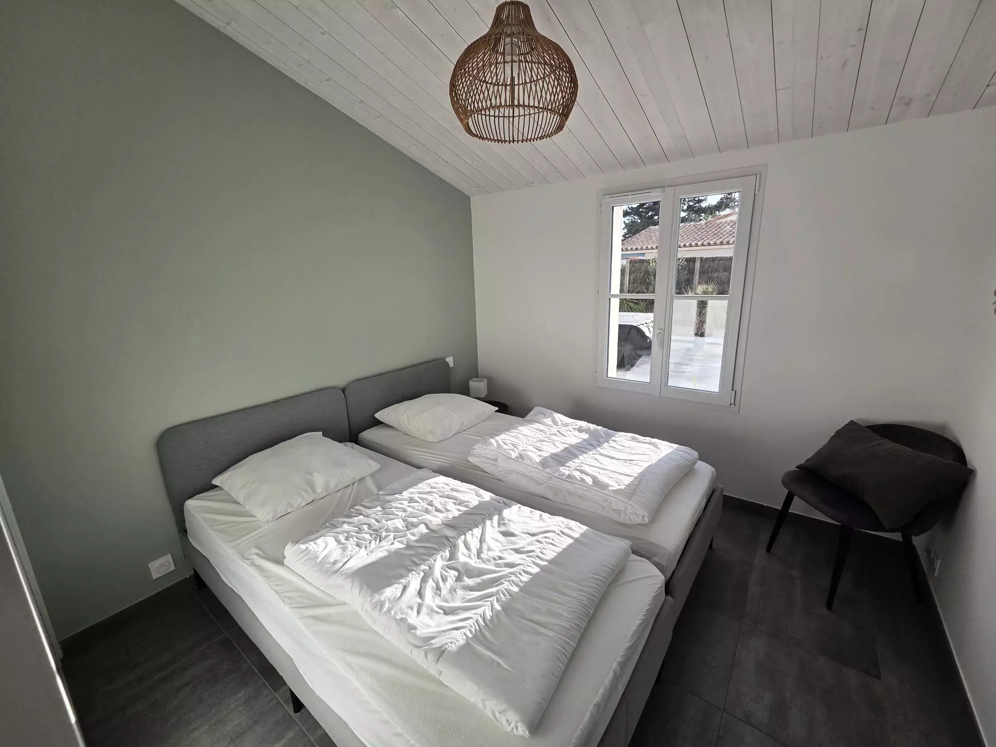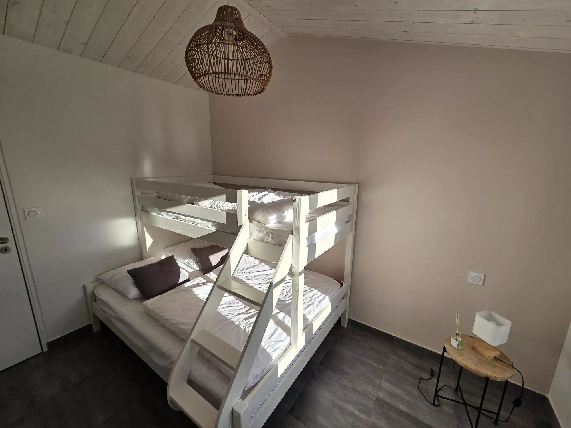 La maison peut accueillir jusqu'à 7 personnes grâce à ses trois chambres, les deux premières sont dotées d'un grand lit double, idéales pour des couples et la dernière dispose d'un lit superposé pouvant accueillir trois personnes (double en bas et simple en haut).