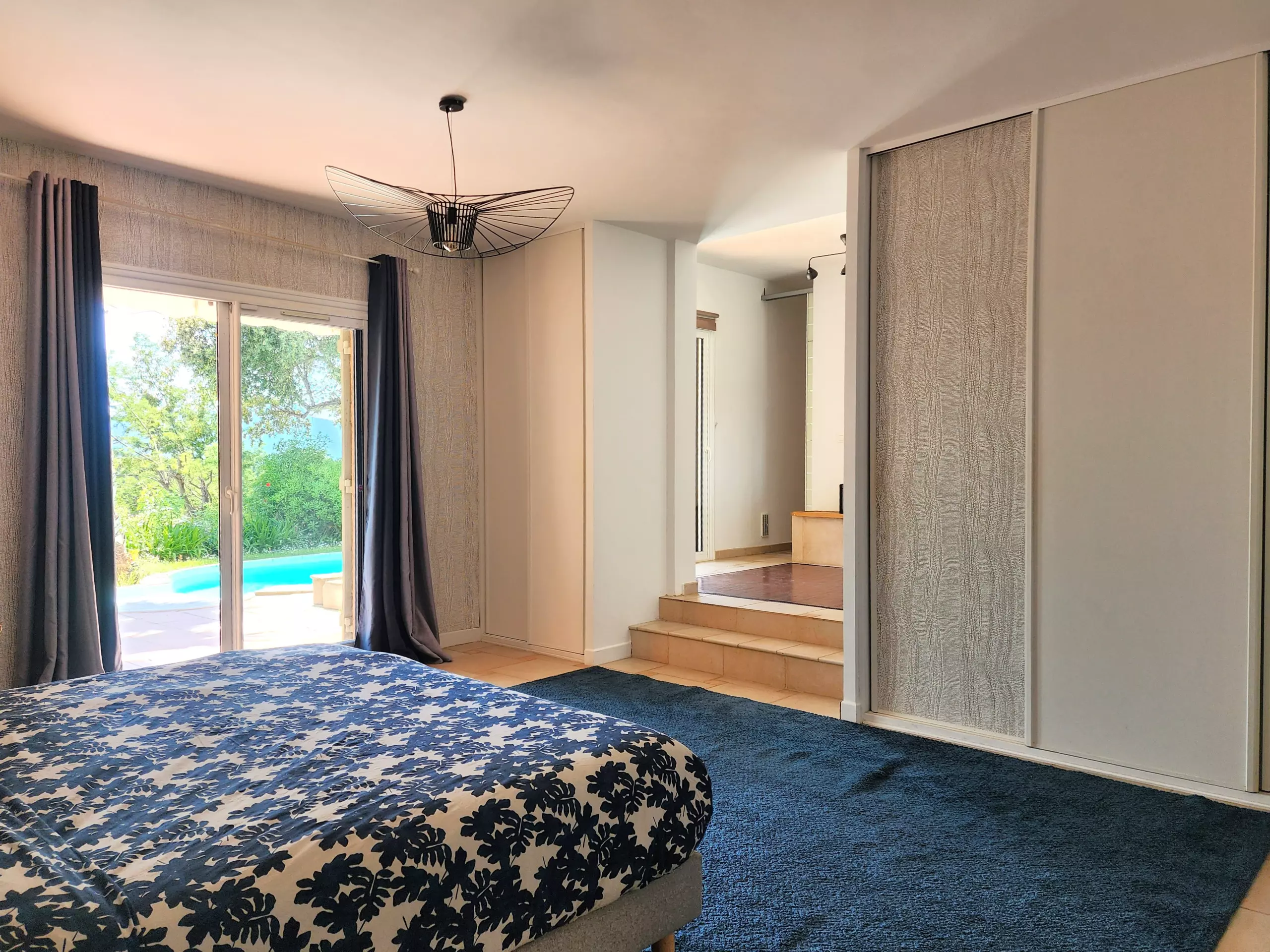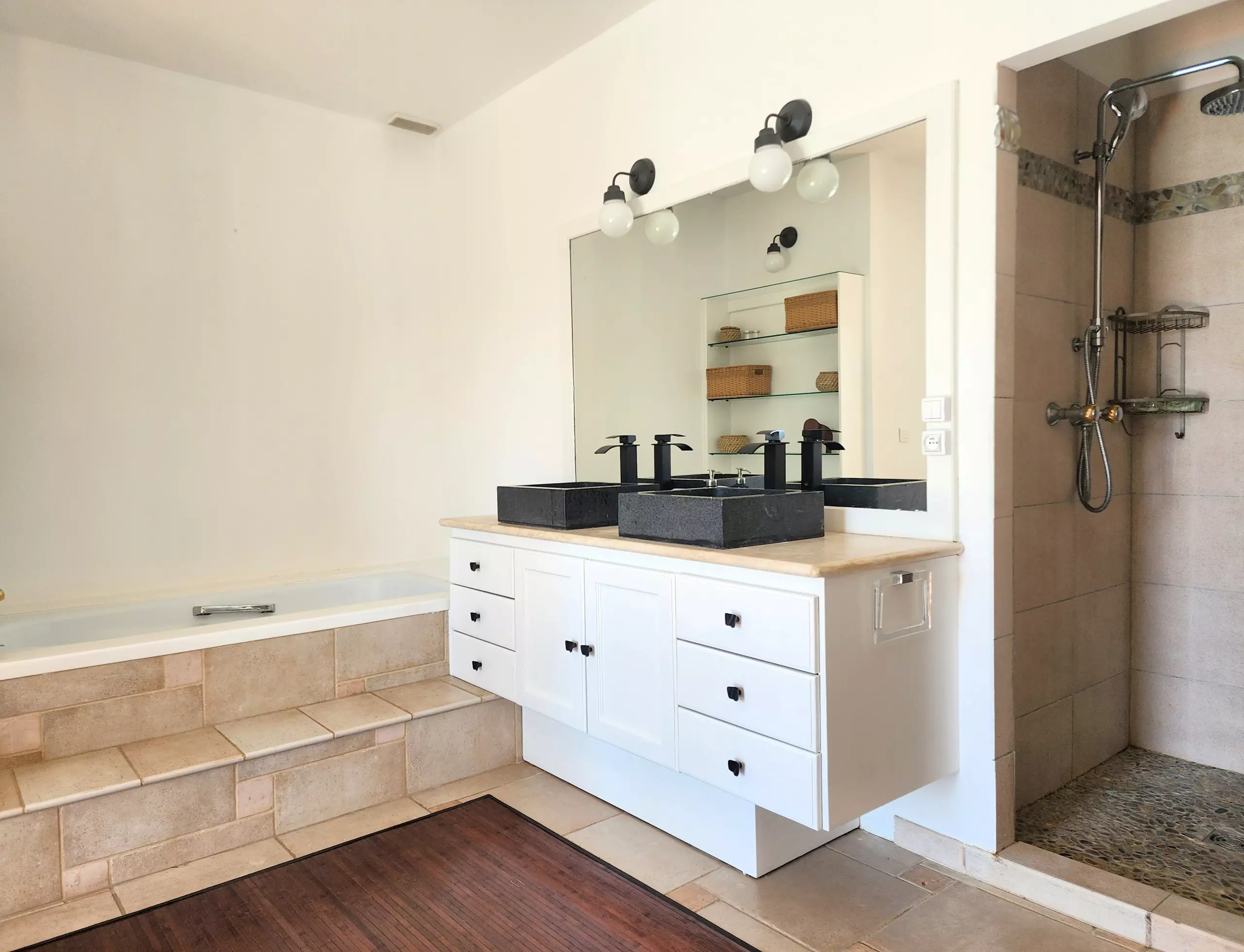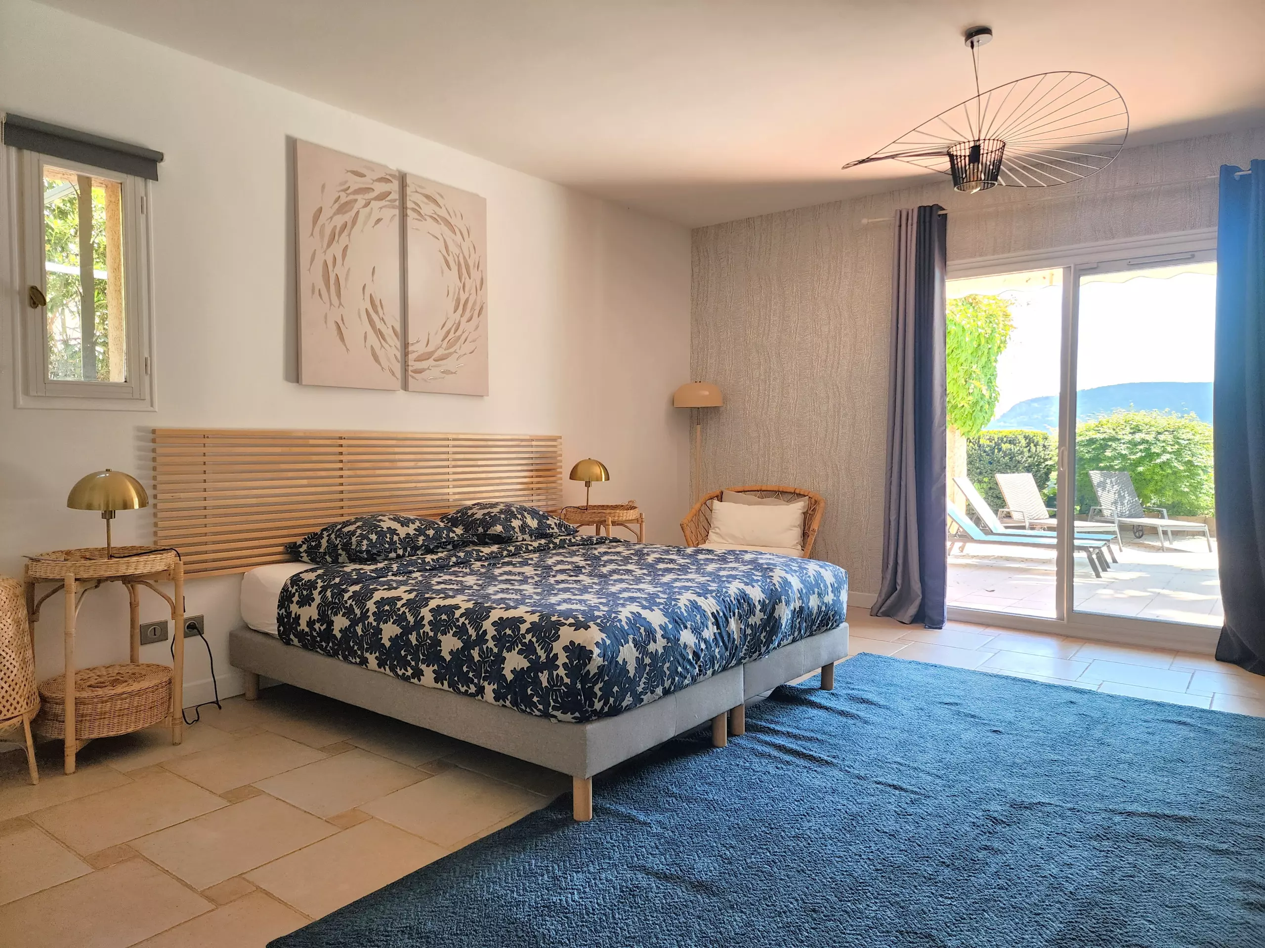 1 grande suite parentale avec lit double (180 cm), dressing, salle de bain (baignoire, douche, WC), accès direct à la piscine