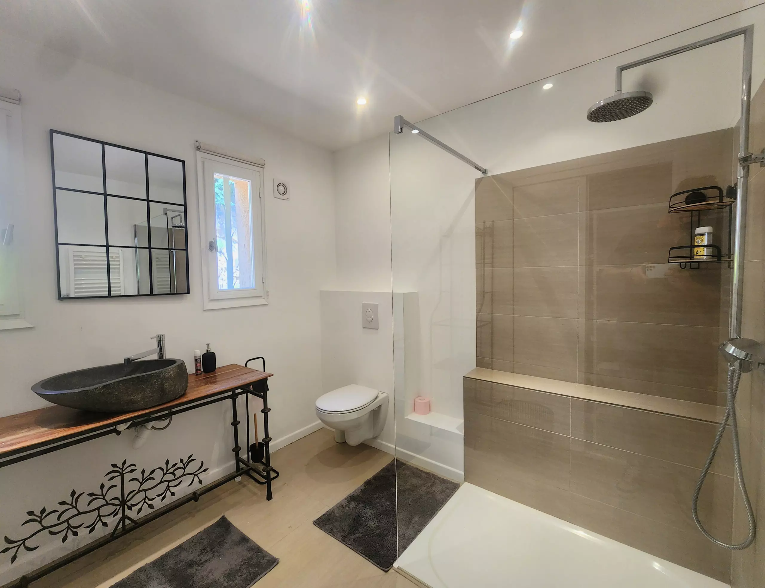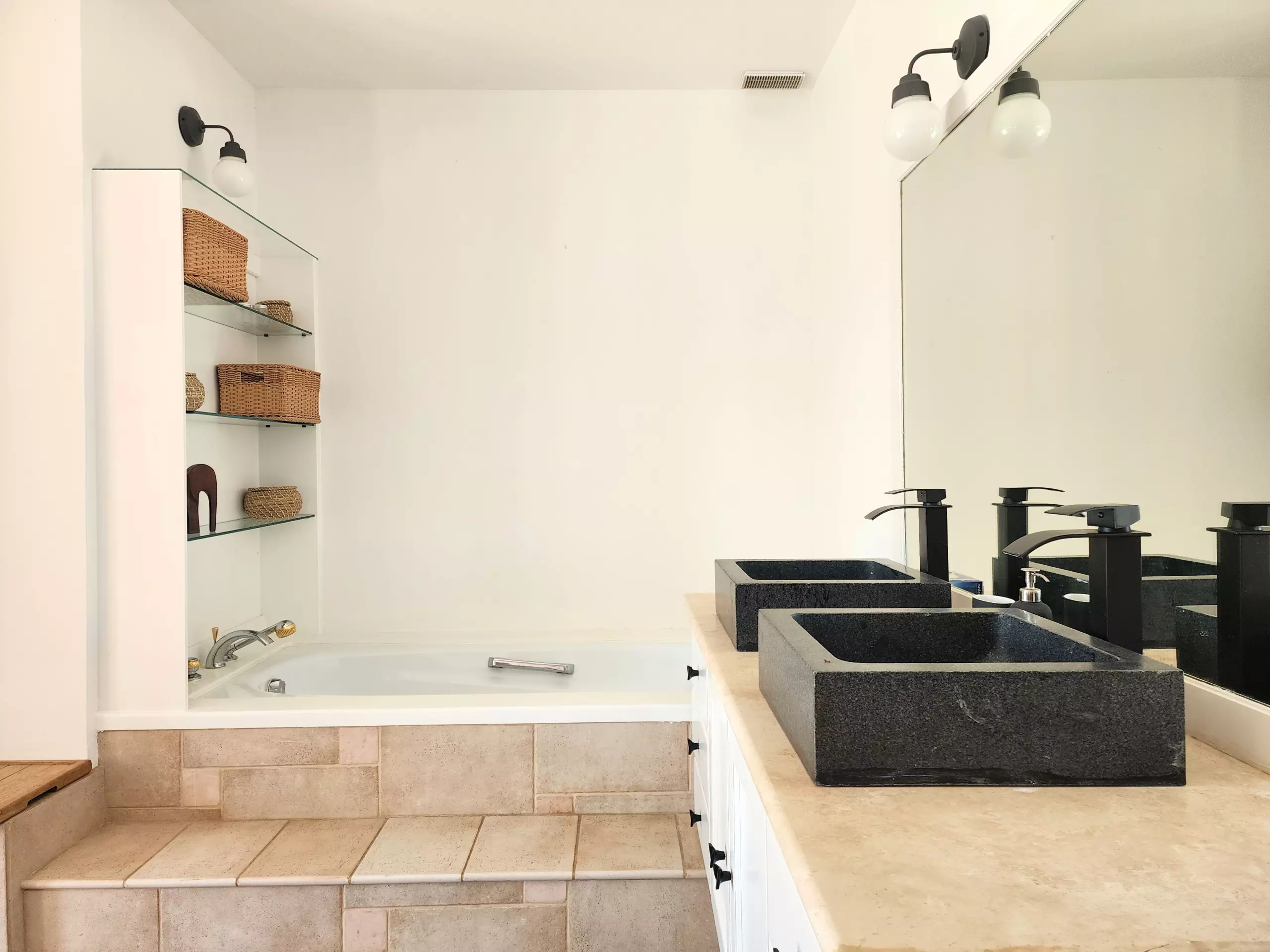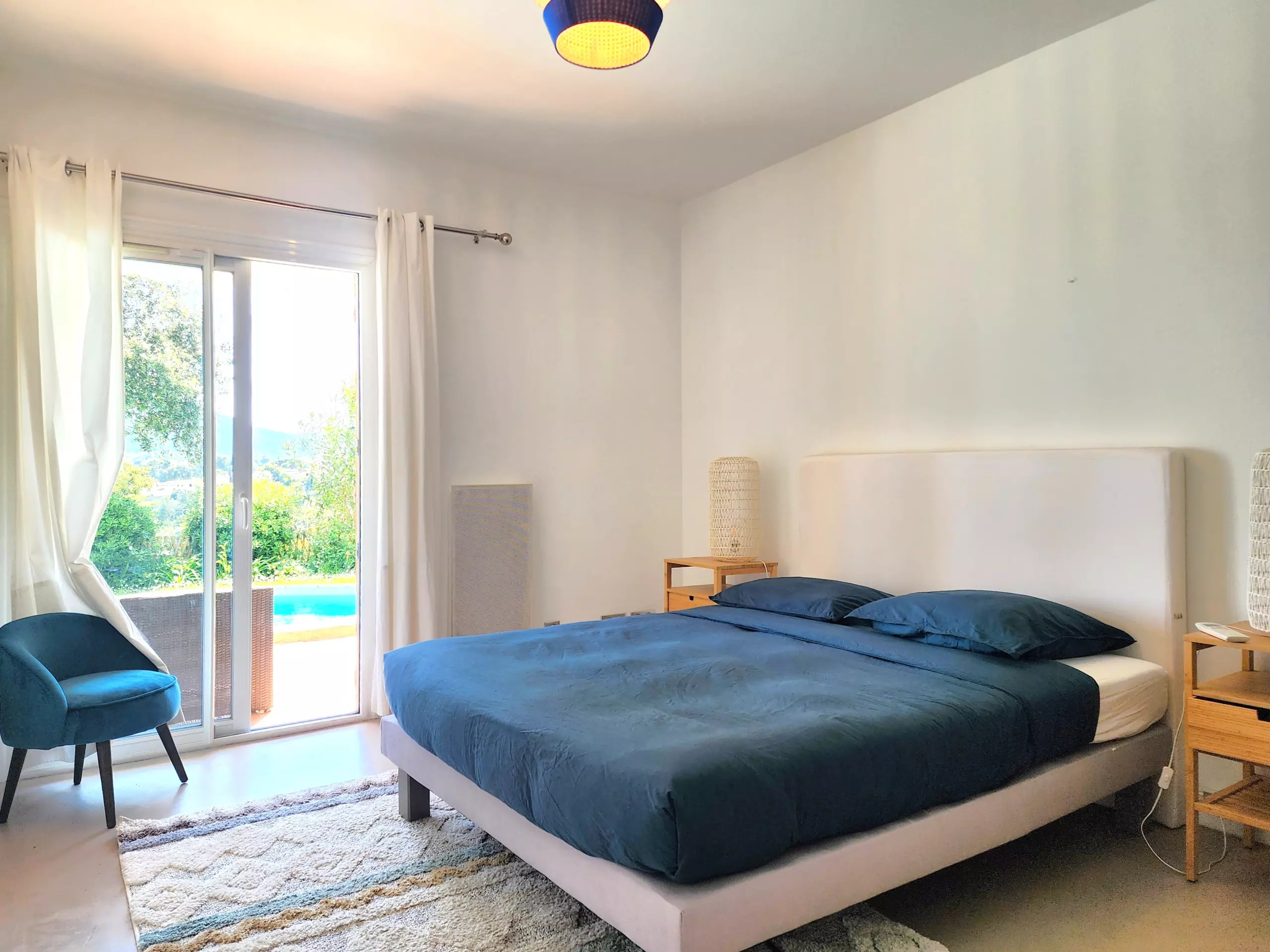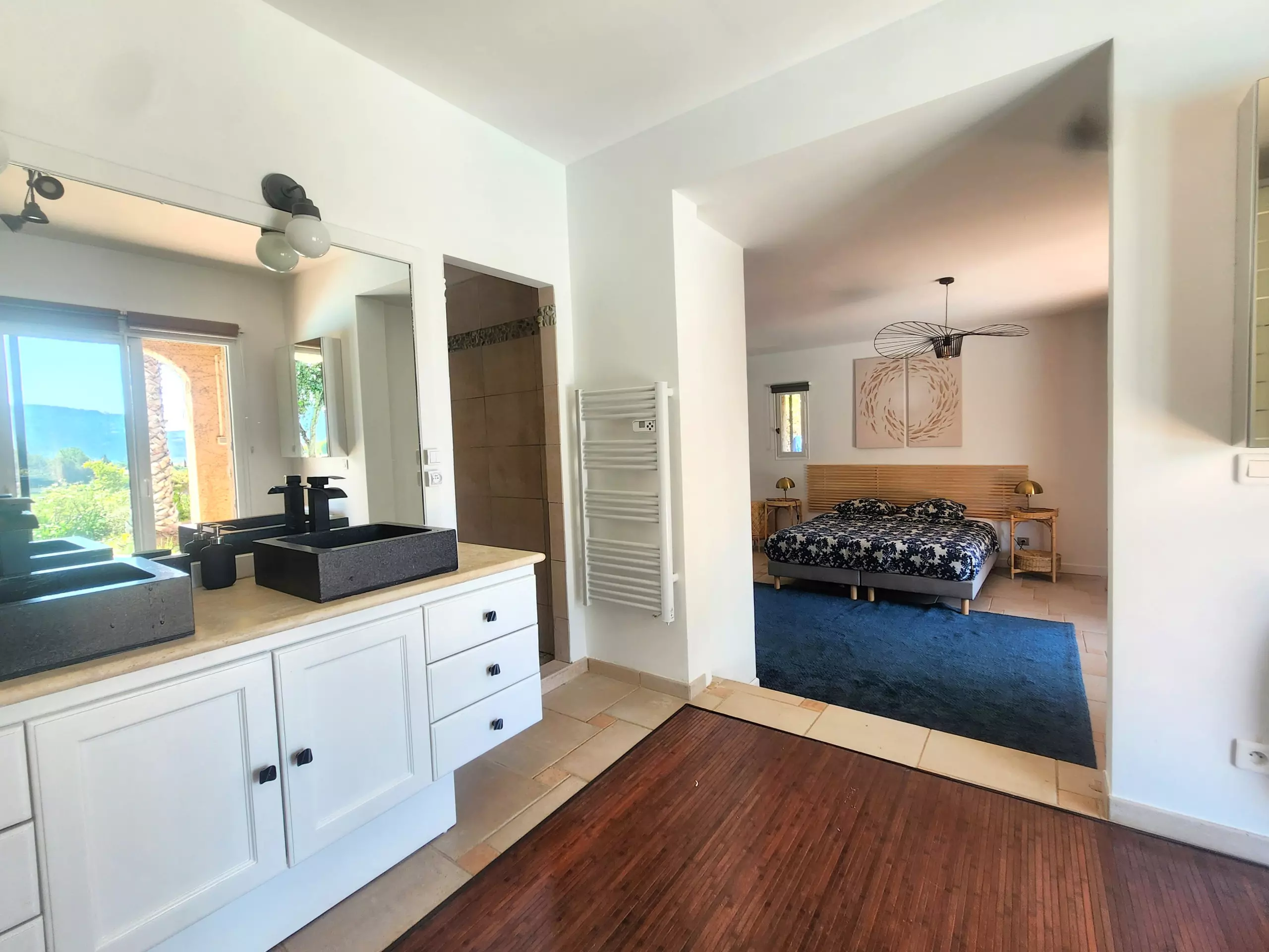 1 grande suite parentale avec lit double (180 cm), dressing, salle de bain (baignoire, douche, WC), accès direct à la piscine