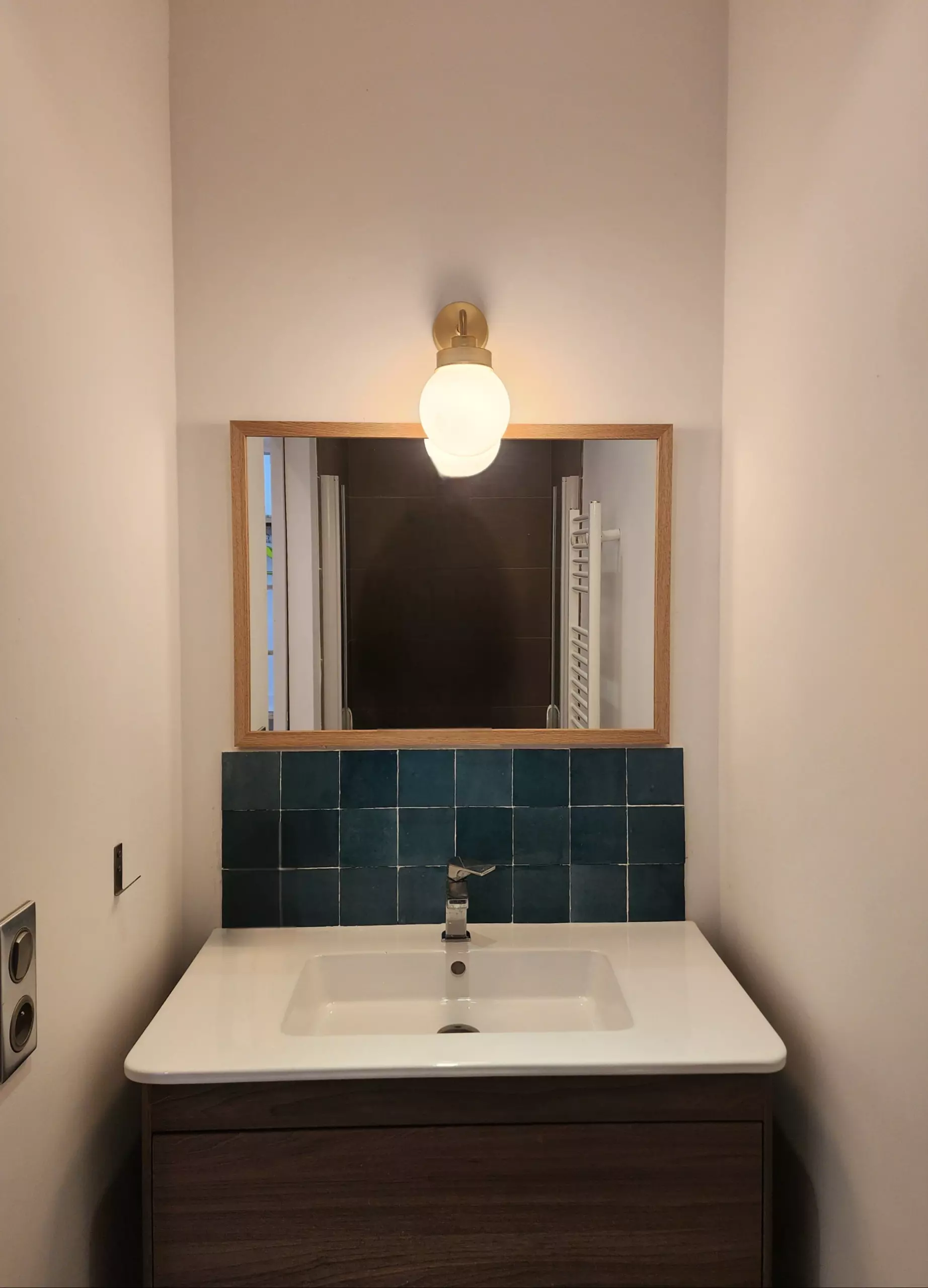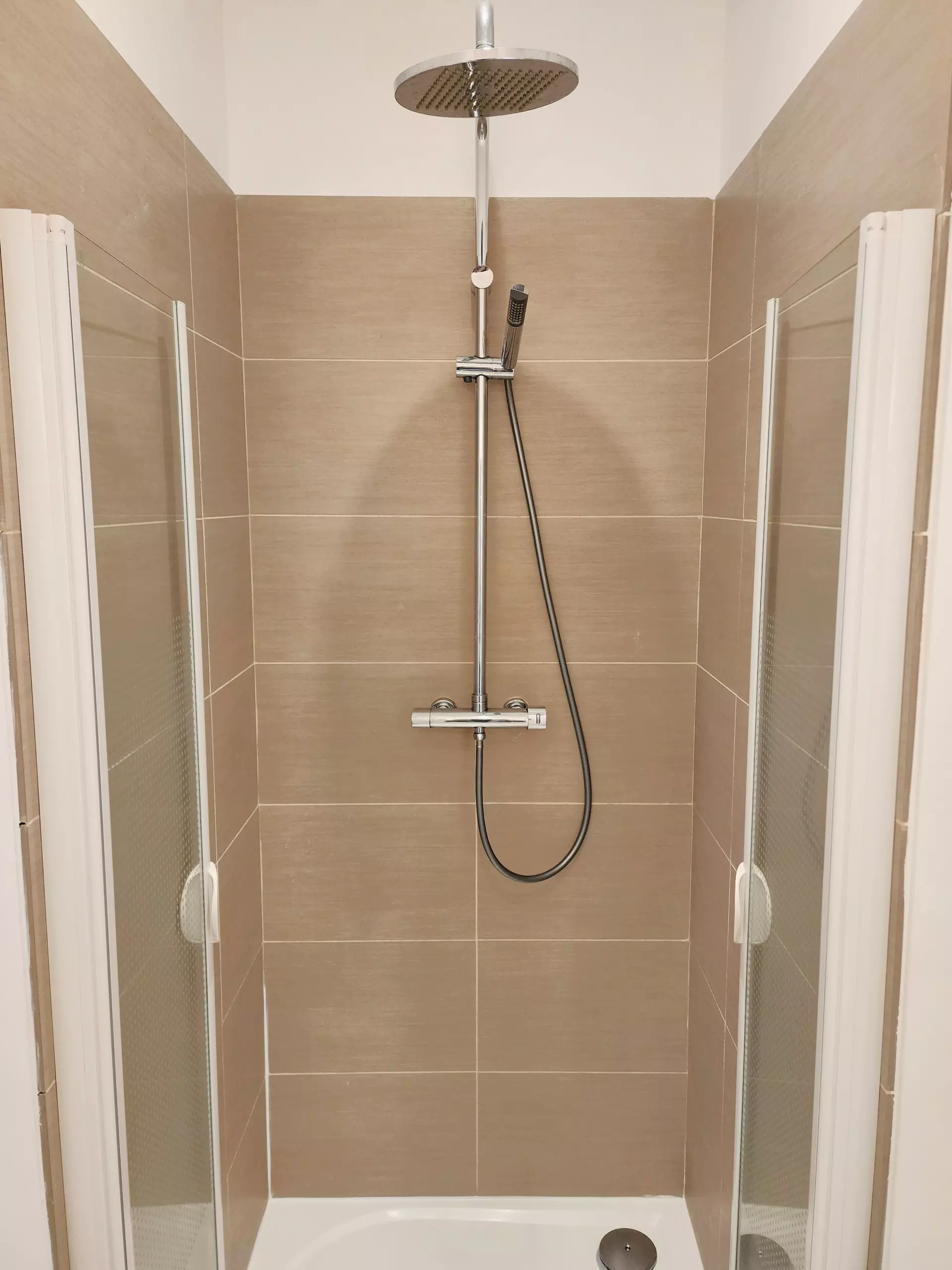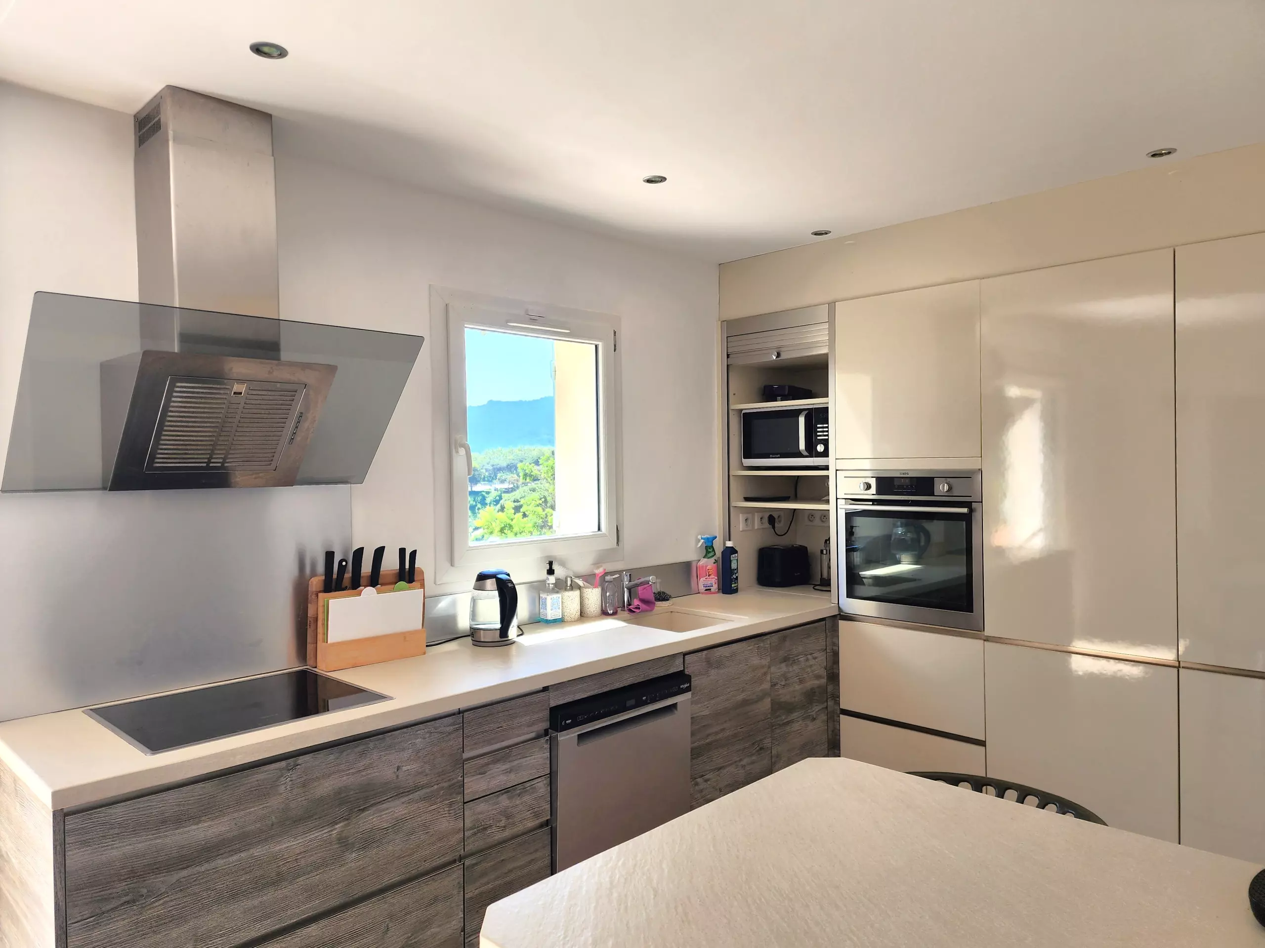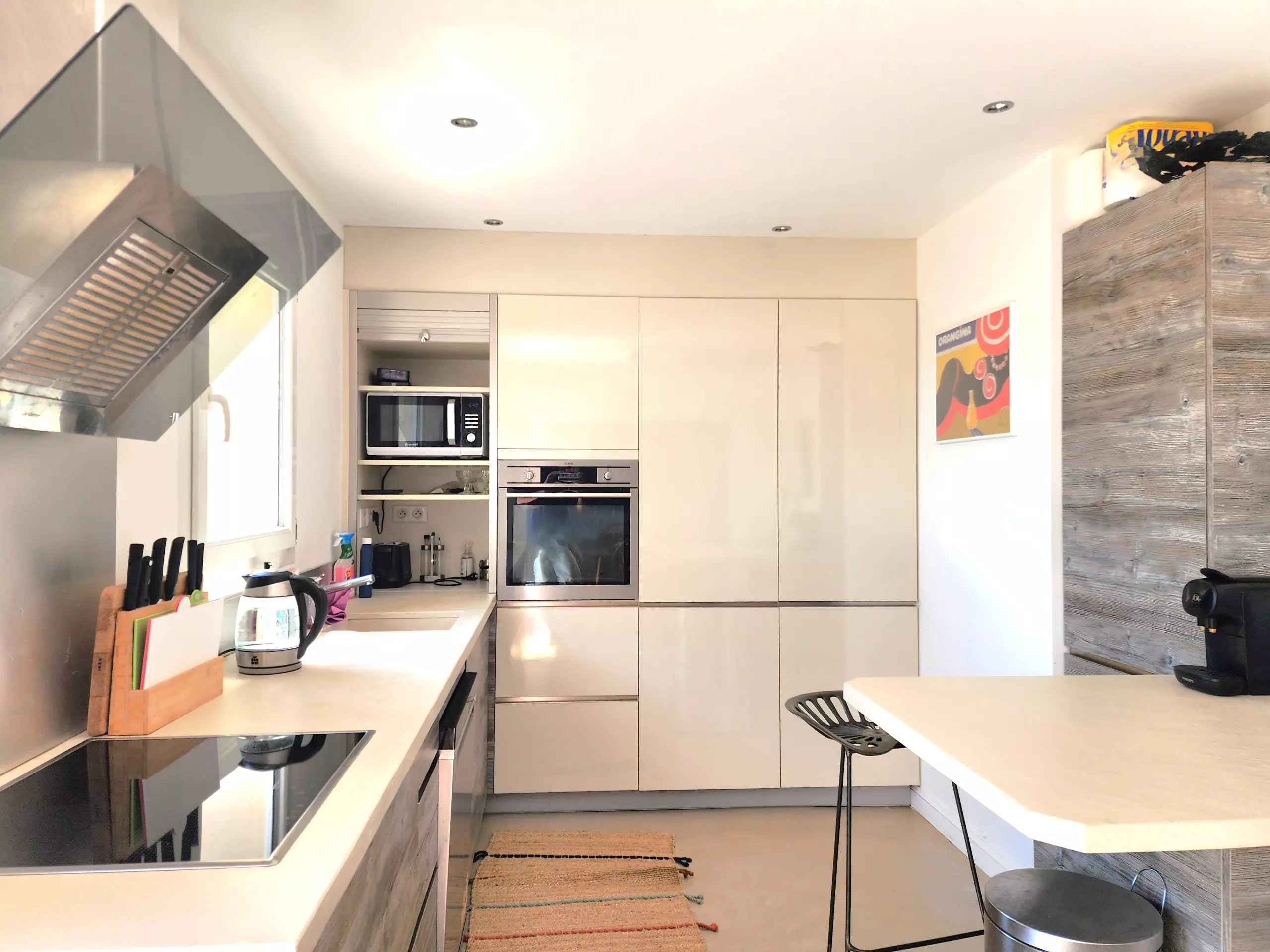 Cuisine entièrement équipée : plaque induction, hotte, four, micro-ondes, réfrigérateur, congélateur, bouilloire, grille-pain, machine Nespresso, télévision