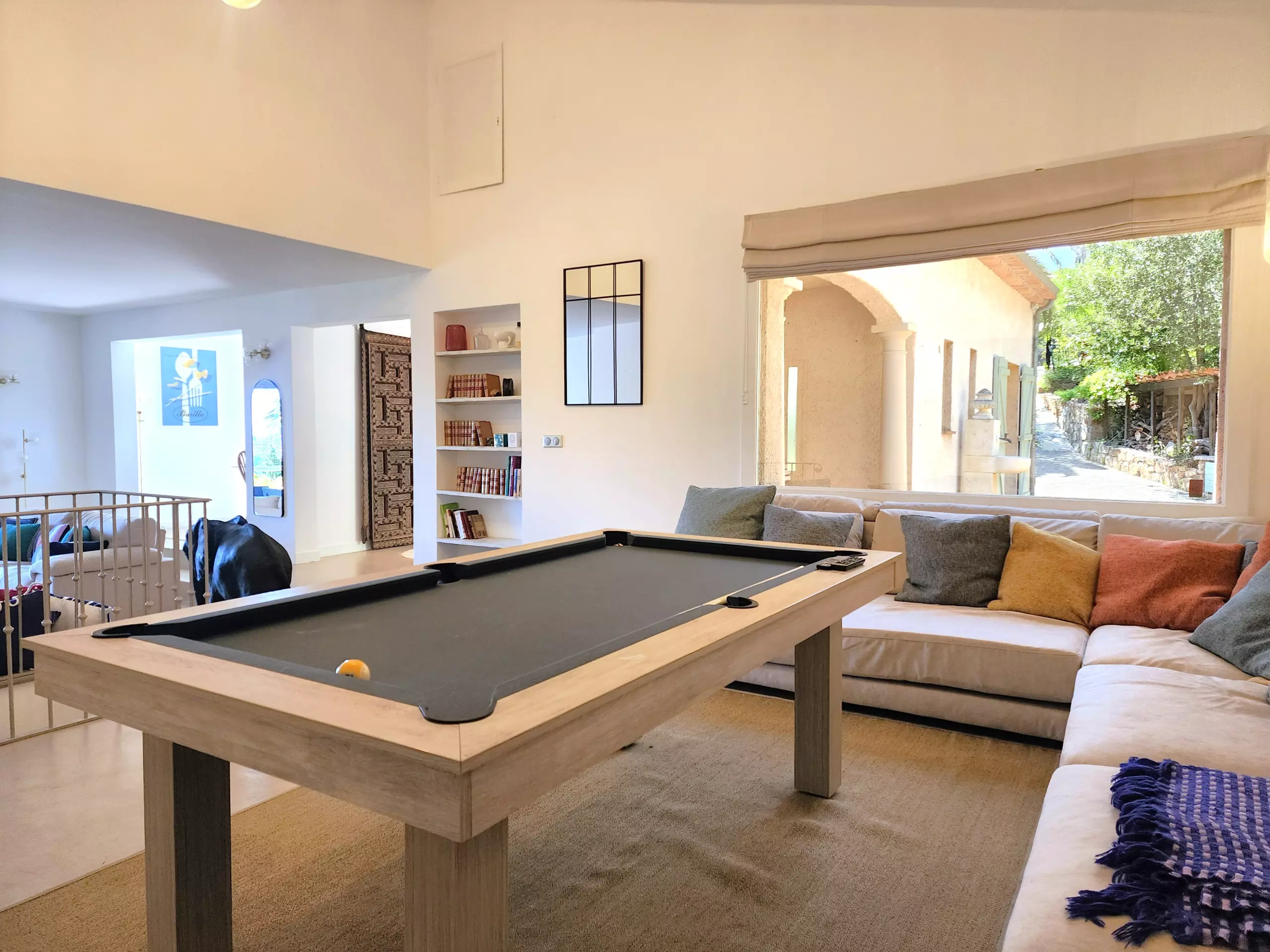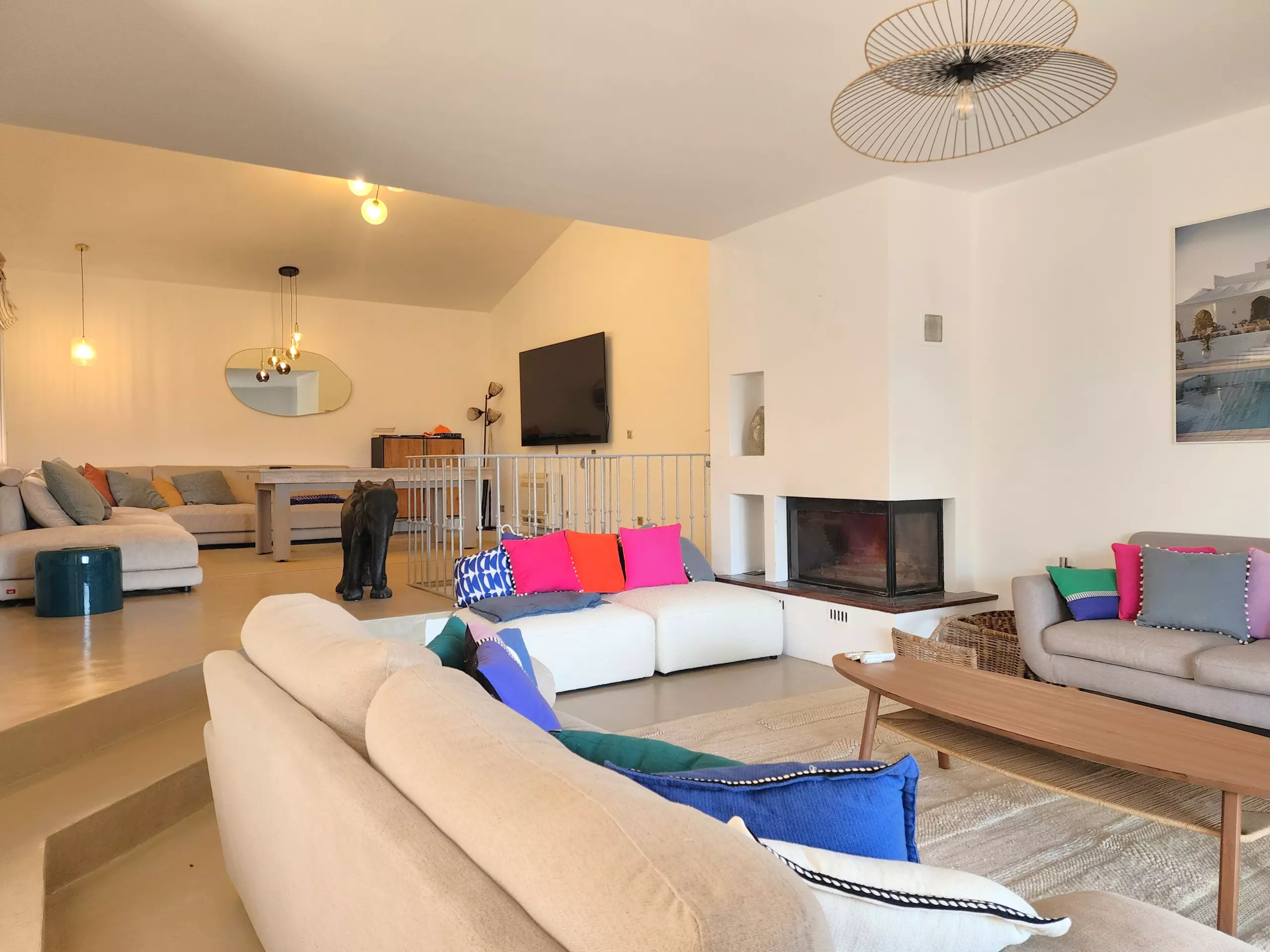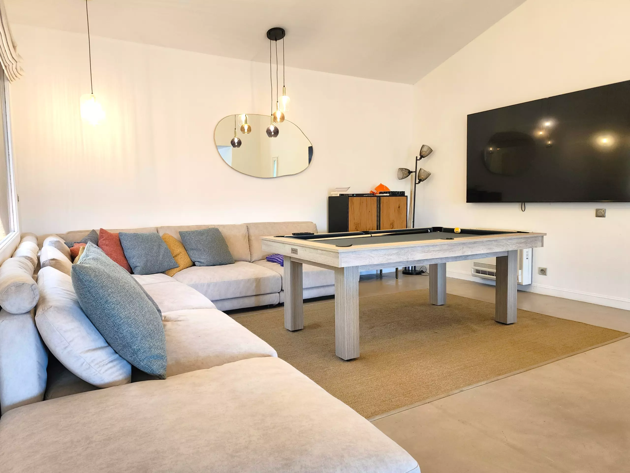 Double salon avec smart TV (215 cm), billard, cheminée, accès à une vaste terrasse avec vue mer