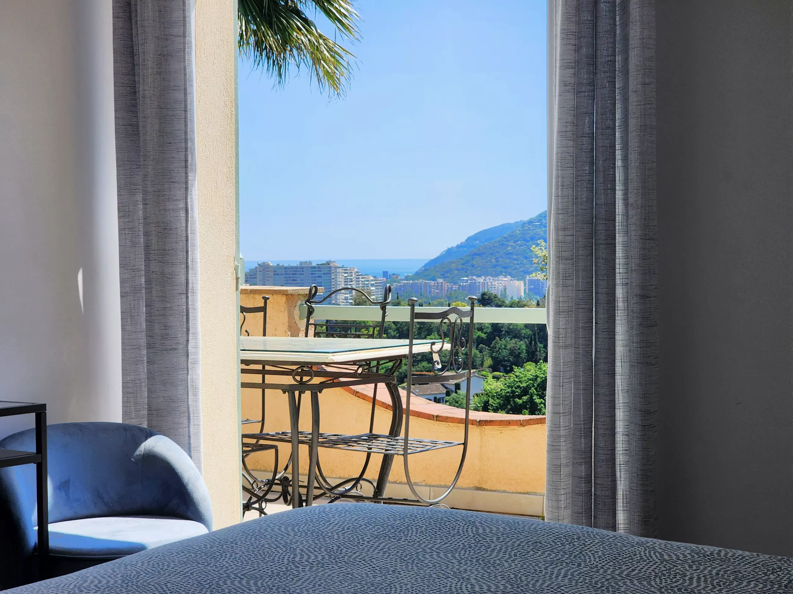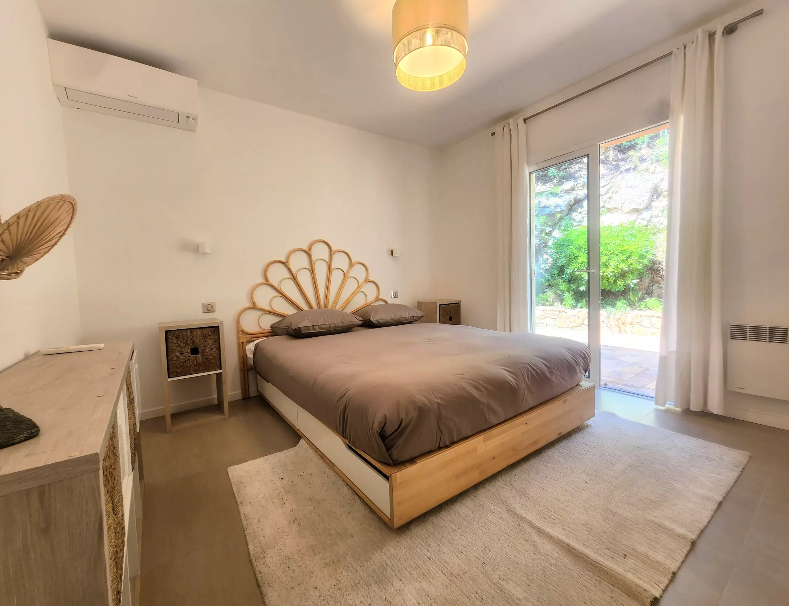 1 chambre avec lit double (140 cm), rangements, accès terrasse avec vue mer