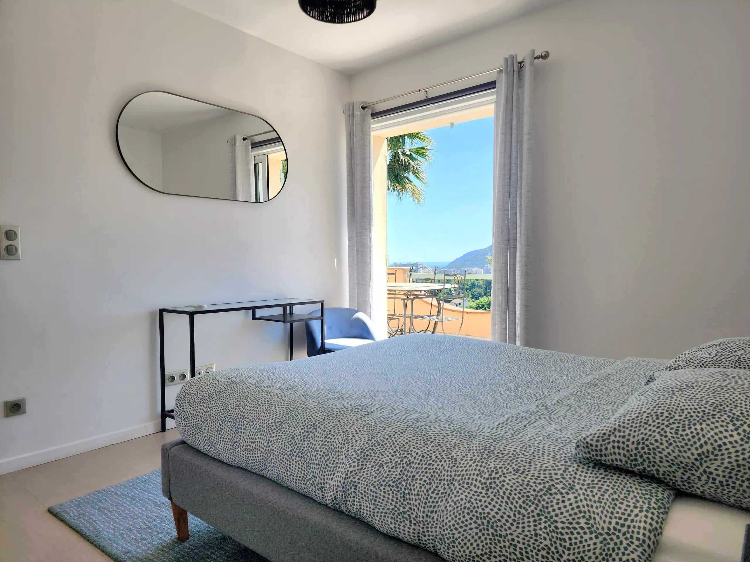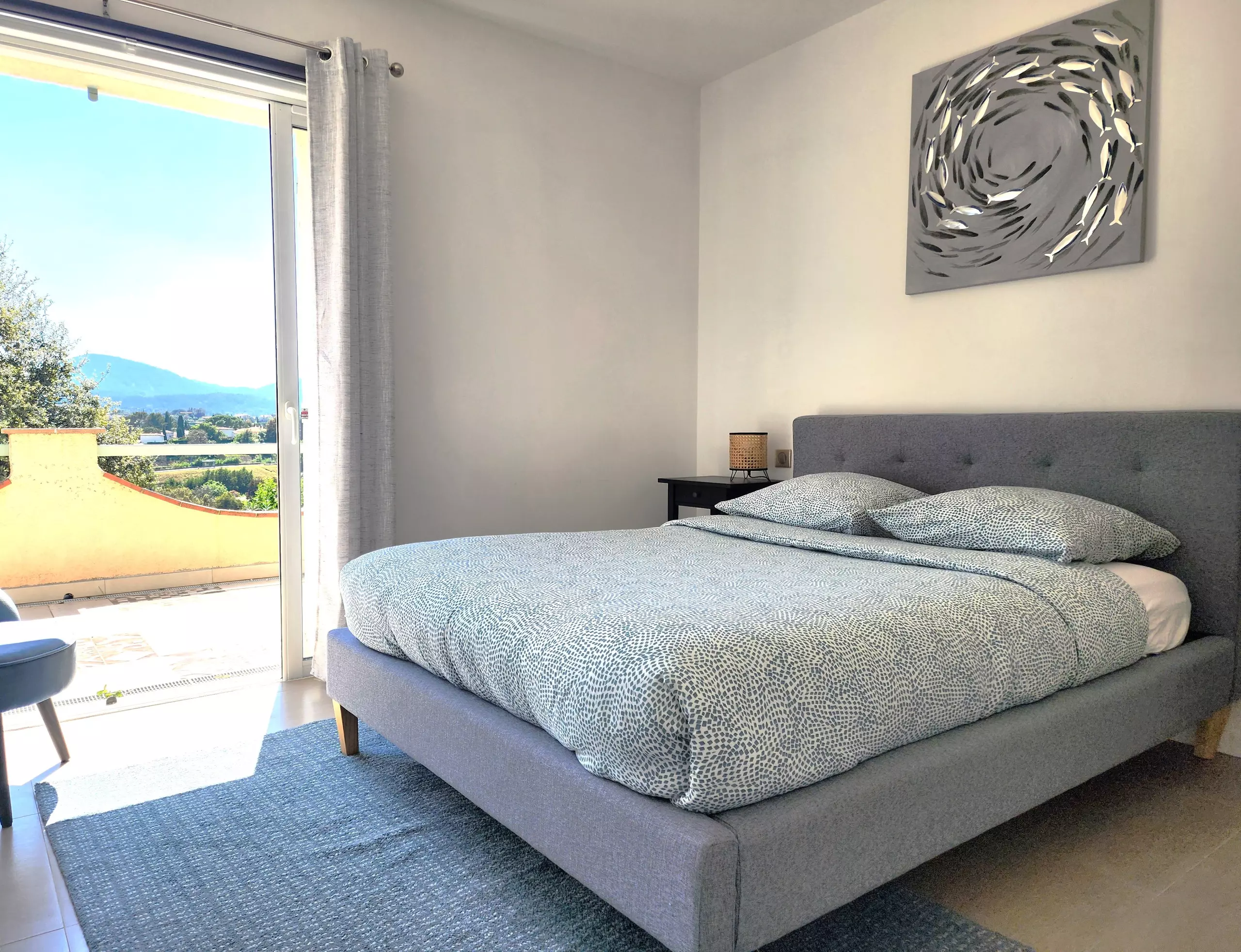 1 chambre avec lit double (160 cm), rangements, accès terrasse avec vue mer