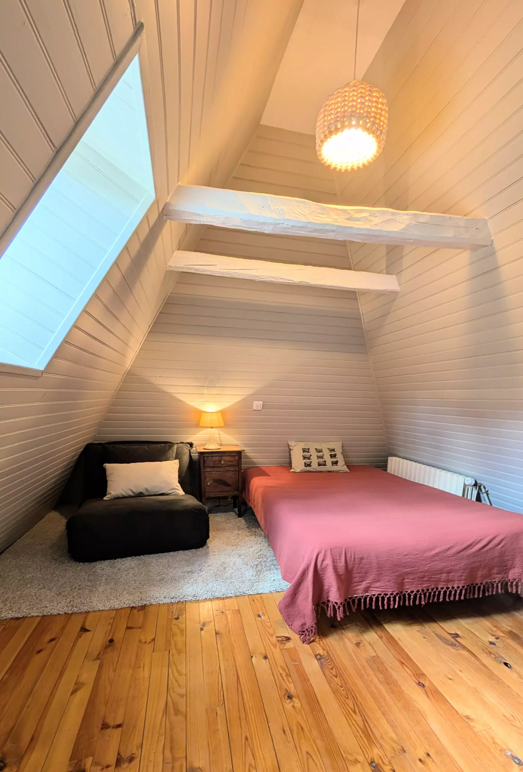 Au deuxième étage, vous retrouverez une chambre avec un lit double en 160x200 ainsi qu'une chauffeuse.