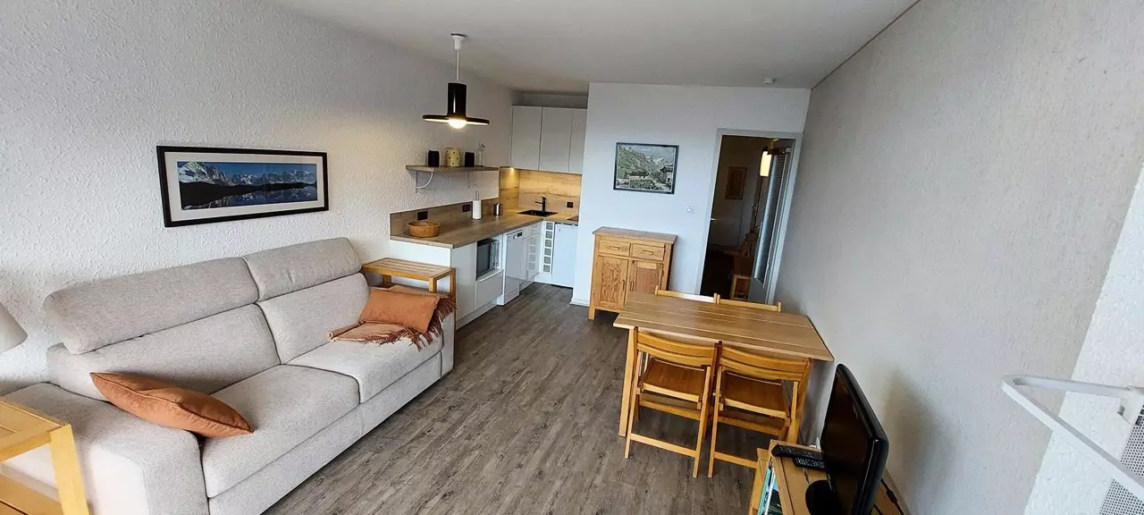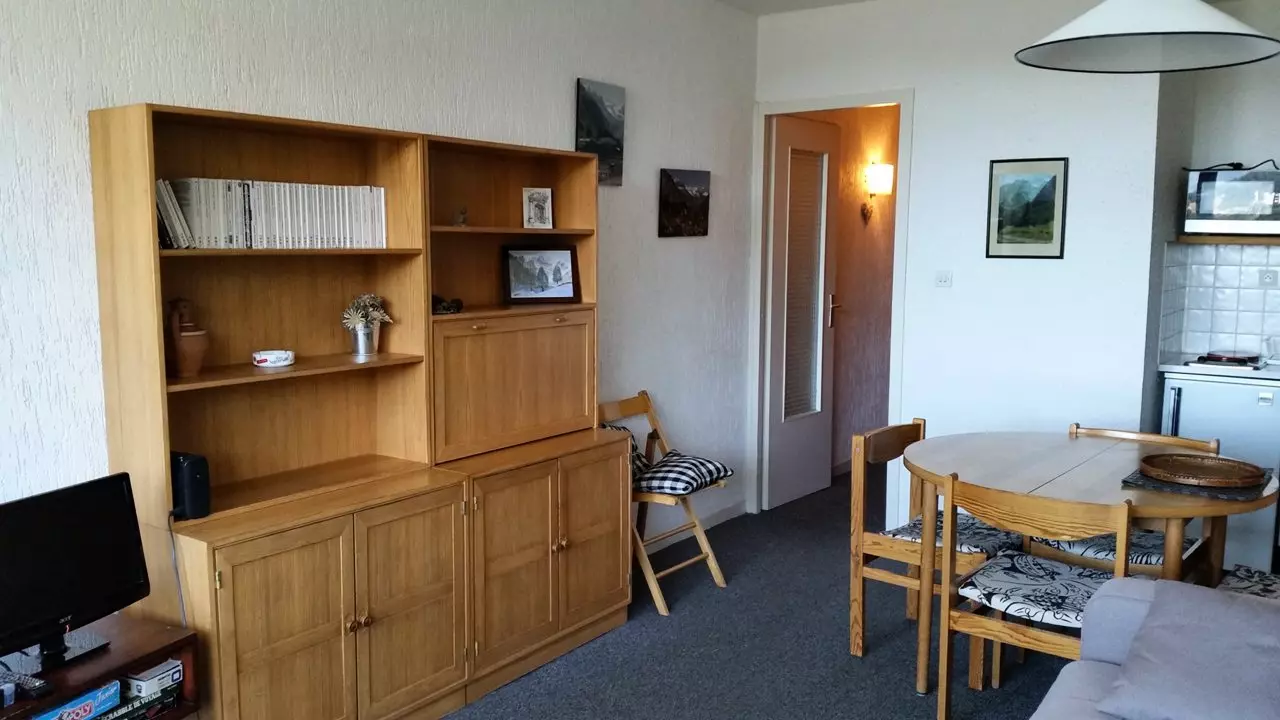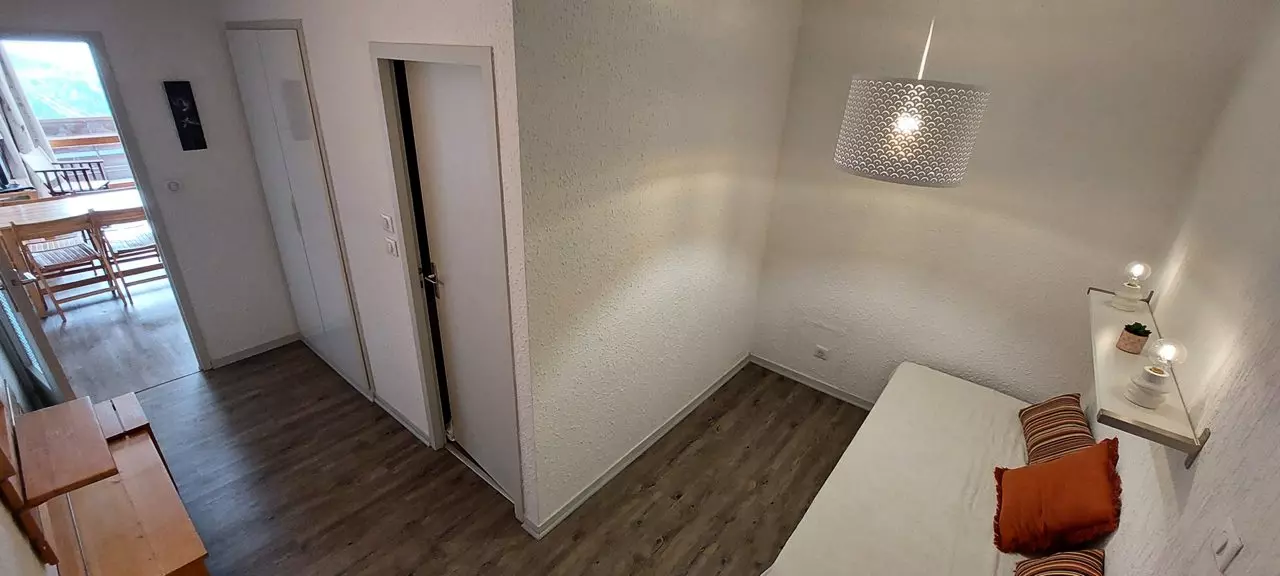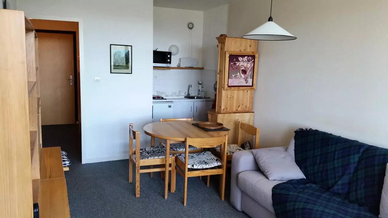 L'appartement est composé d'une entrée avec alcôve comprenant 1 ensemble de lits gigognes, une salle de douche avec wc, un coin cuisine ouvert (entièrement rénové) sur le séjour avec canapé convertible pour 2 personnes et d'un balcon exposé ouest qui vous offrira une vue magnifique sur toute la vallée.