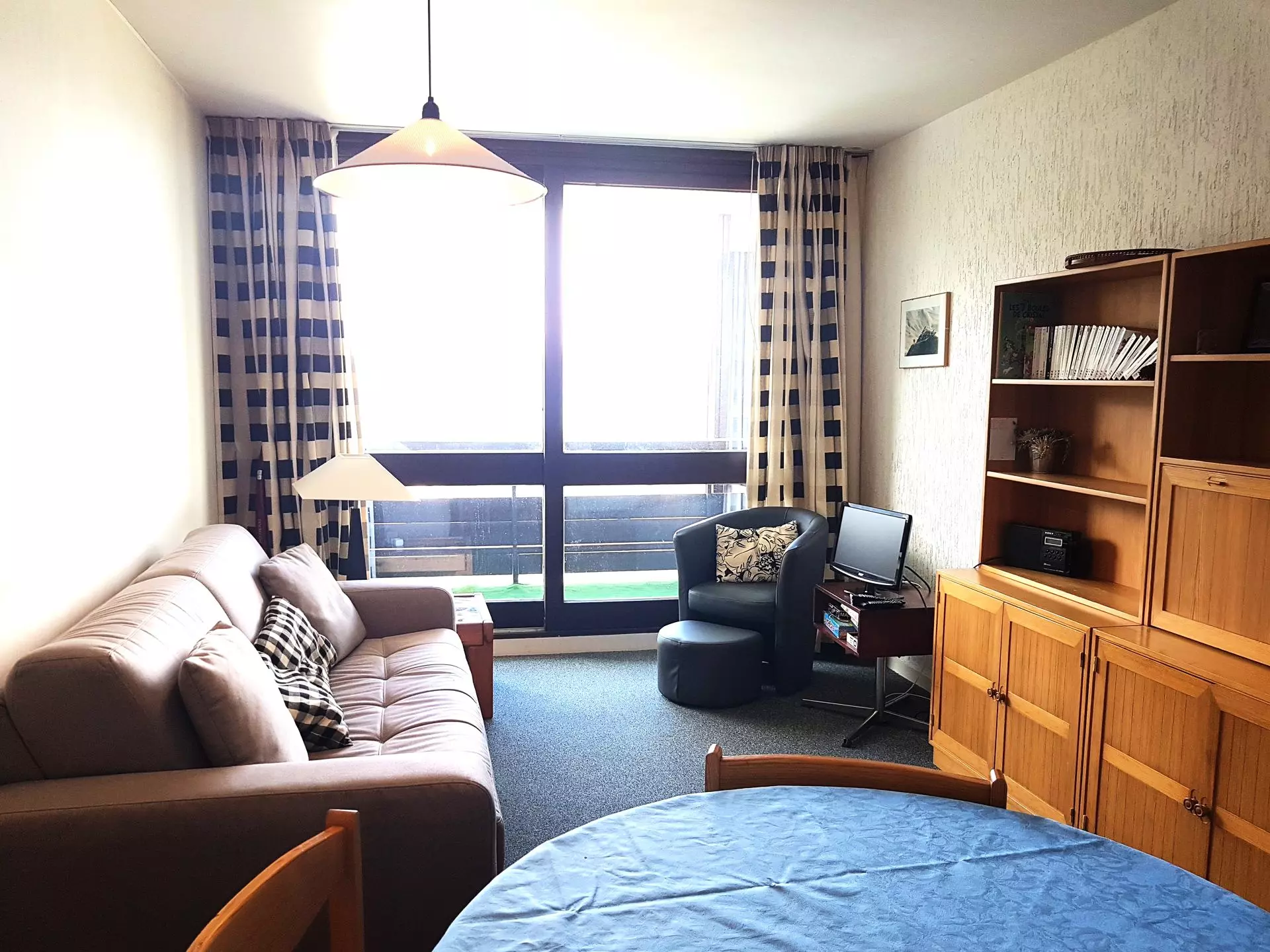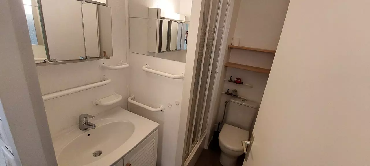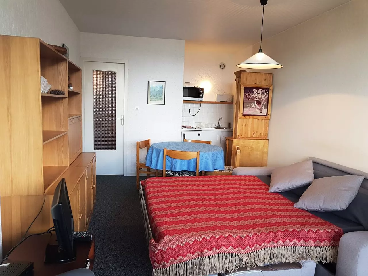 L'appartement est composé d'une entrée avec alcôve comprenant 1 ensemble de lits gigognes, une salle de douche avec wc, un coin cuisine ouvert (entièrement rénové) sur le séjour avec canapé convertible pour 2 personnes et d'un balcon exposé ouest qui vous offrira une vue magnifique sur toute la vallée.