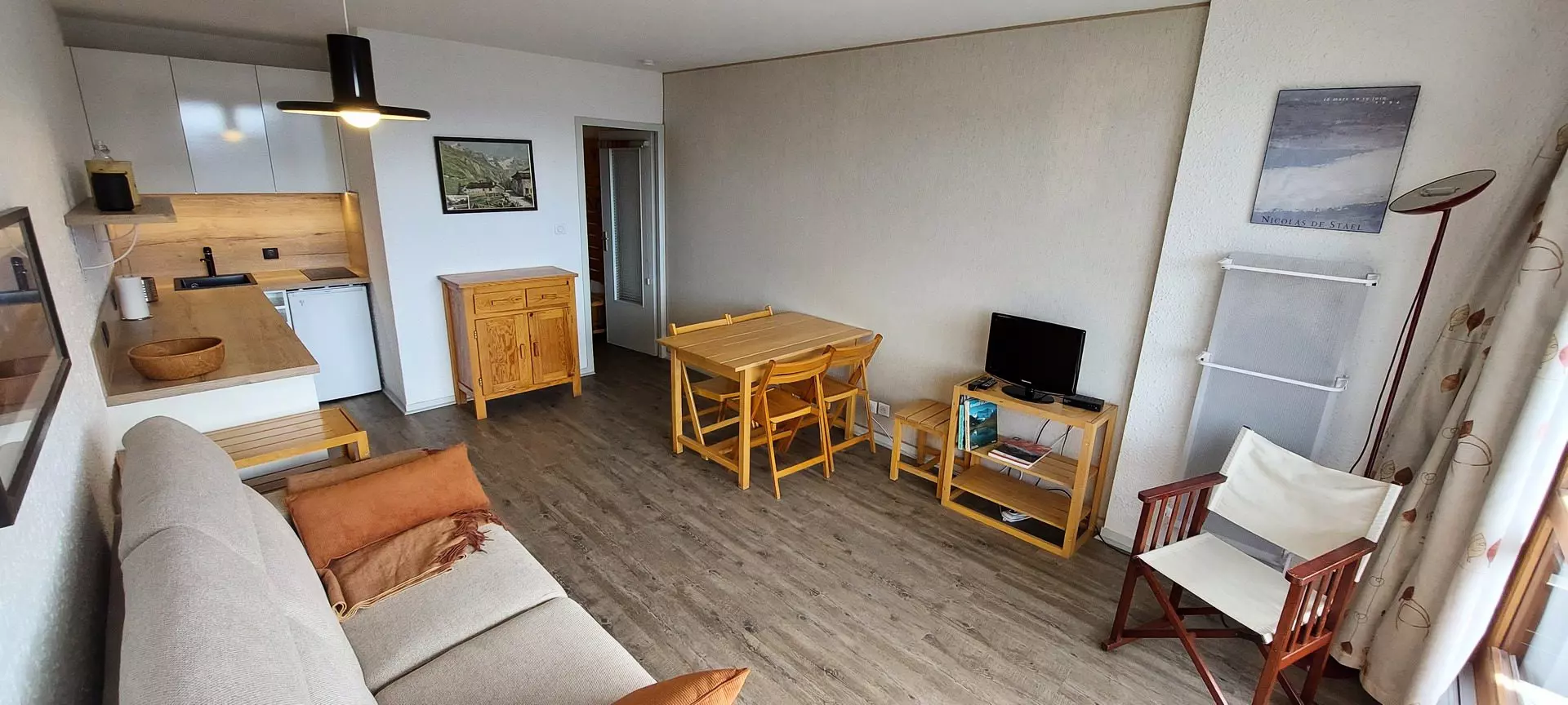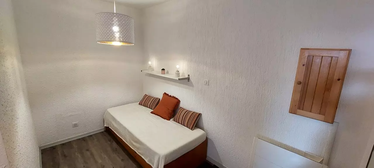 L'appartement est composé d'une entrée avec deux lits superposés, une salle de douche avec wc, un coin cuisine ouvert sur le séjour équipé d'un convertible et d'un balcon exposé ouest qui vous offrira une vue magnifique sur toute la vallée.