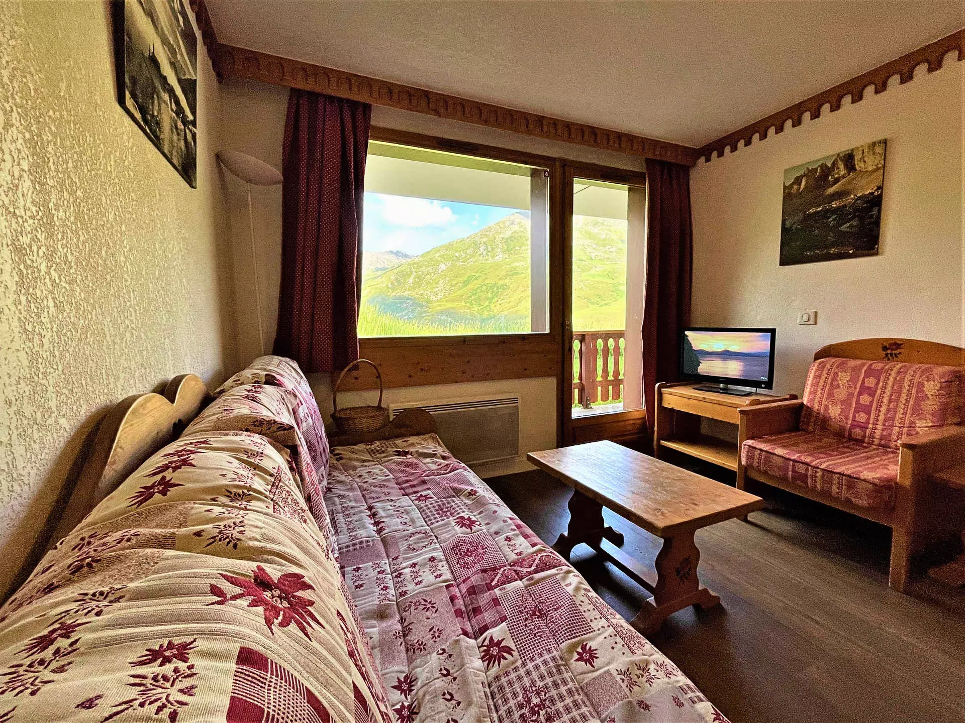 Résidence Les Côtes d'Or (appartement 002) 2 pièces cabine, pour 4/6 personnes, 35 m², RDC côté balcon, étage -3 depuis l'entrée du chalet, par escaliers, balcon exposé Sud-Ouest