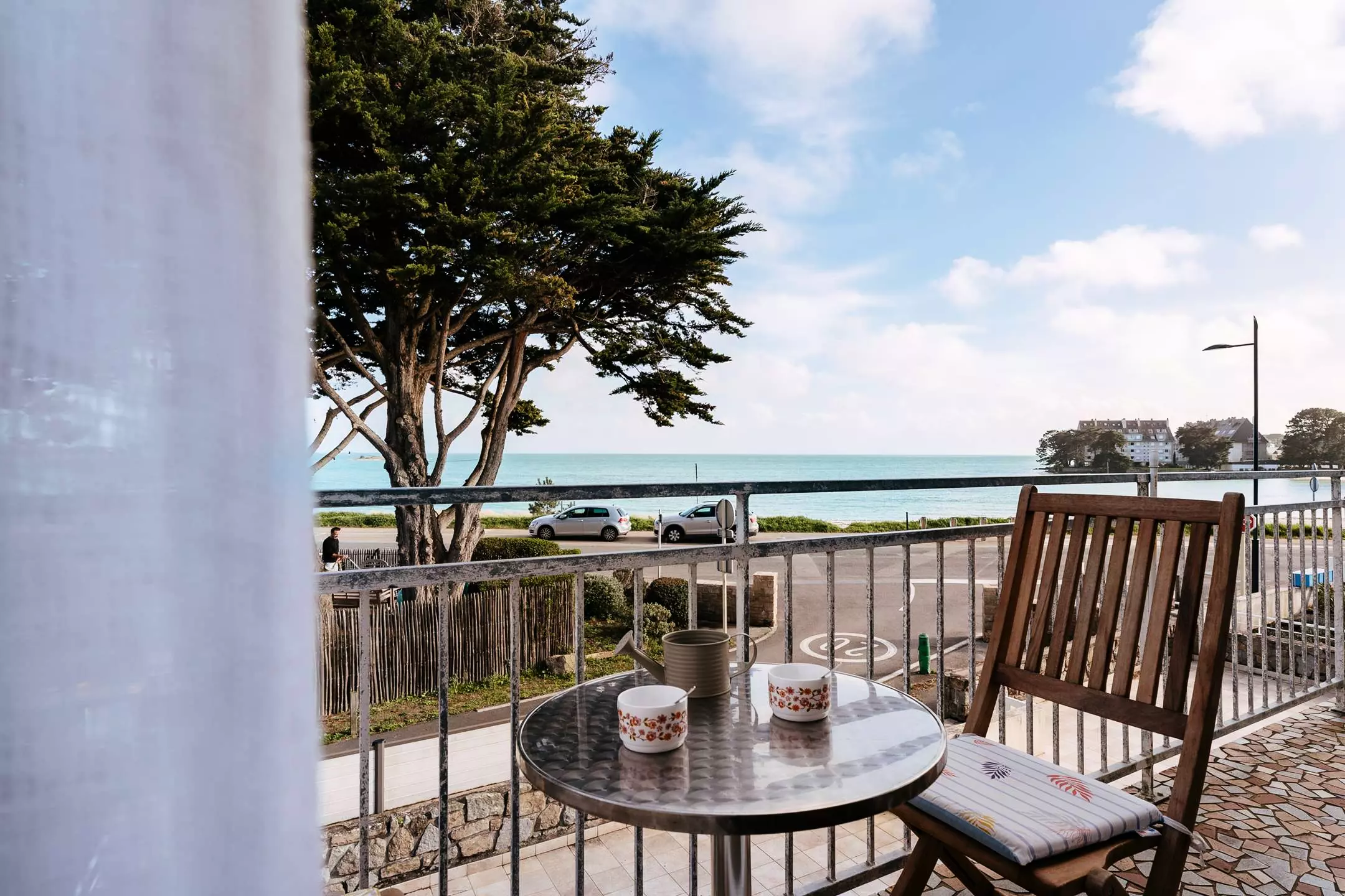 - Entrée directe dans le séjour avec partie repas (table et chaises) et canapé, donnant sur un balcon exposé Sud et avec vue sur la plage du Men Du