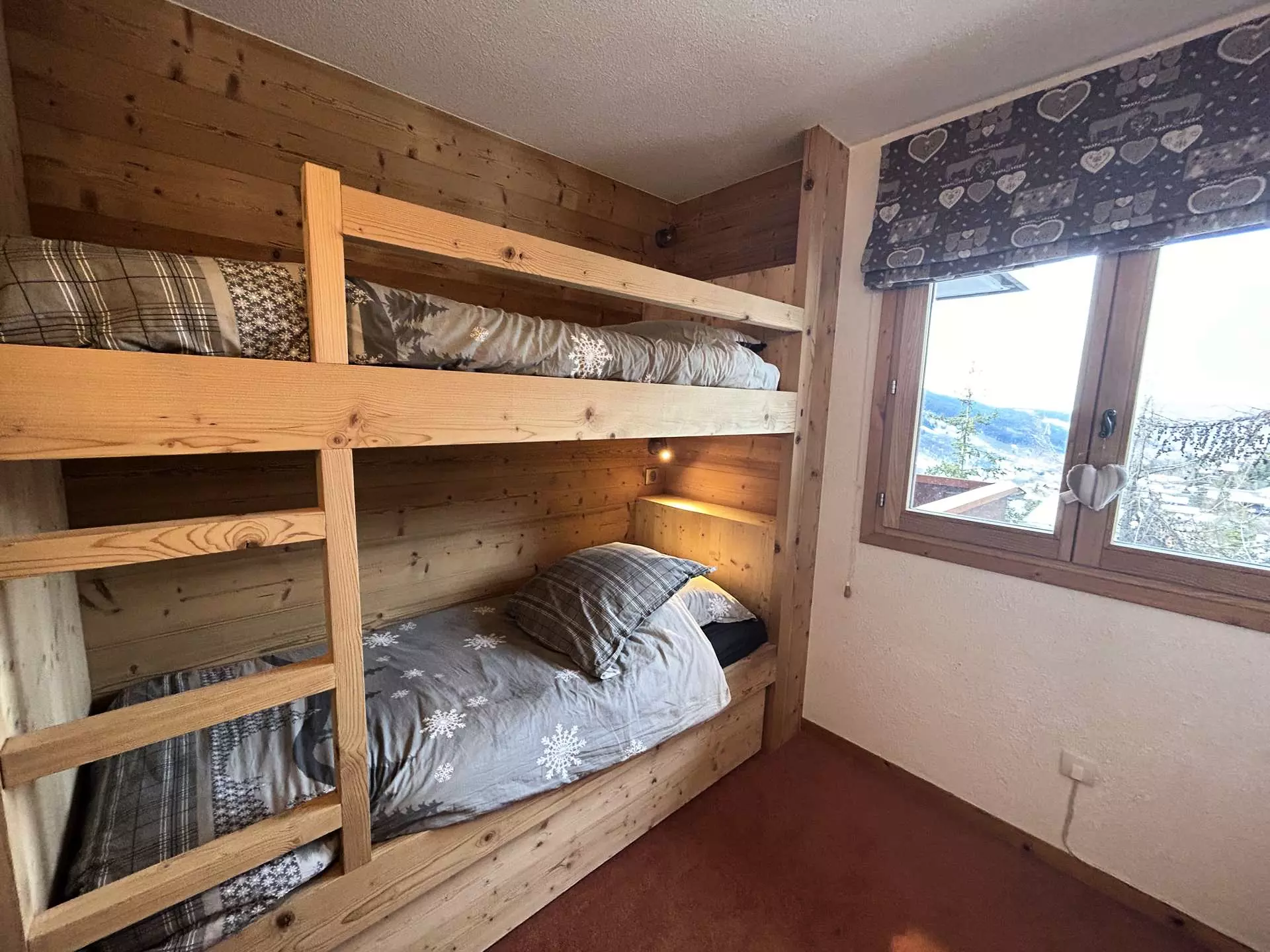 Cet appartement à la montagne situé au sixième étage, avec ascenseur (B) , comprend une cuisine équipée ouverte sur un séjour (balcon sud) avec un ensemble de deux lits gigognes relevables et télévision, une chambre avec lit double (140), une autre chambre avec 1 ensemble de lits superposés, une salle de bain, un WC indépendant et une cabine de douche indépendante. Vous disposez d'un casier à skis et d'une place de parking dans le garage.