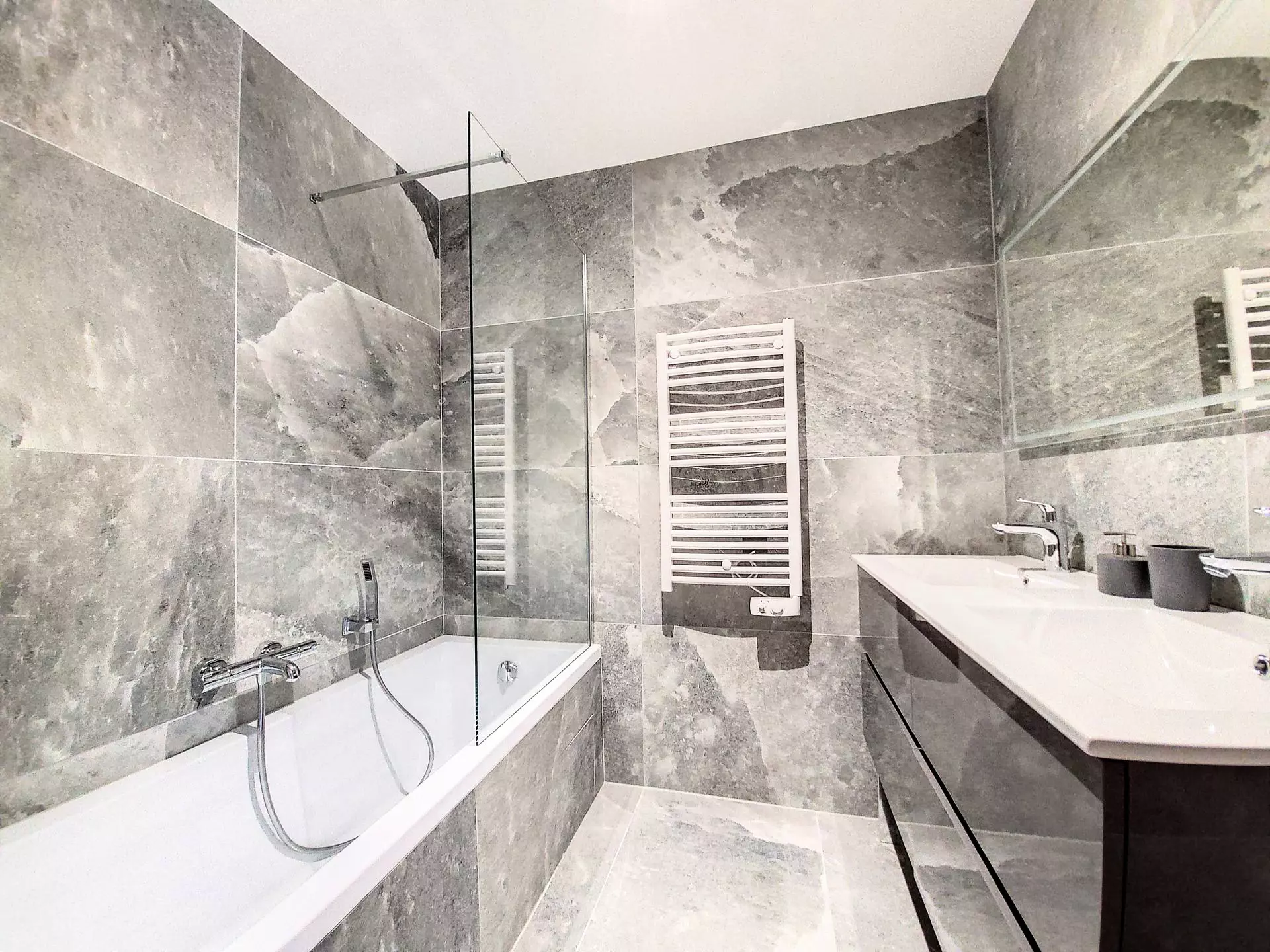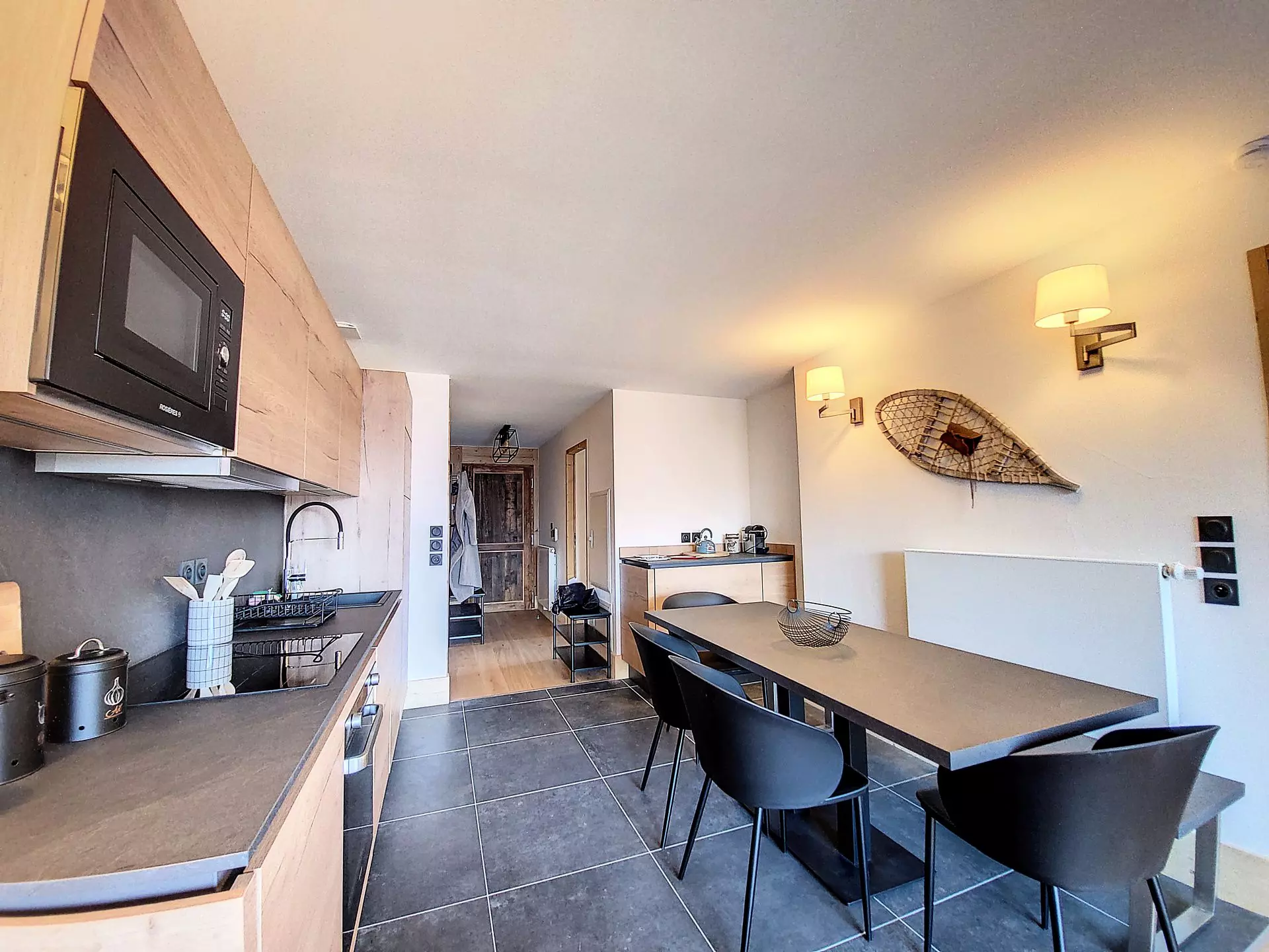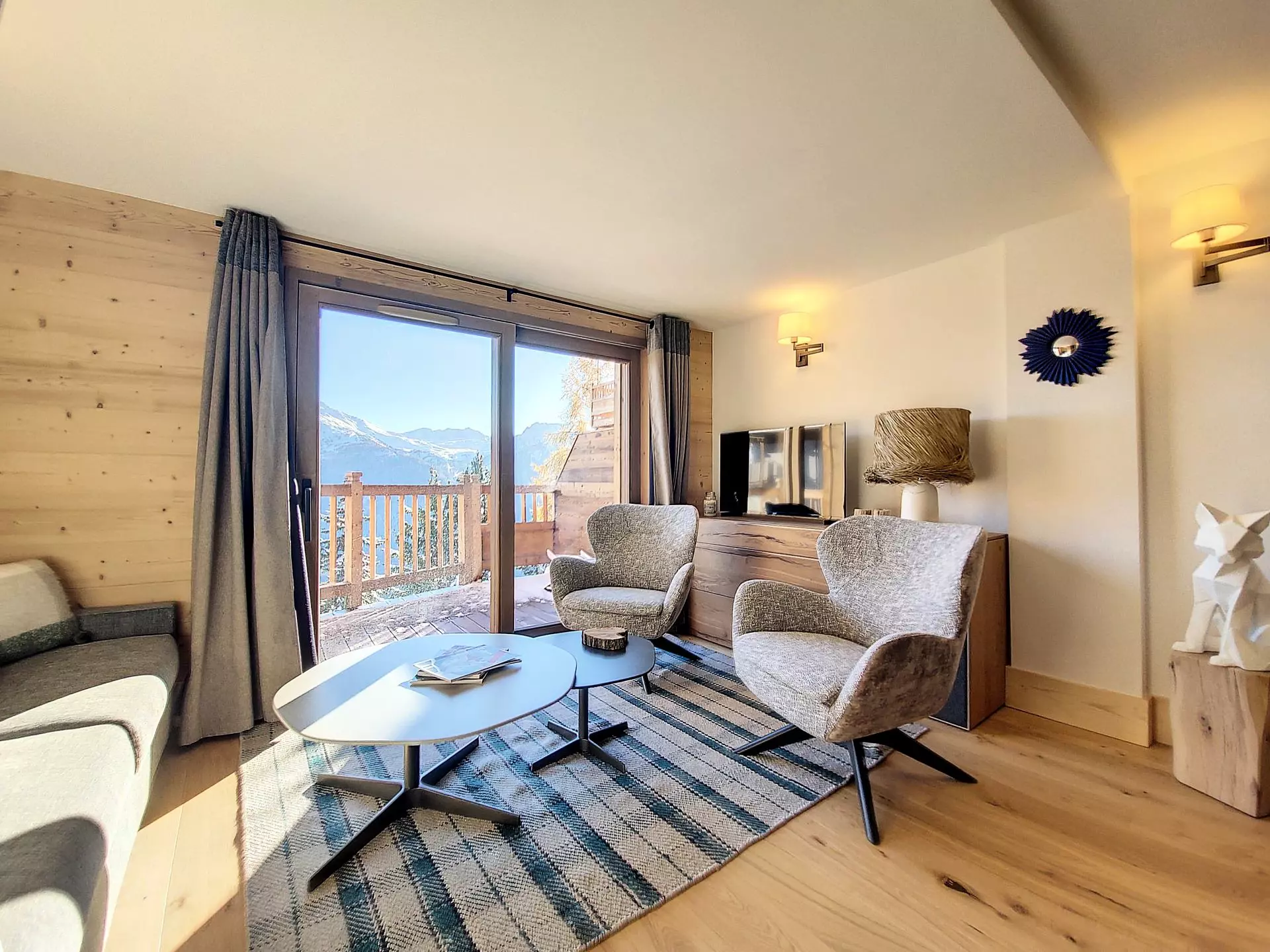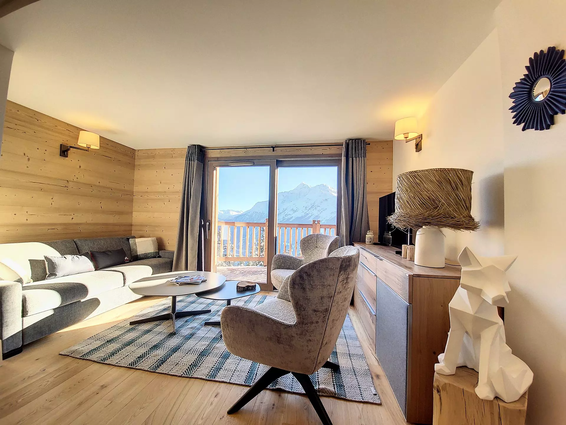 Appartement spacieux de 100 m2 et chaleureux au style alpin contemporain et très cosy. La pièce à vivre vous séduira par sa luminosité et son ouverture sur une terrasse exposée sud face au Mont Pourri.