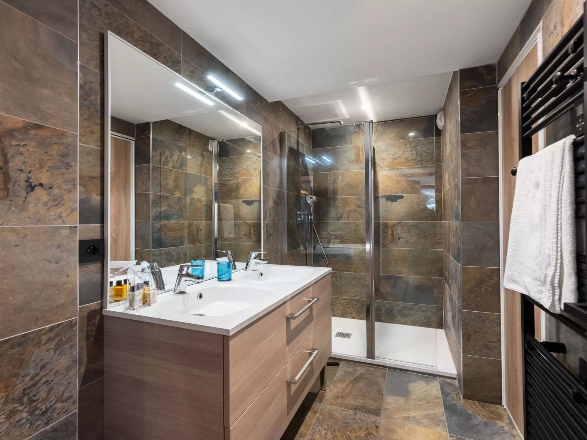- Salle de douche avec doubles vasques, sèche-serviettes, lave-linge séchant