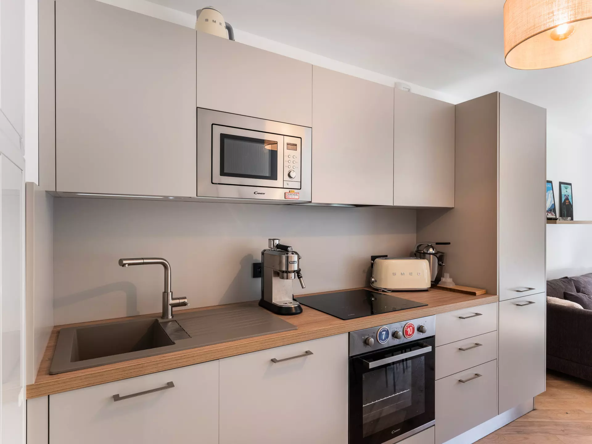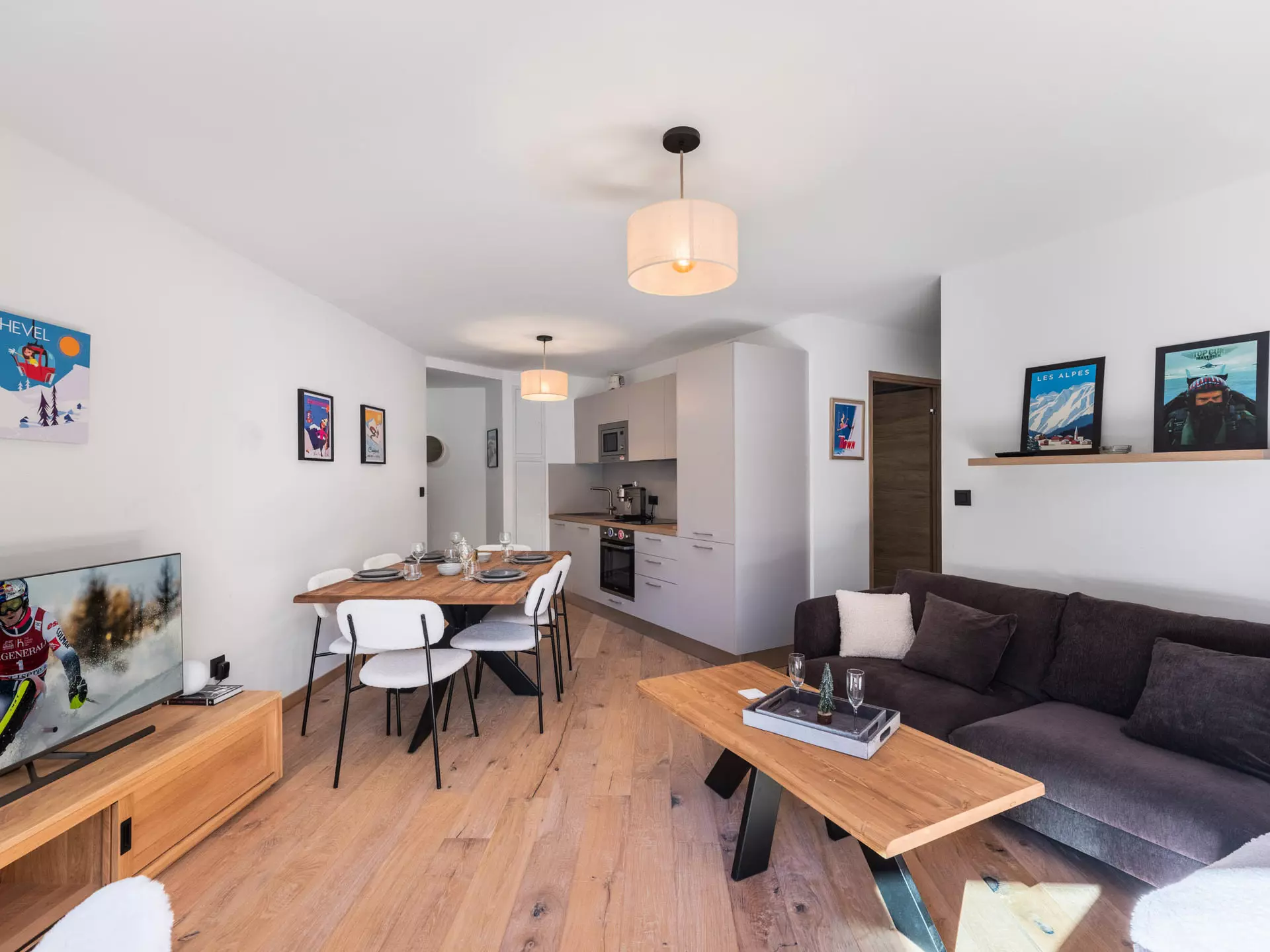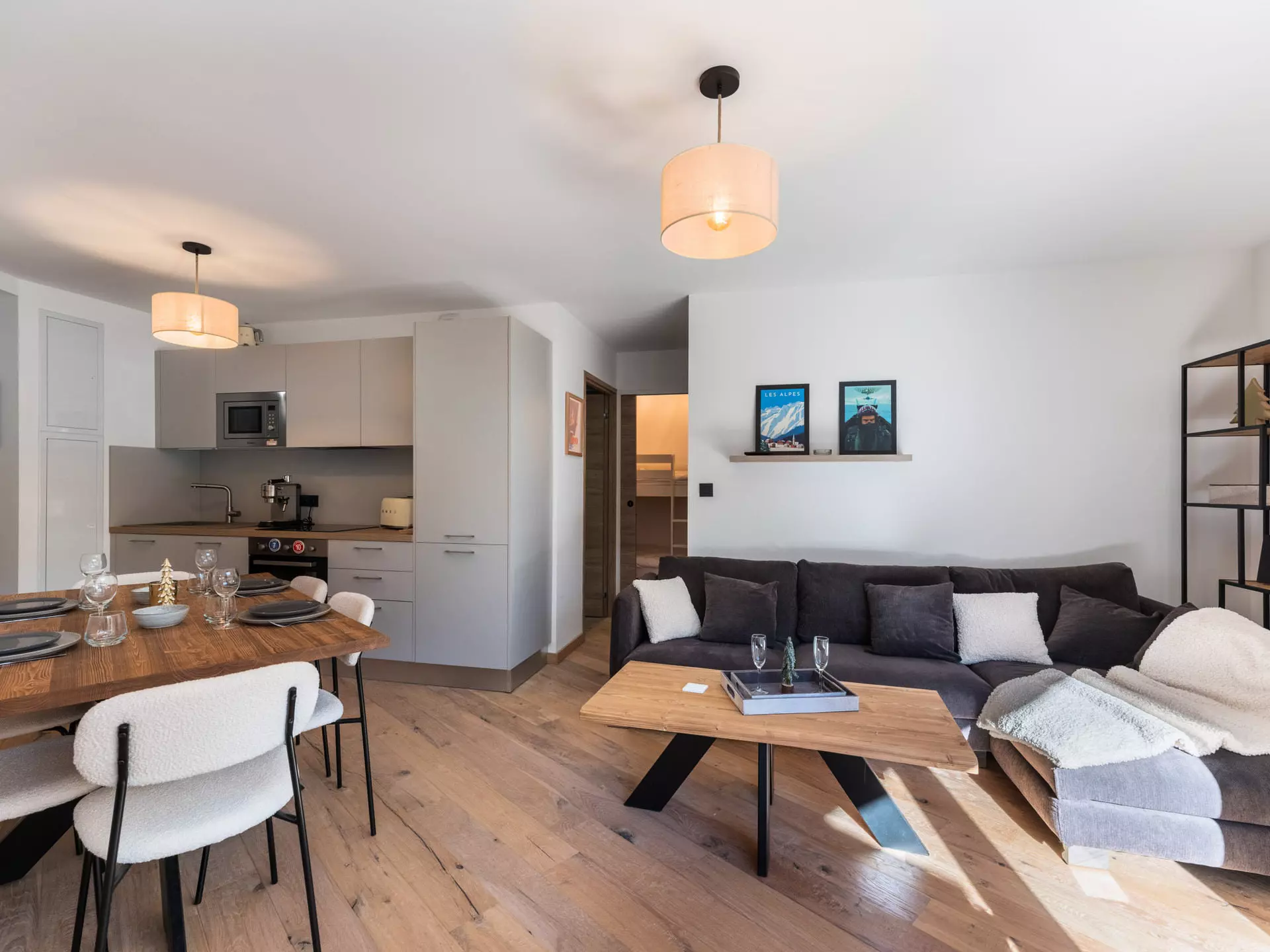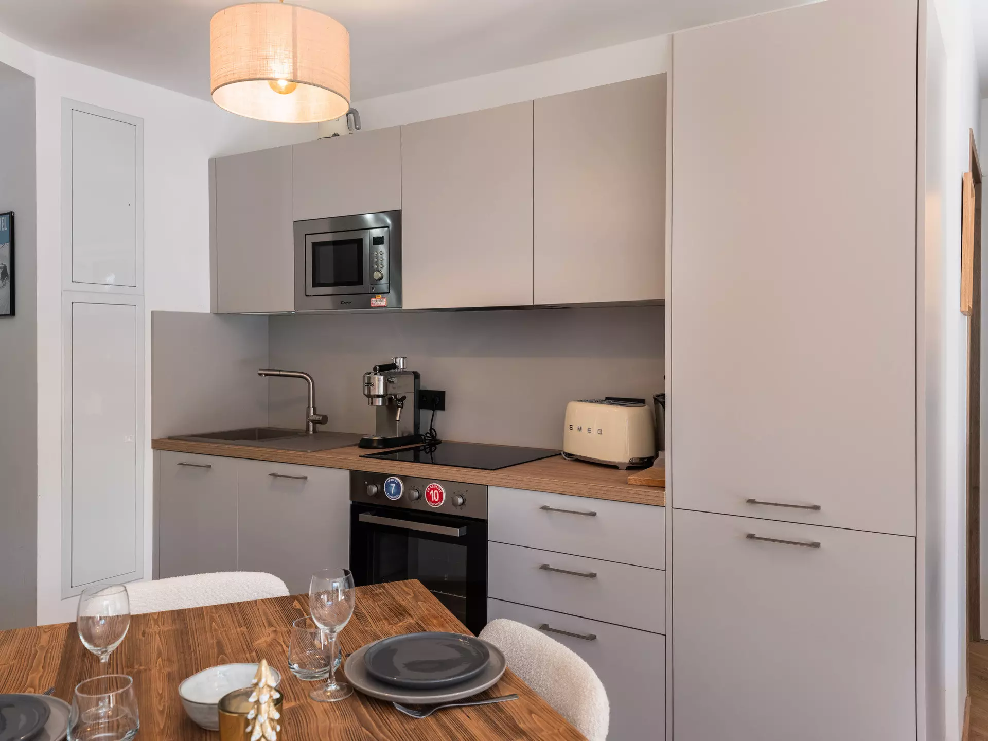 - Table pour les repas et cuisine ouverte équipée (réfrigérateur, lave-vaisselle, plaques à induction, micro-onde, four, grille-pain, Nespresso...)