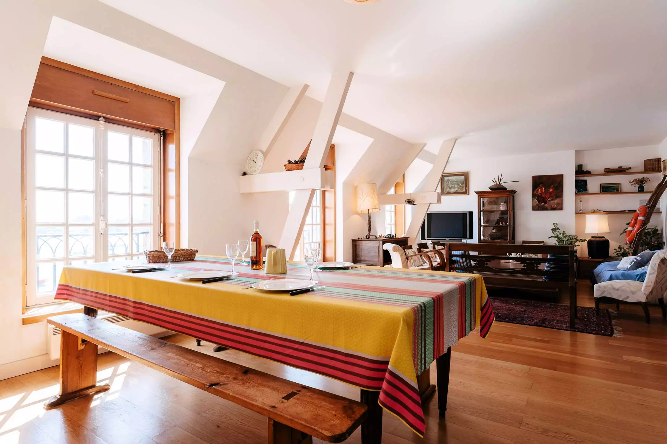- Grand séjour avec vue sur le port avec partie repas (table et bancs) et partie salon (fauteuils, TV)