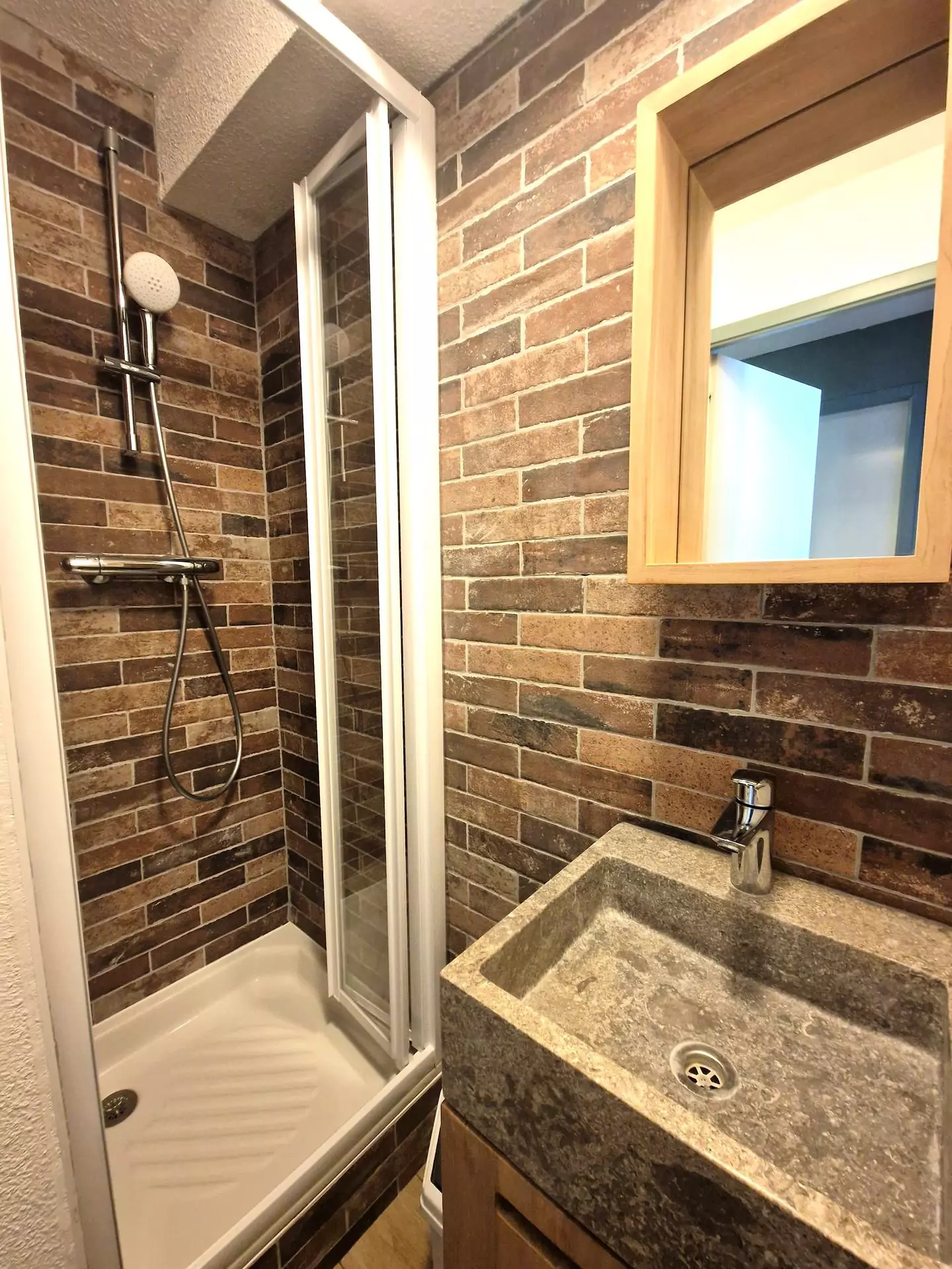 - 1 salle d'eau avec douche, lavabo et sèche-serviettes.