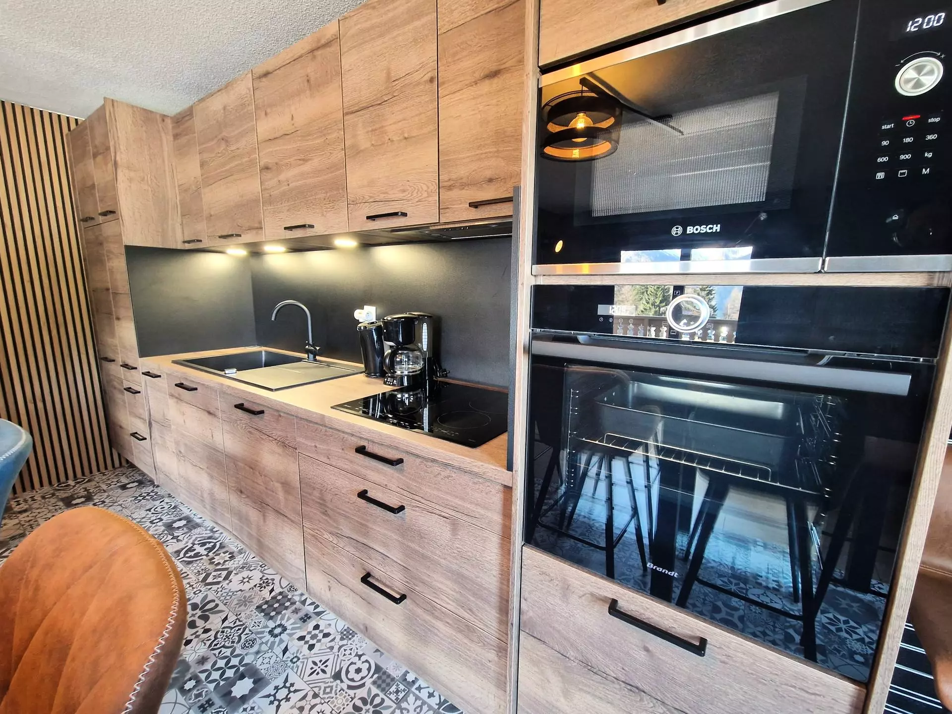 - Coin cuisine avec 4 plaques chauffantes, réfrigérateur, four, micro-ondes, lave-vaisselle et nombreux placards de rangement.