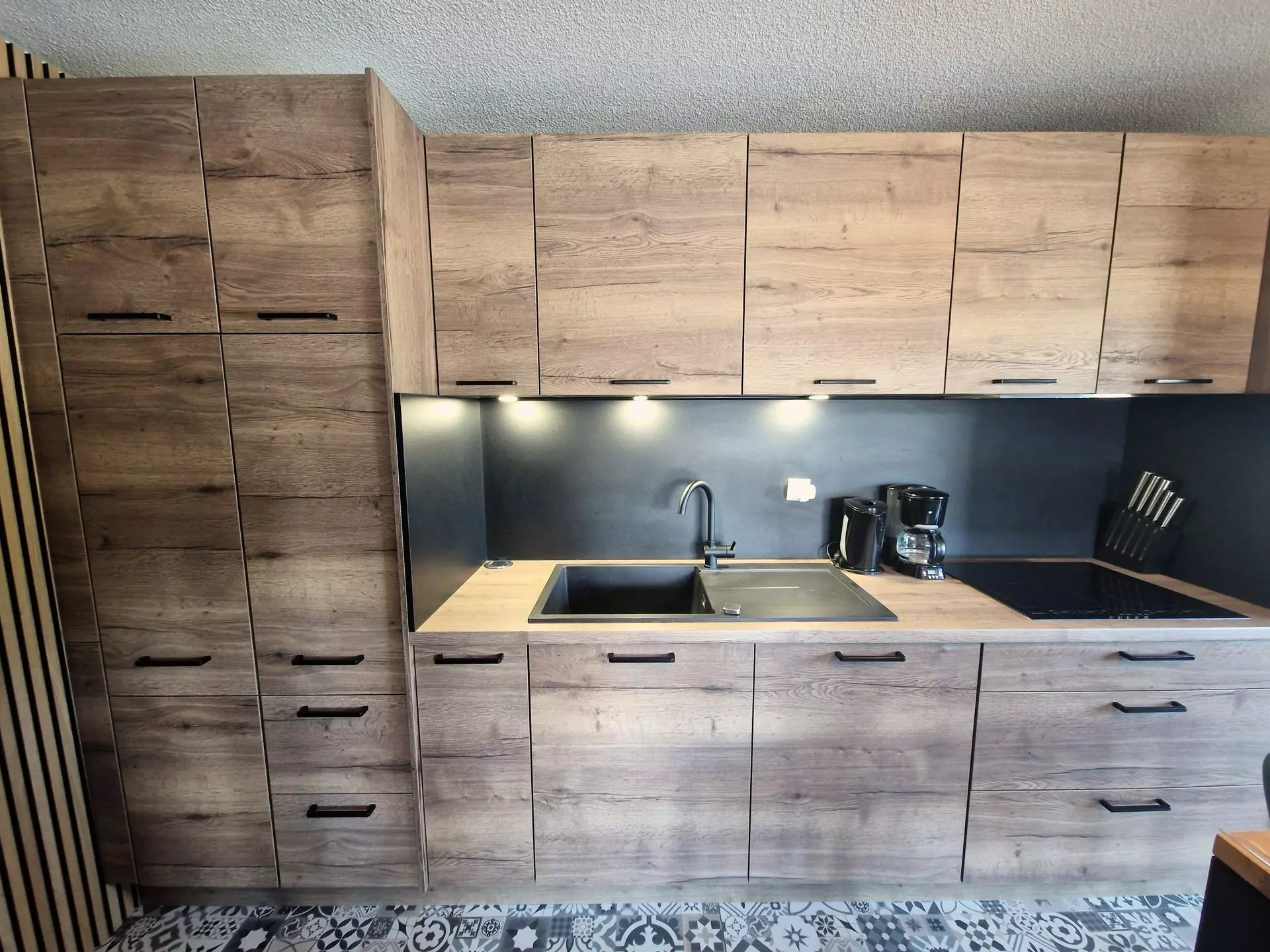 - Coin cuisine avec 3 plaques induction, réfrigérateur + congélateur, four, micro-ondes, lave-vaisselle
