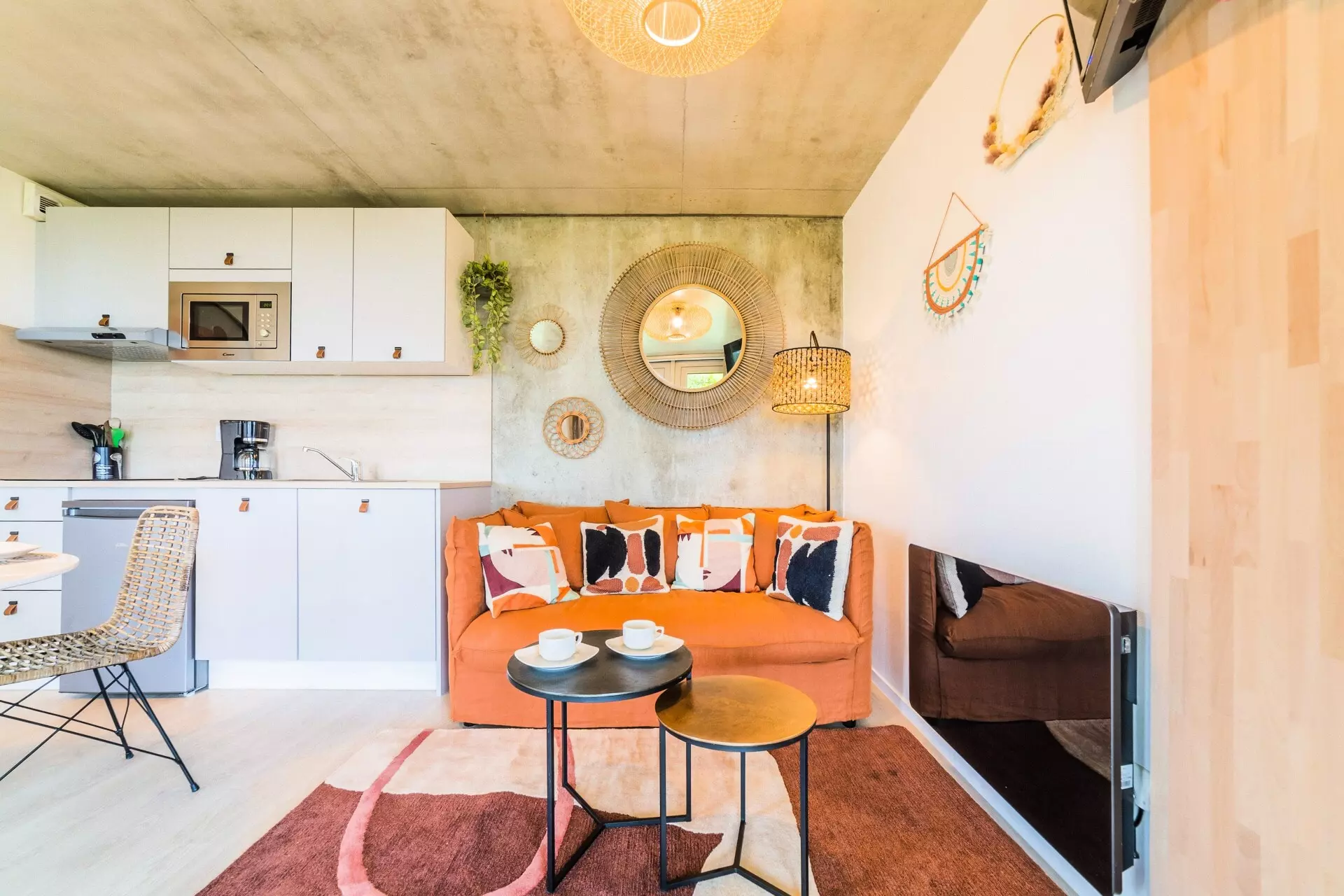 L'équipement comprend une cuisine équipée avec réfrigérateur, lave-vaisselle, plaques de cuisson, mini-four, micro-ondes, cafetière, une télévision dans le salon, la Wifi, le chauffage, un salon de jardin à l'extérieur avec des chaises longues