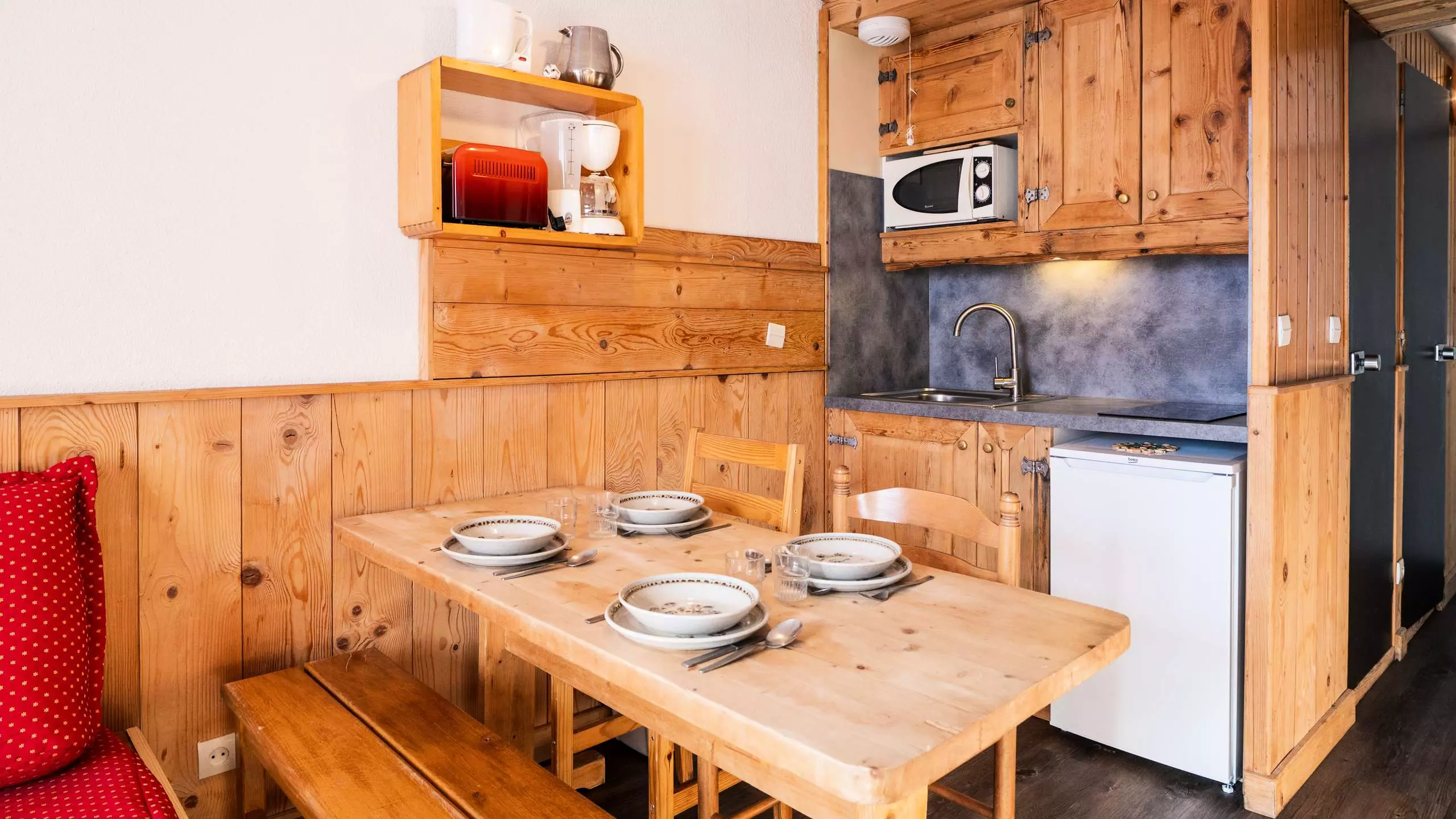 - Kitchenette toute équipée pour 4 personnes avec 2 plaques vitrocéramiques, micro-ondes, réfrigérateur, cafetière filtre électrique et bouilloire.