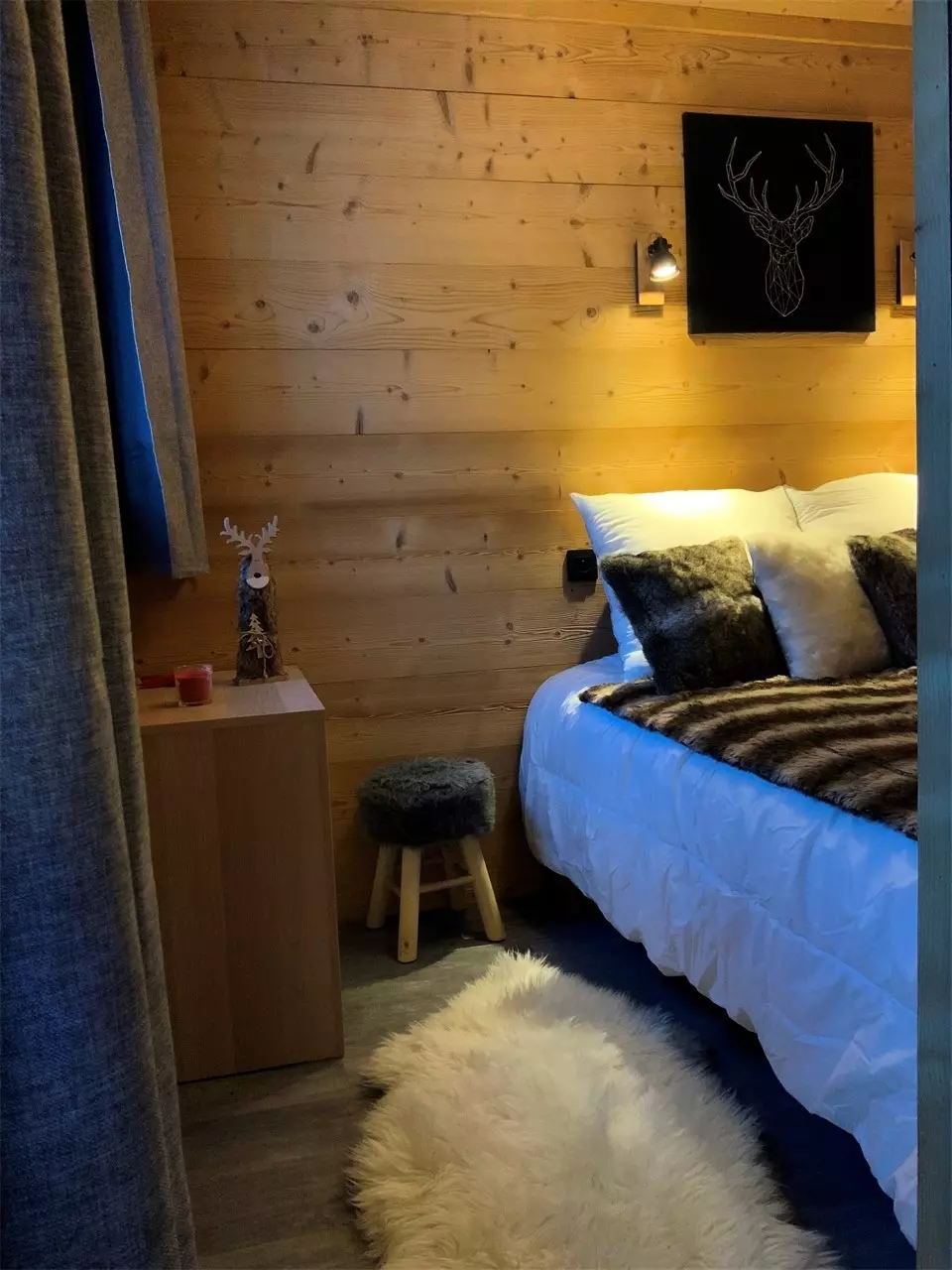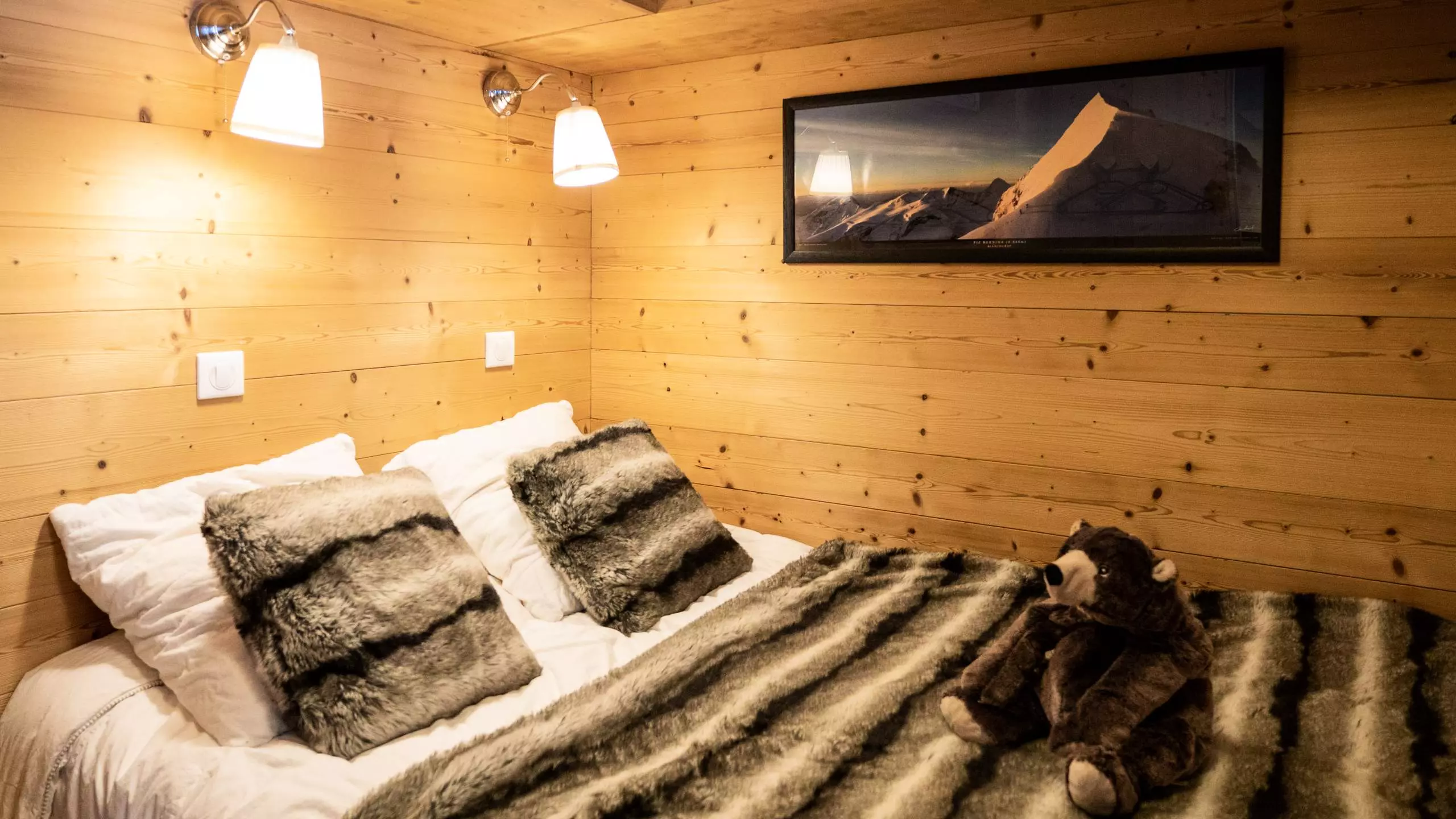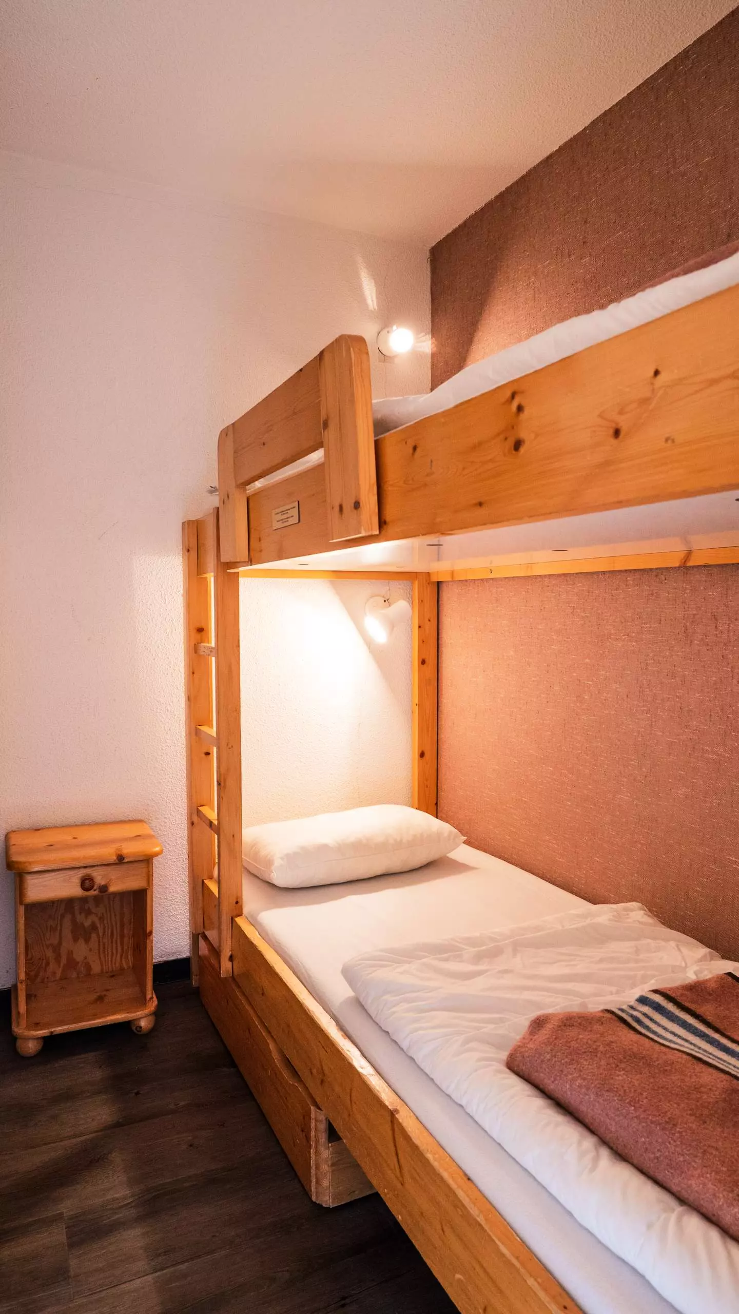 - Une chambre avec un lit double (120 cm) et une TV ainsi qu'une chambre cabine avec des lits superposés. Tous les lits sont équipés de couettes et d'oreillers.