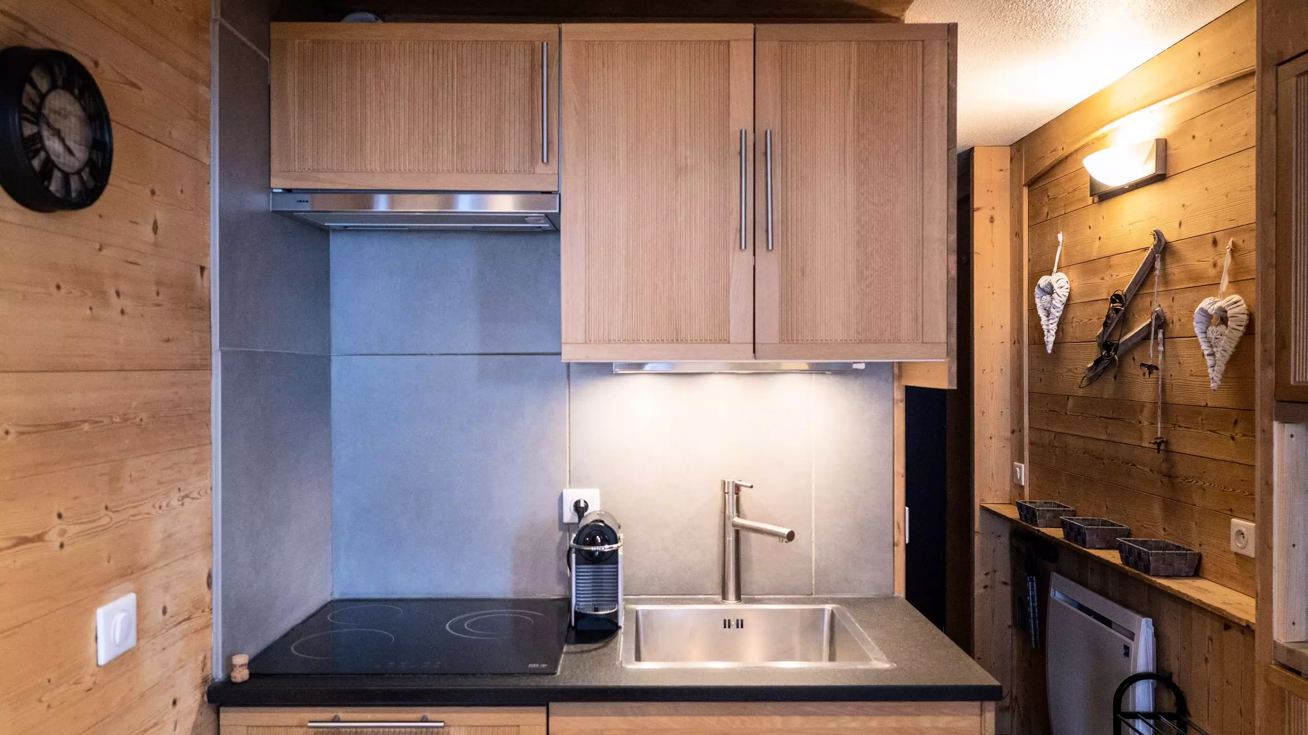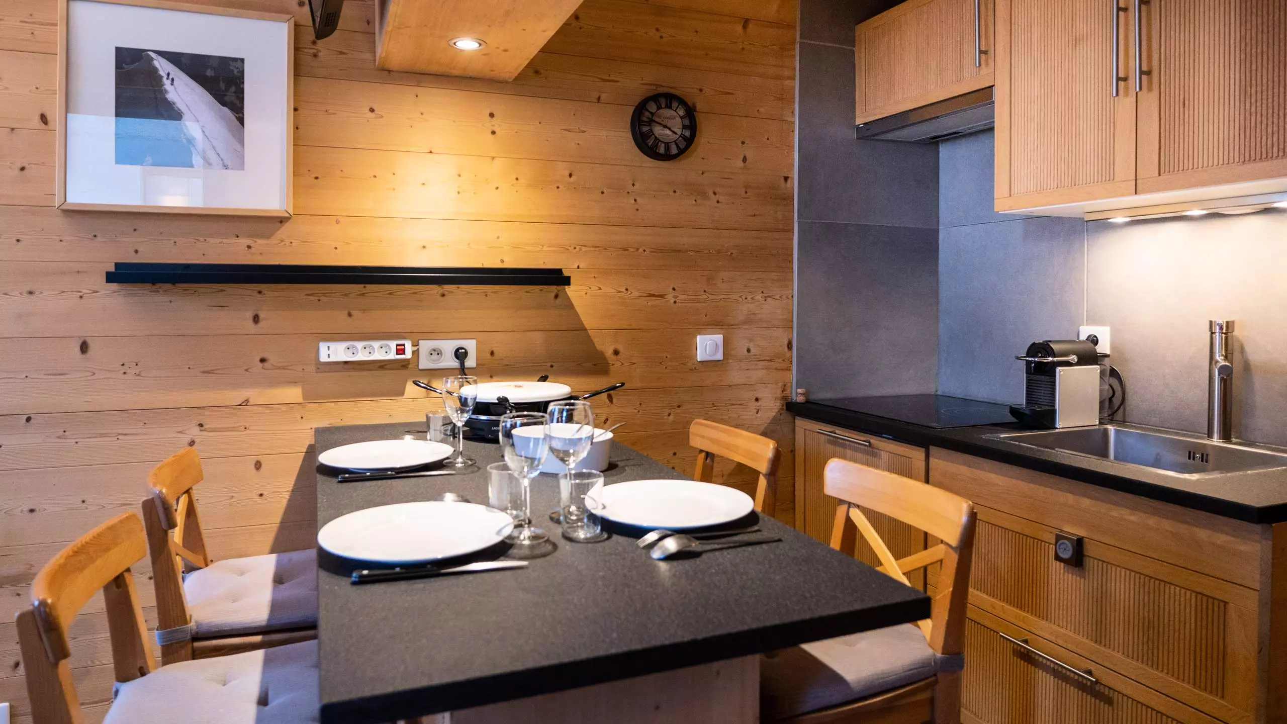 - Kitchenette toute équipée pour 4 personnes avec plaques à induction, lave-vaisselle, micro-ondes, mini-four, réfrigérateur, cafetière, cafetière Nespresso, grille-pain et bouilloire.