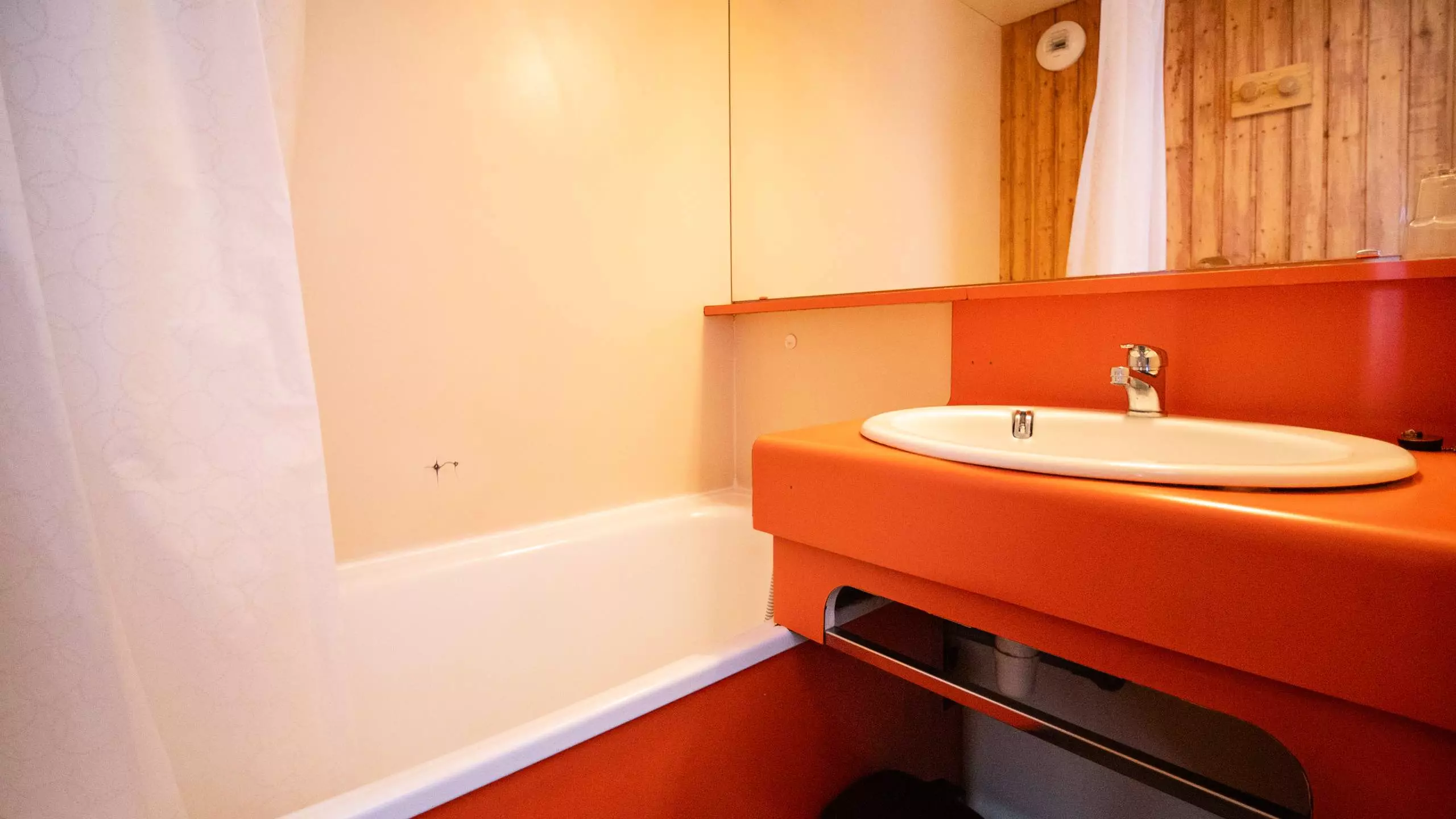 - 1 chambre avec lit double et 1 cabine avec lits superposés chacune fermée par une porte coulissante. Lits équipés de couettes.