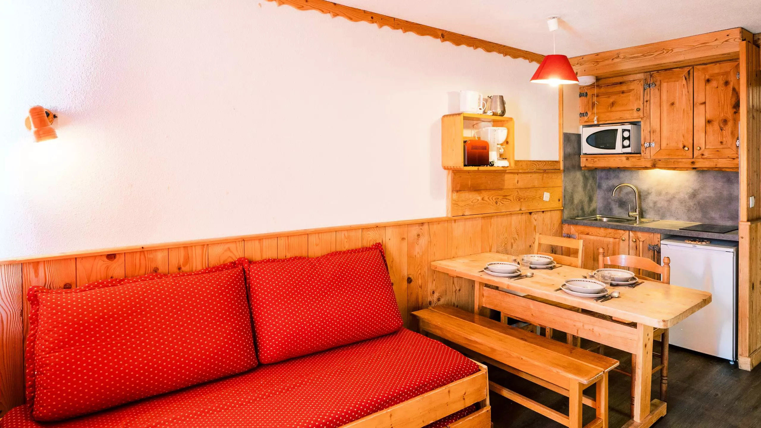 - Séjour équipé d'une banquette et d'un coin repas pour 4 personnes.