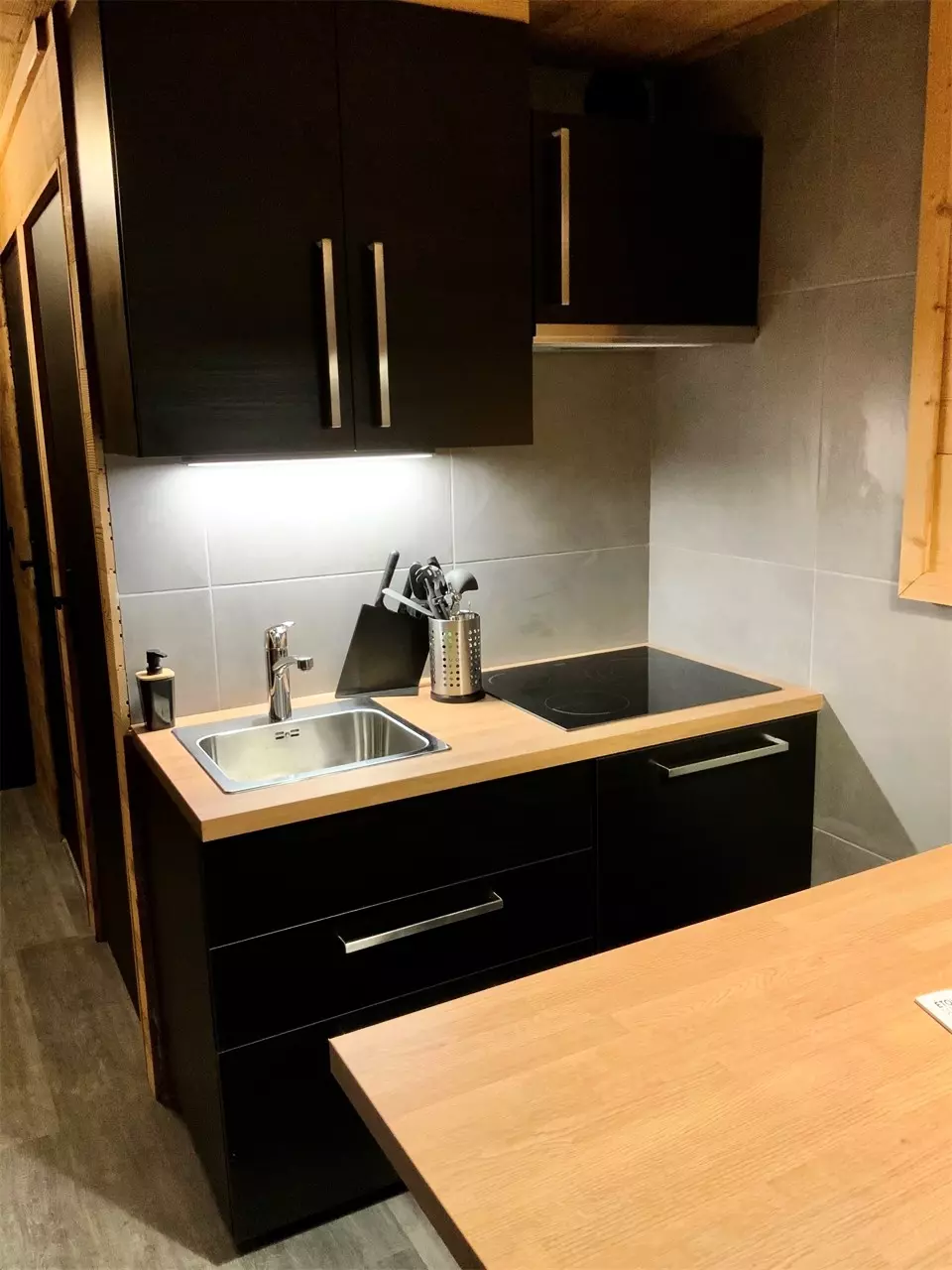 - Kitchenette toute équipée pour 4 personnes avec deux plaques de cuisson à induction, lave-vaisselle, micro-ondes, réfrigérateur, cafetière filtre, cafetière Senseo et bouilloire.